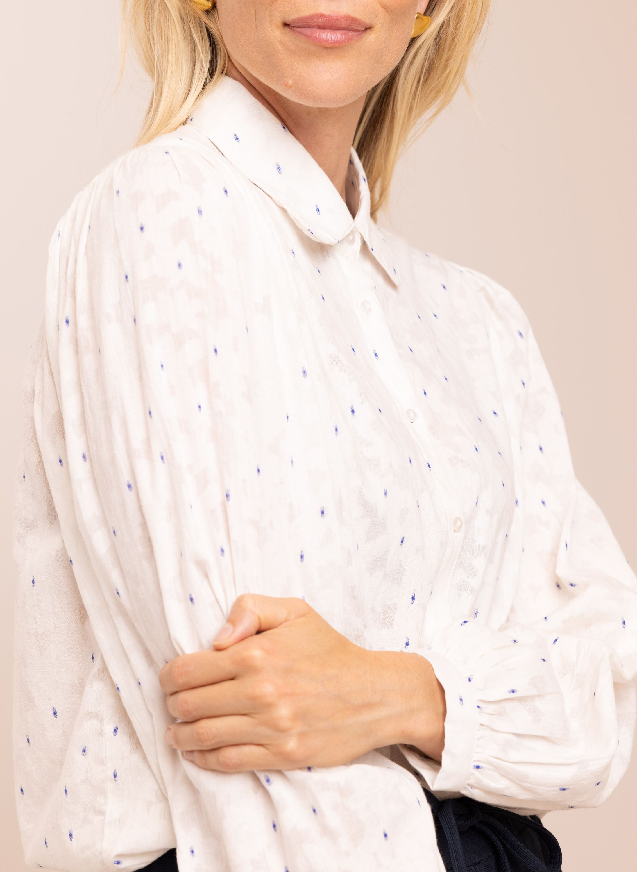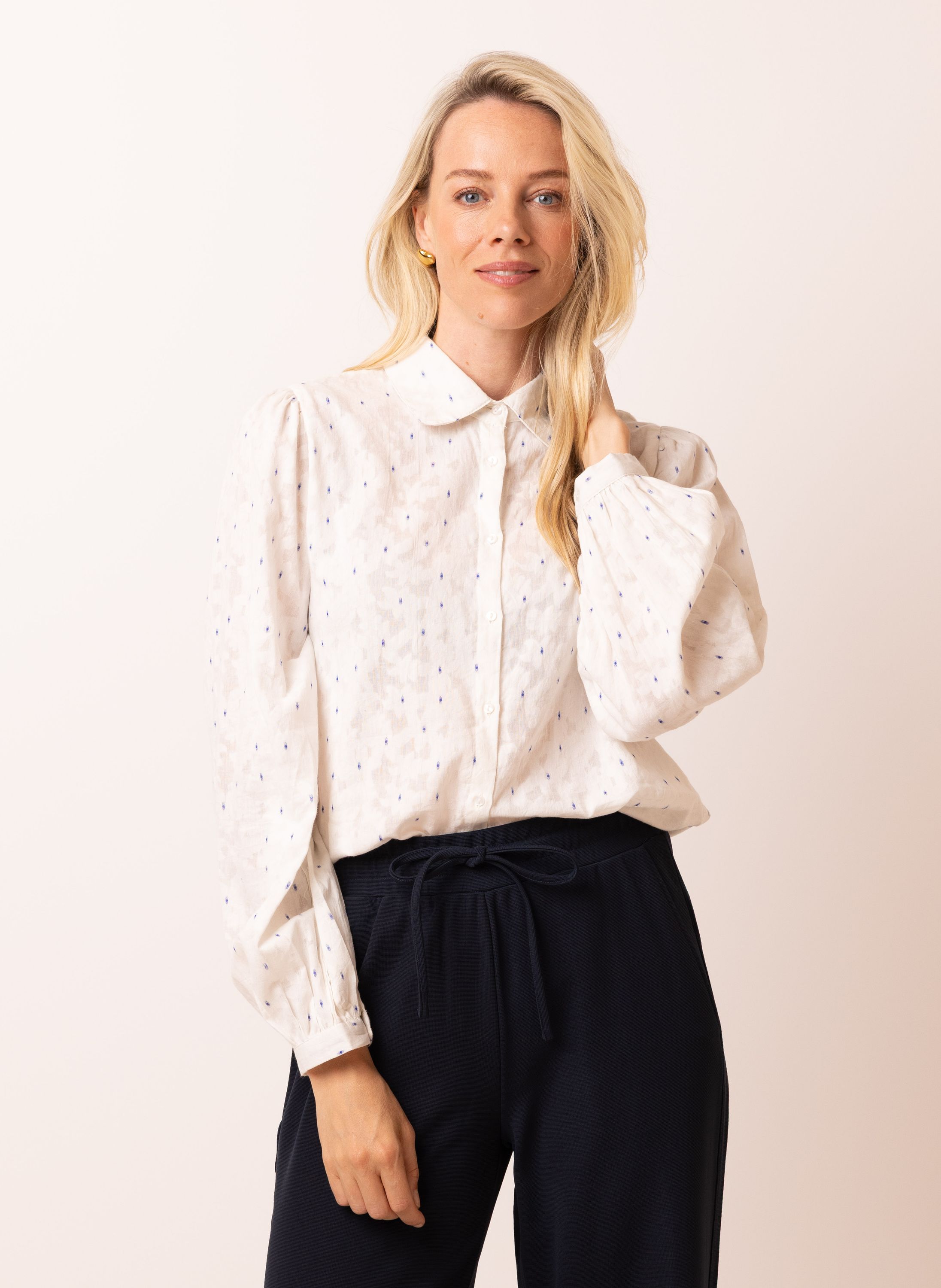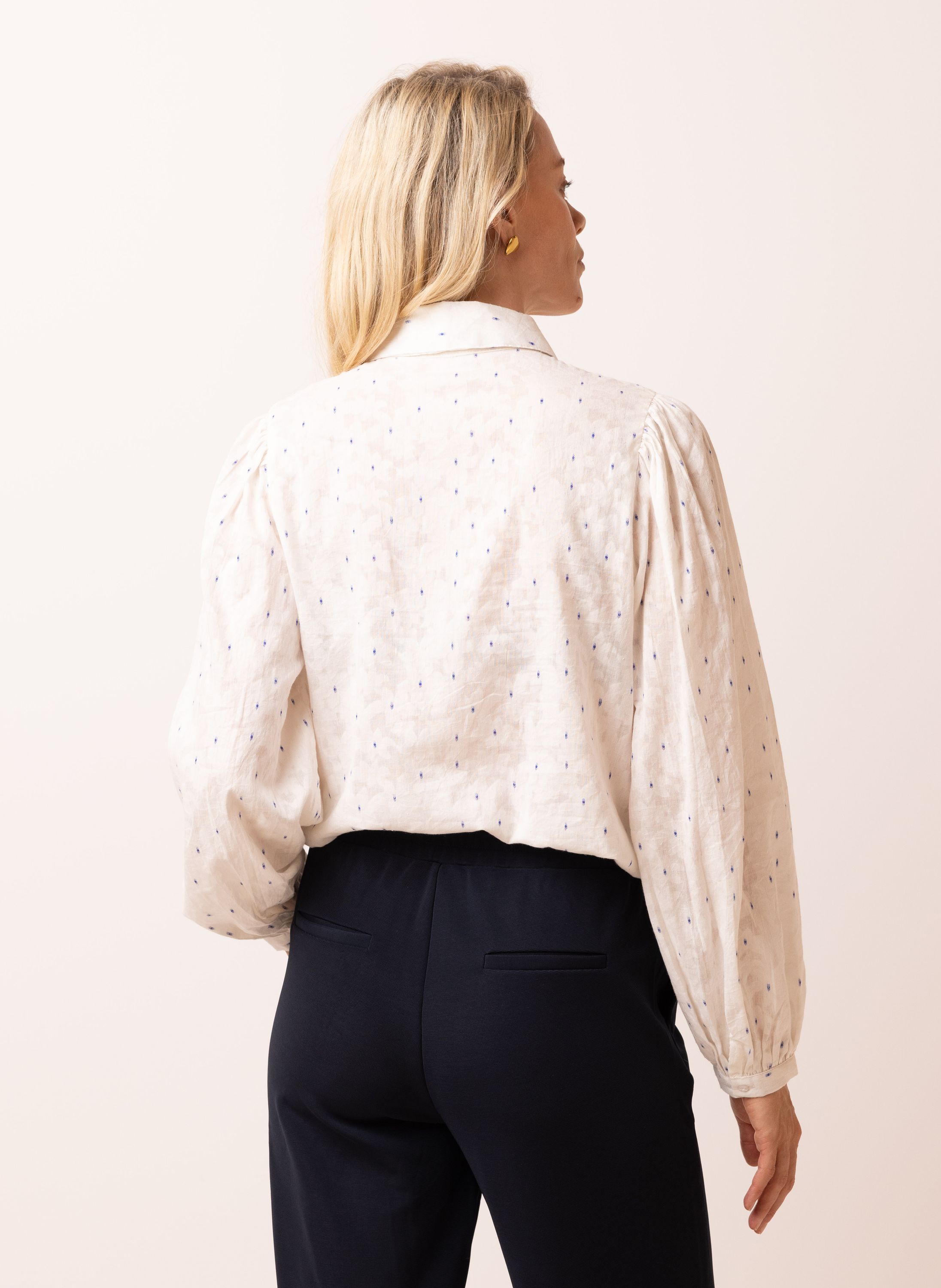 Deze blouse met klassieke kraag, knoopsluiting en lange mouwen is gemaakt van stof met subtiele bloemenprint. Controleer de winkelvoorraad om de beschikbaarheid in een winkel bij jou in de buurt te bekijken.