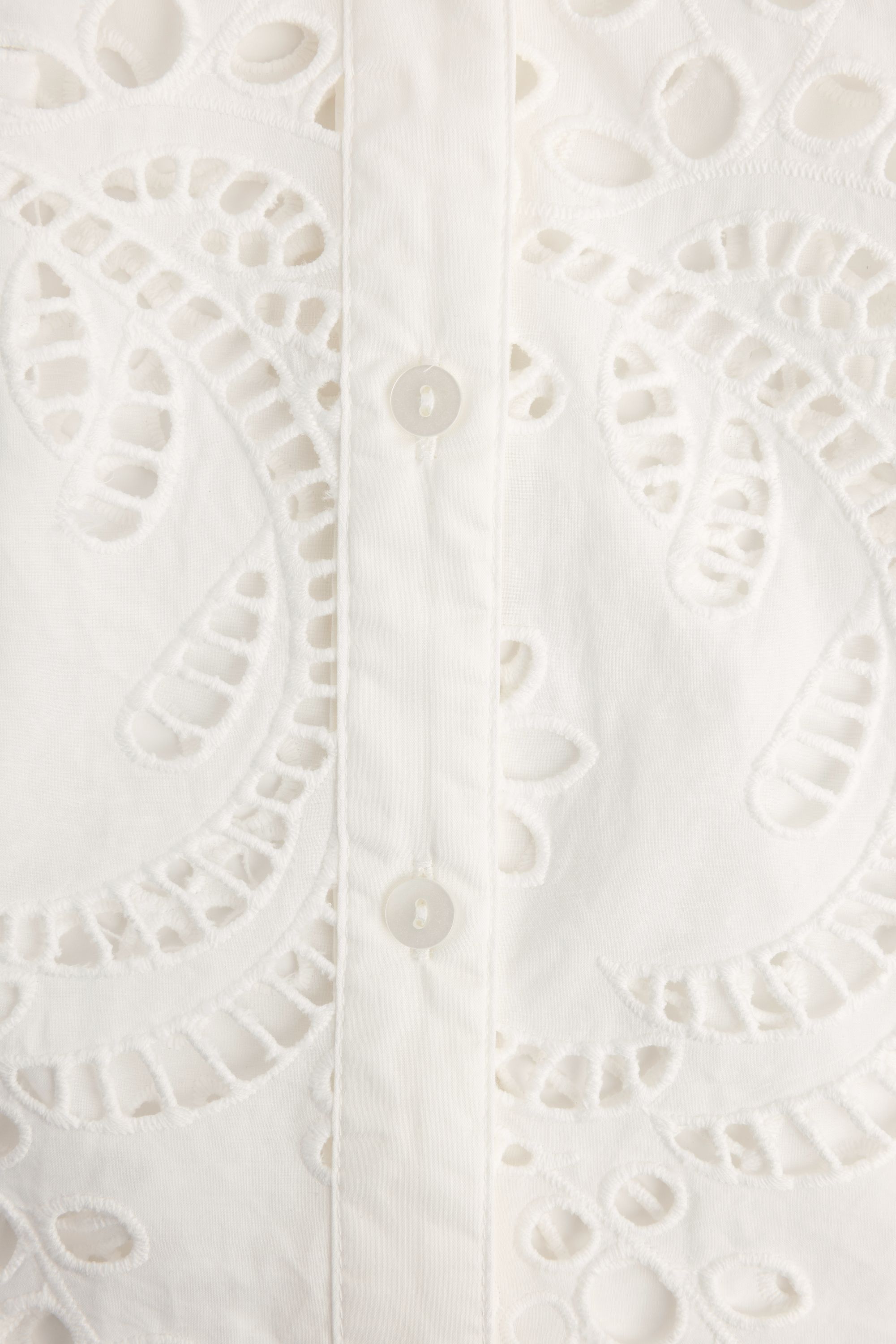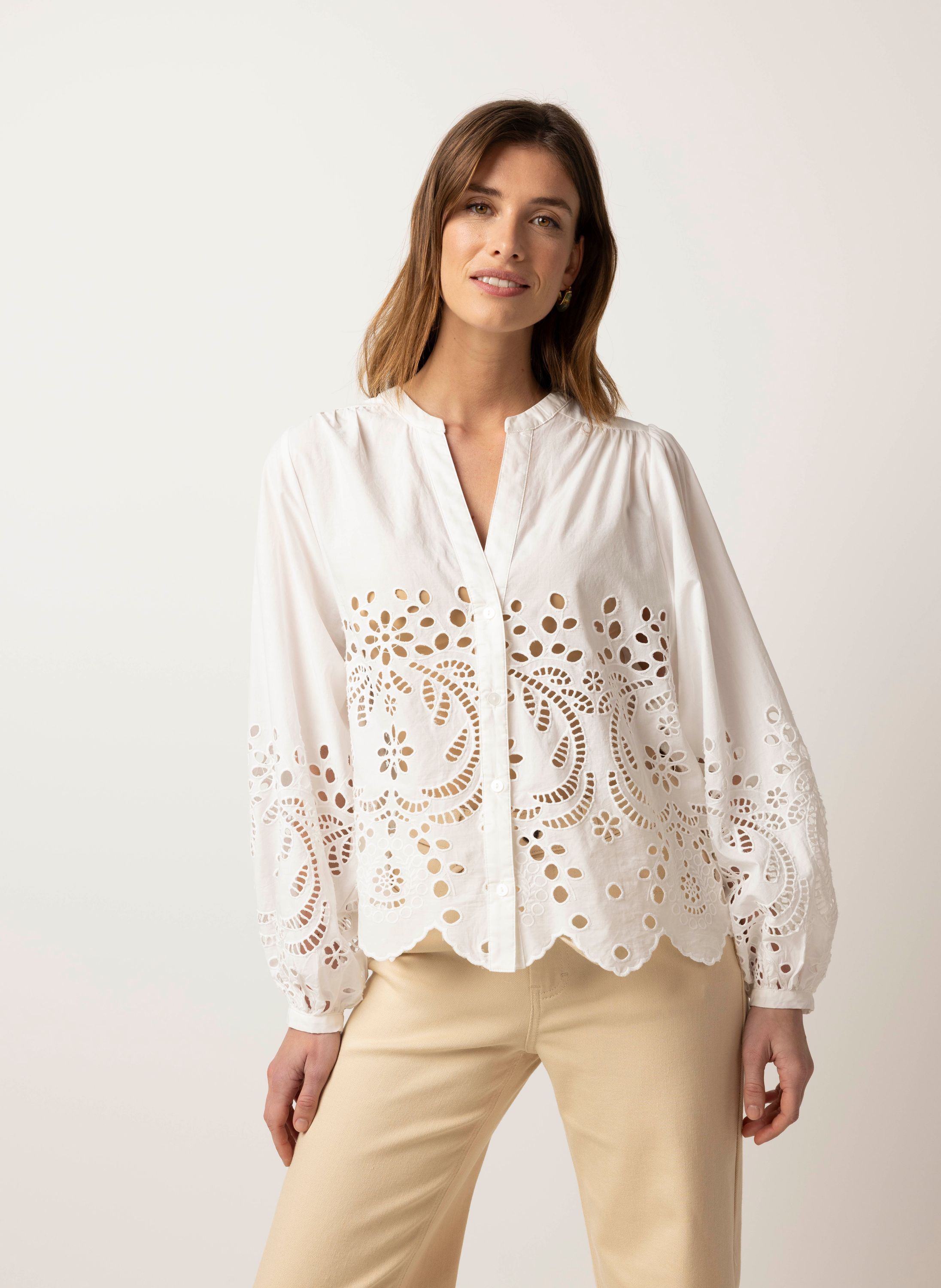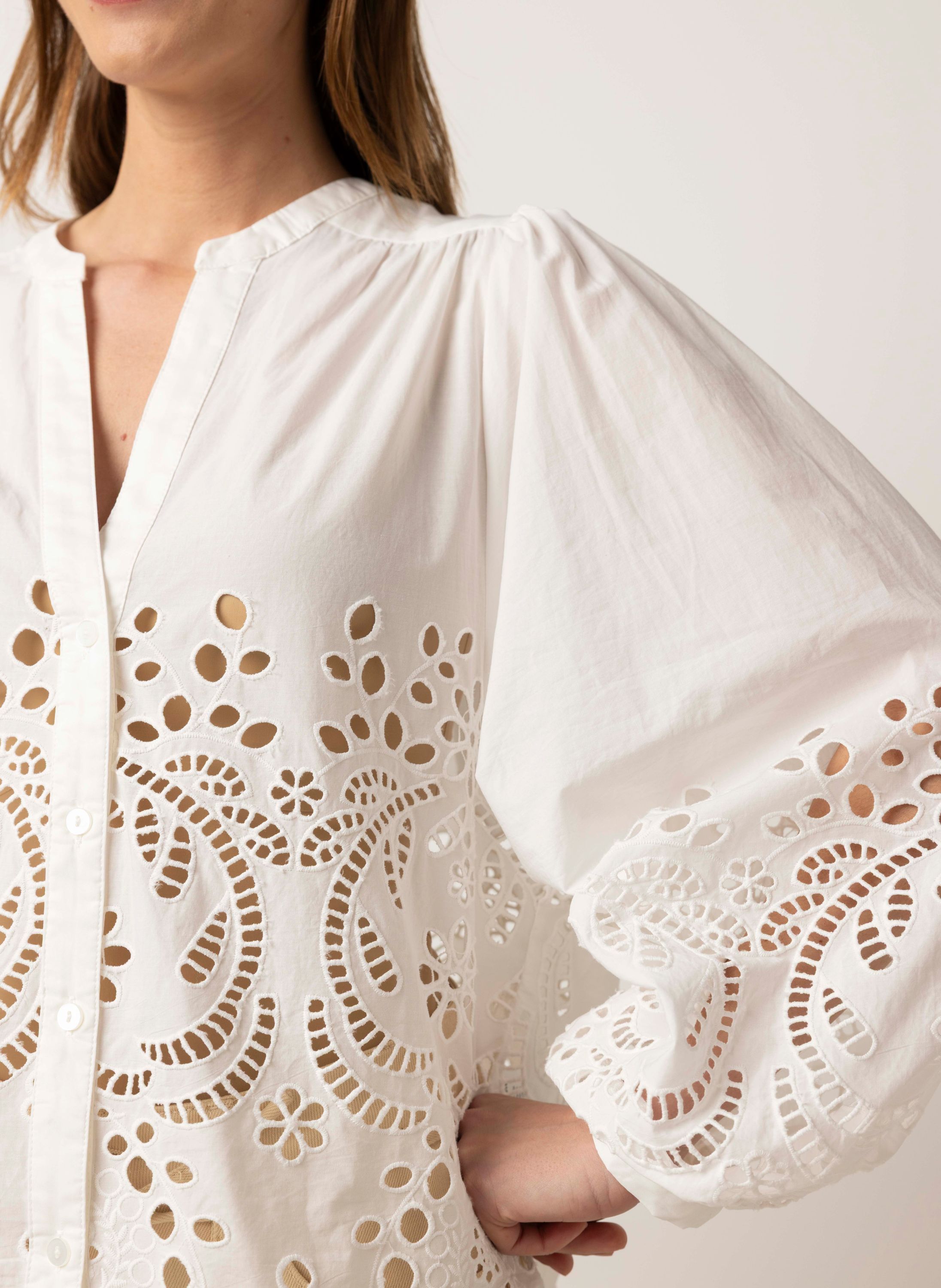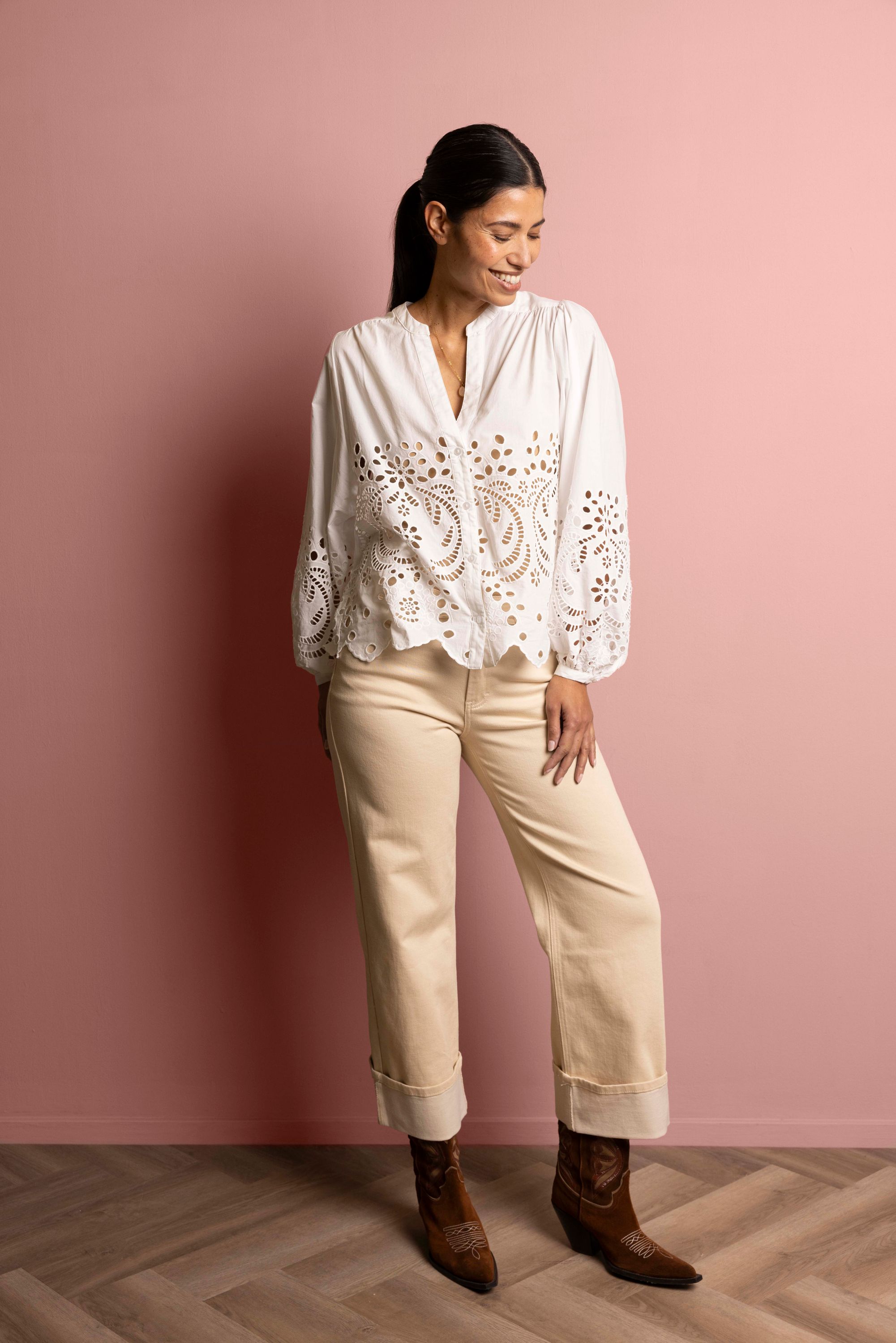 Deze katoenen blouse met ronde hals heeft een knoopsluiting en lange mouwen, valt aan de achterzijde iets langer en schijnt licht door. We adviseren je er een Marianne top onder te dragen.