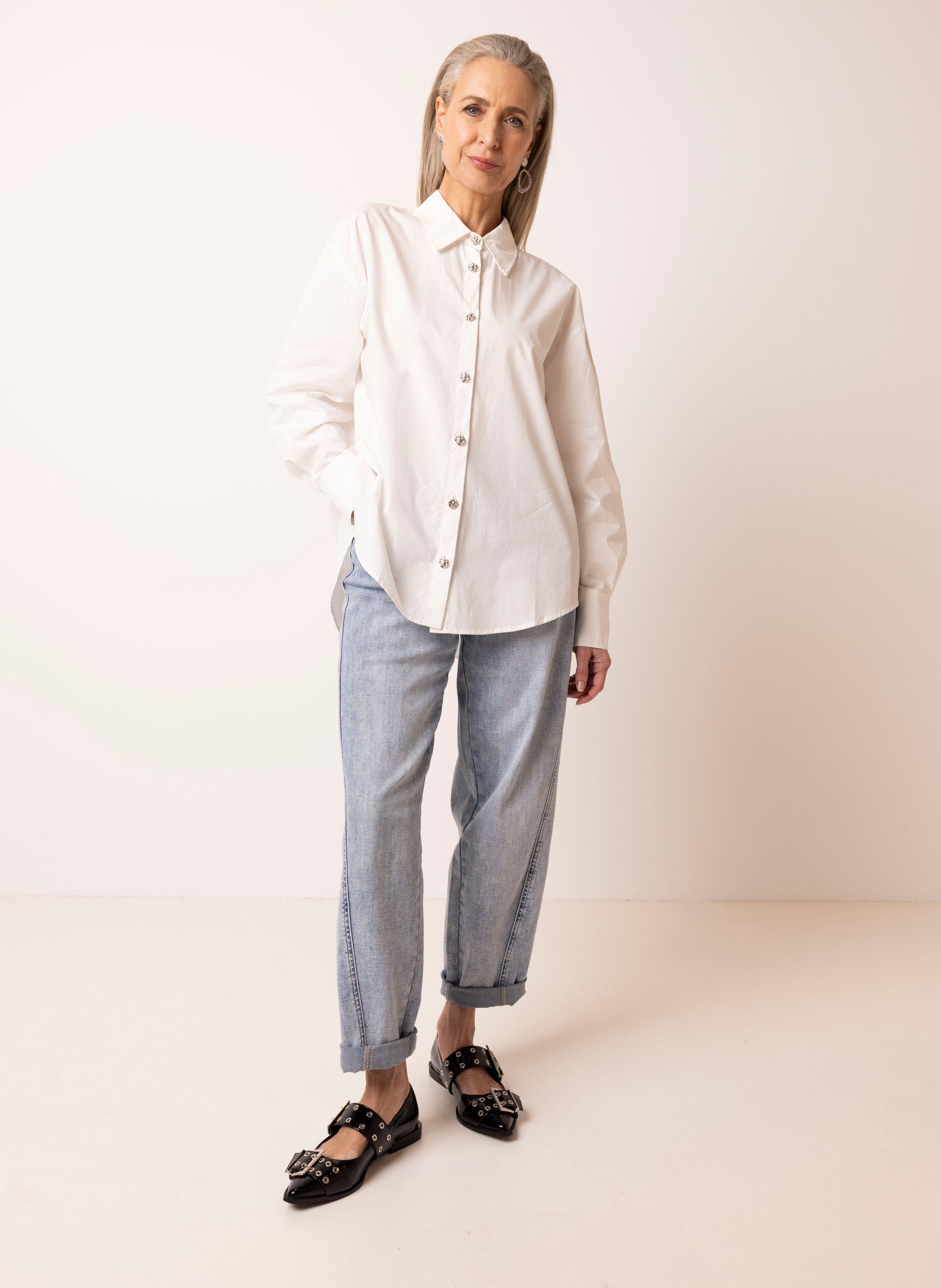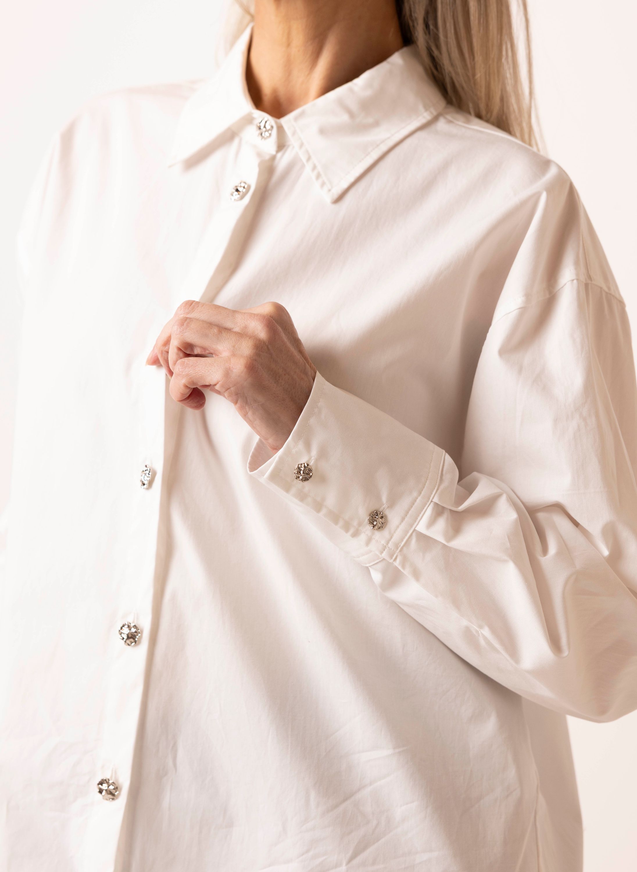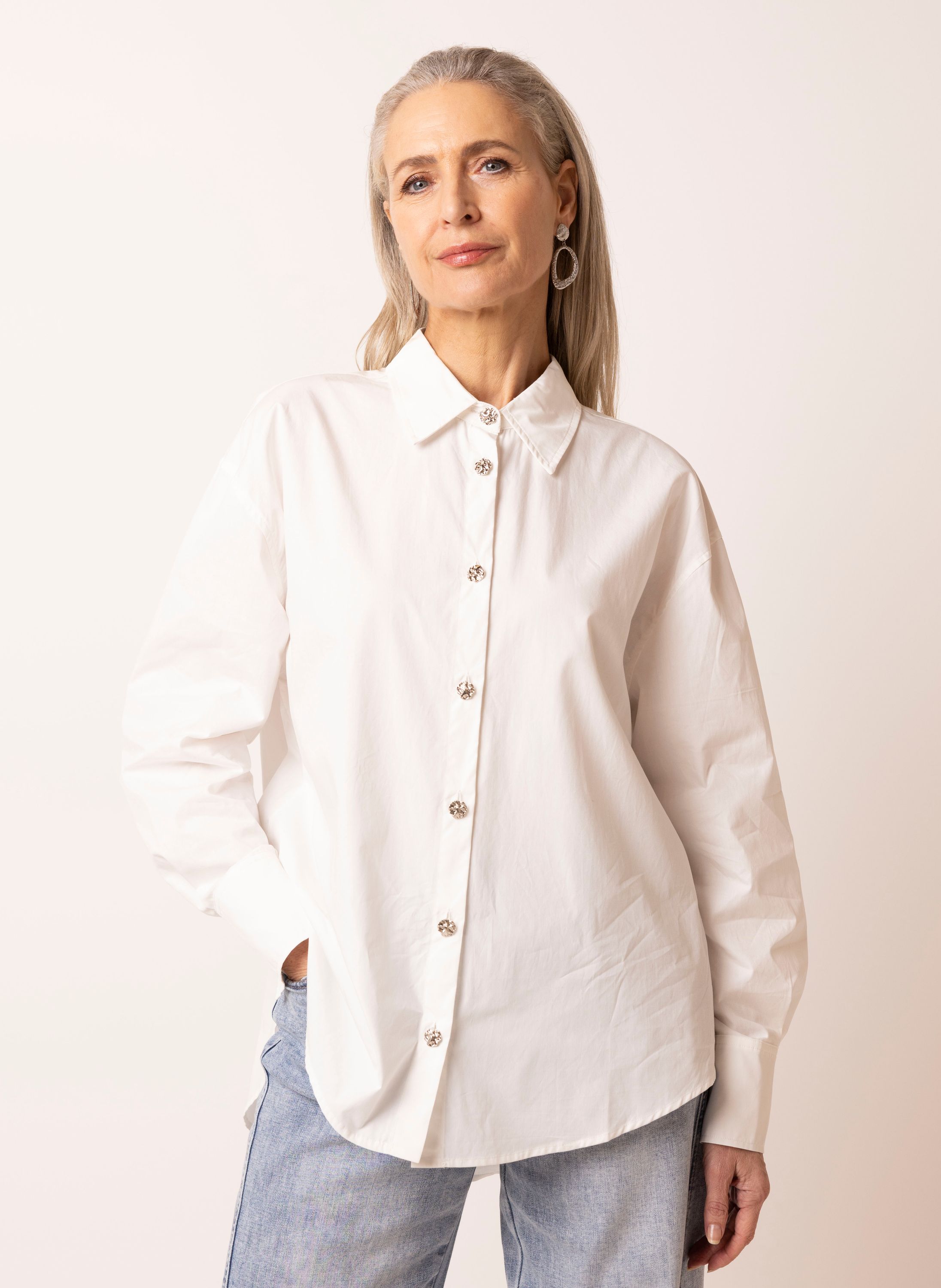 Katoenen blouse met klassieke kraag, zilverkleurige knoopsluitng en lange mouwen.