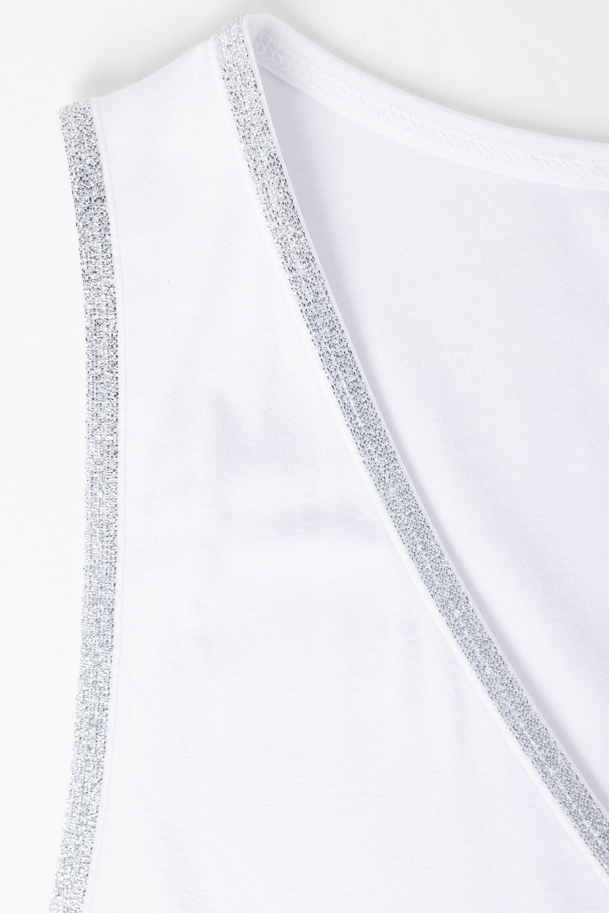 Deze mouwloze top met V-hals is afgewerkt met een zilverkleurig glitterbandje. Deze top geeft je outfit een feestelijke touch.