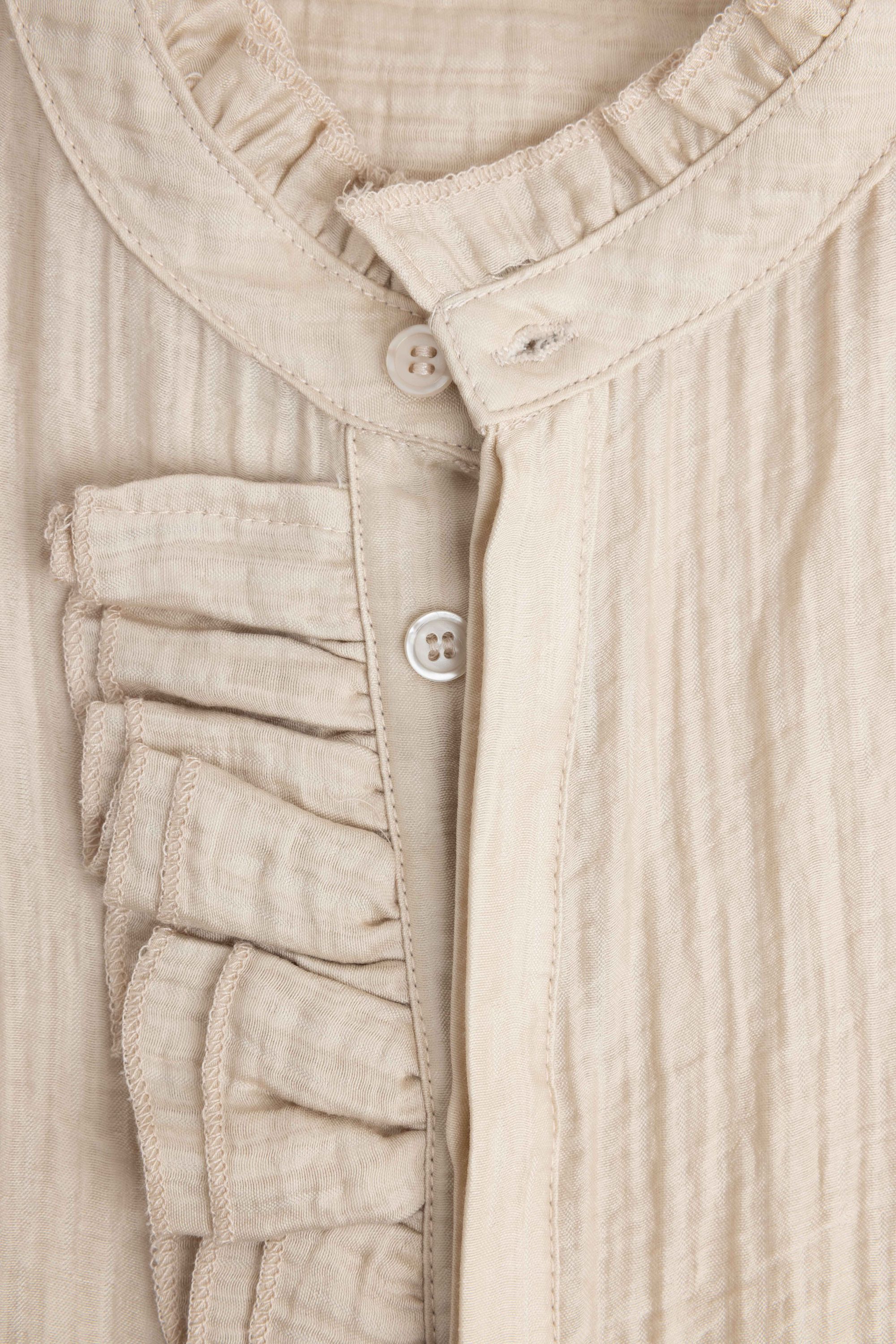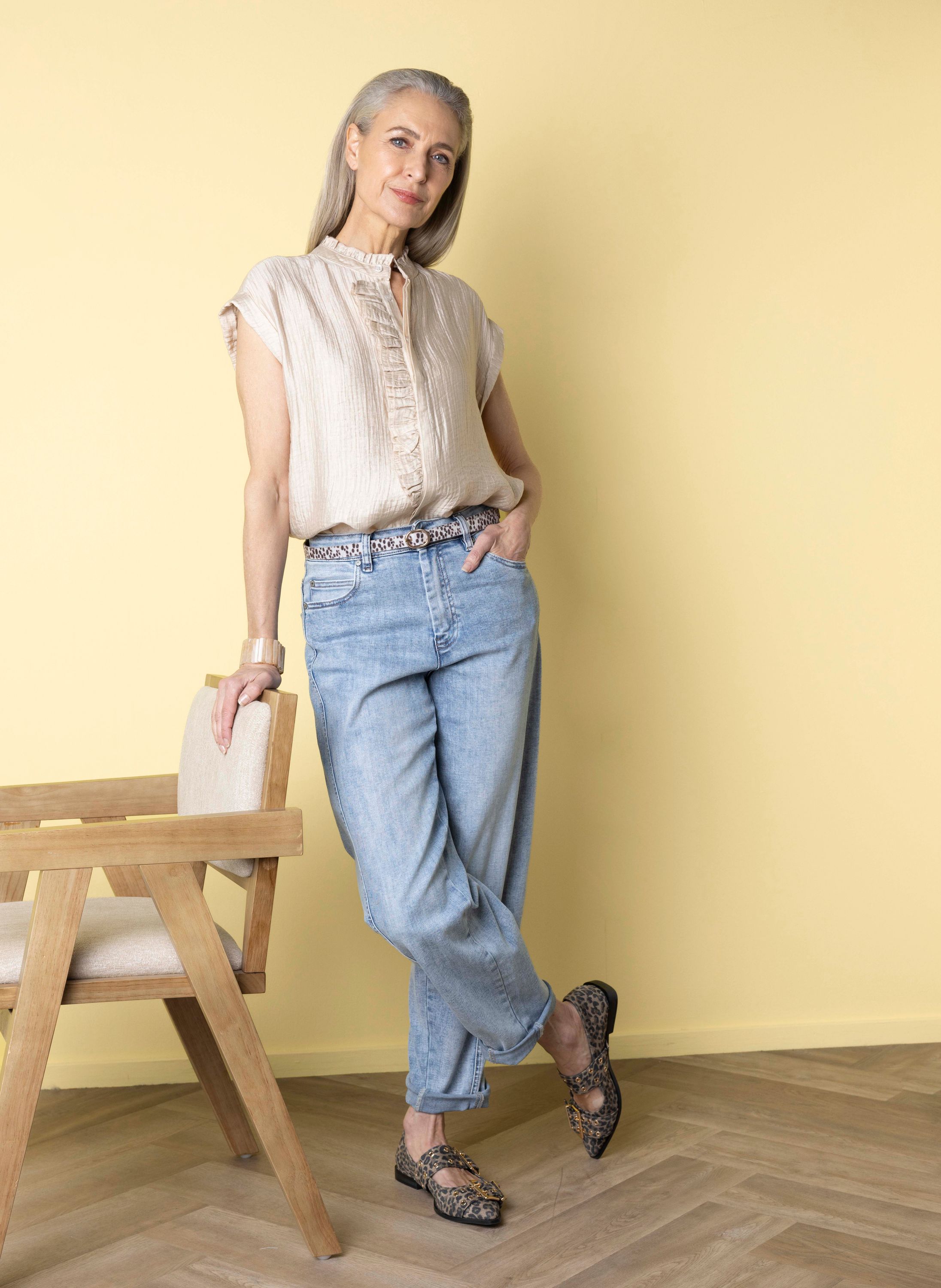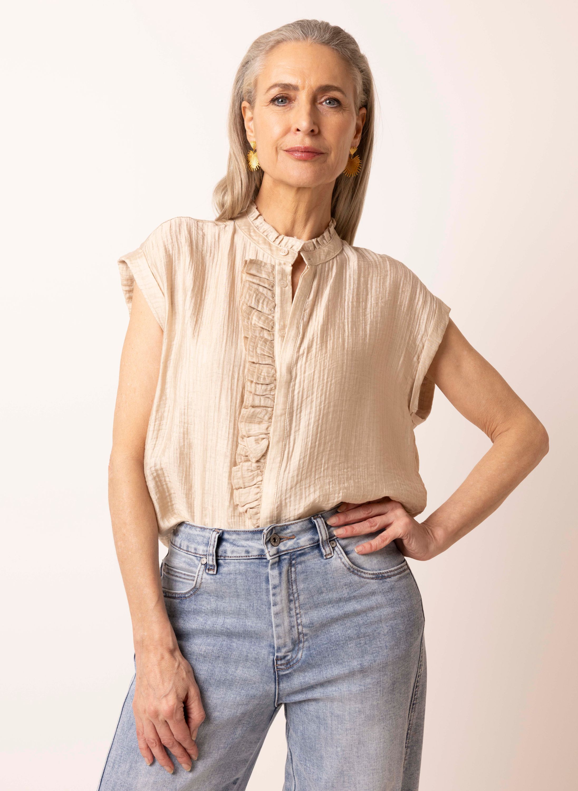 Blouse met ronde hals, knoopsluioting en aangeknopte korte mouwen.