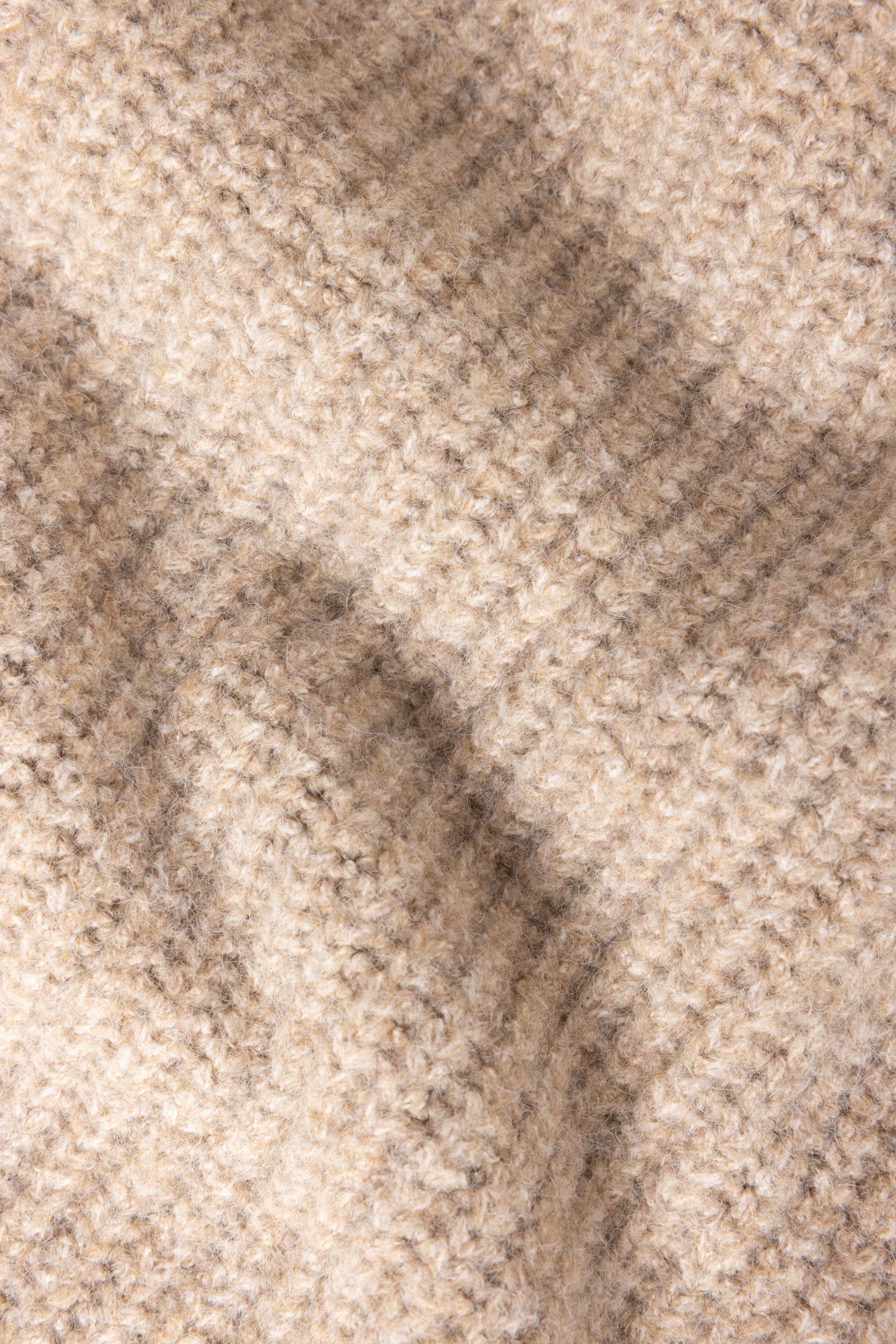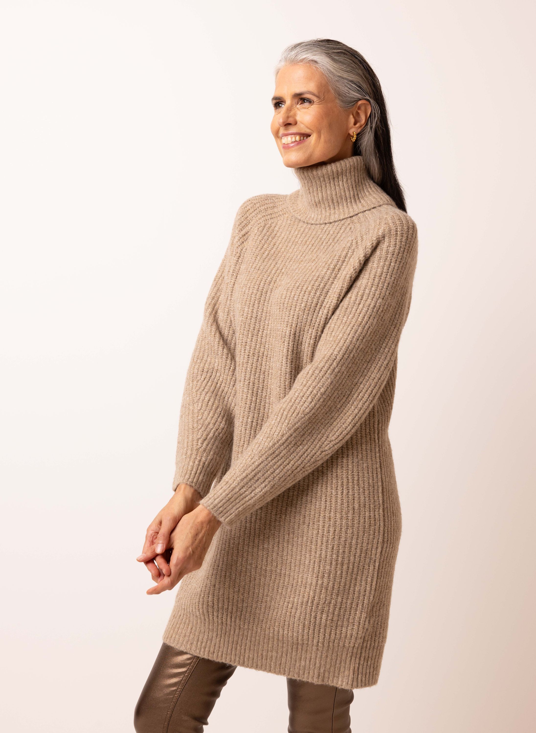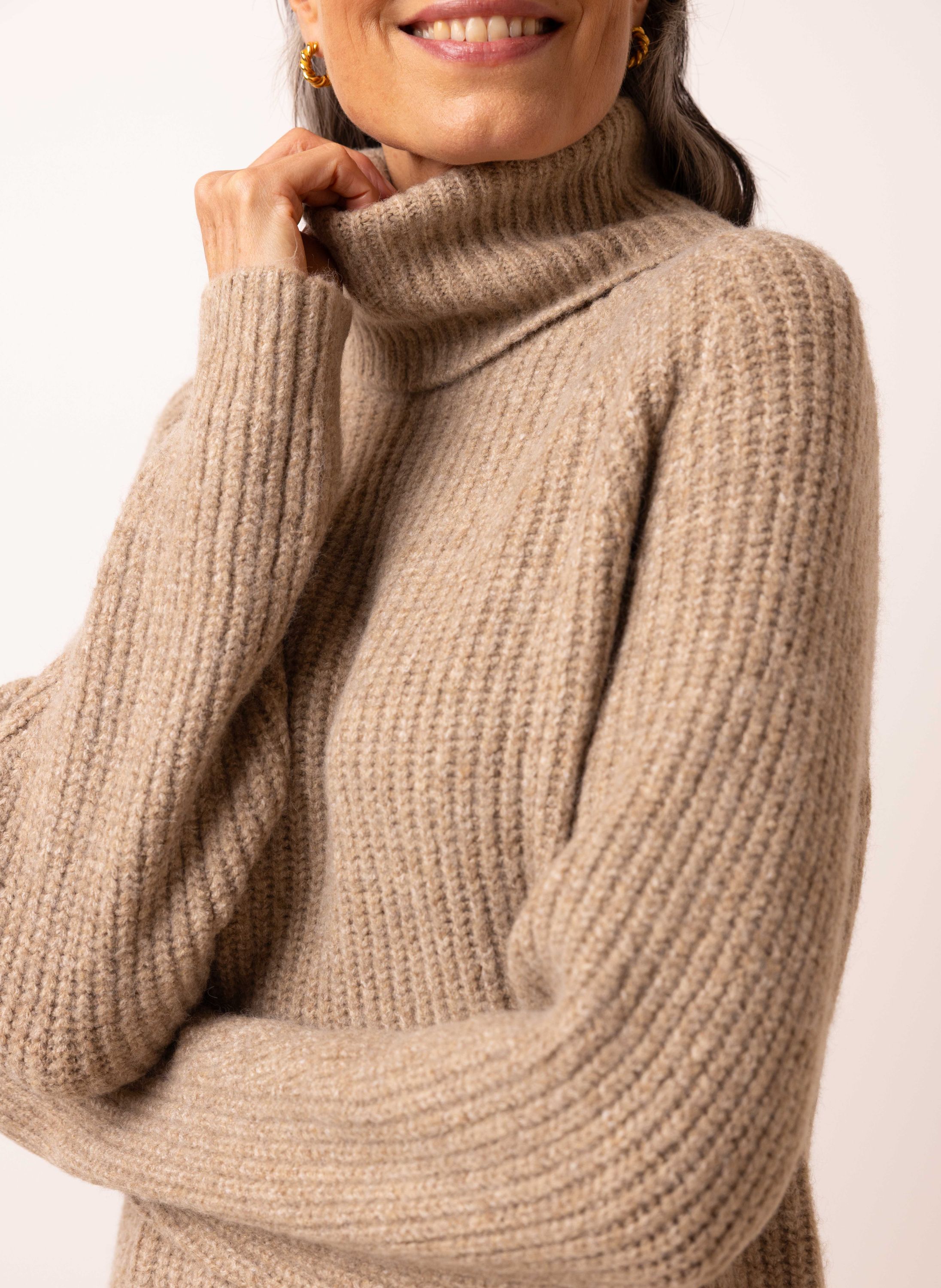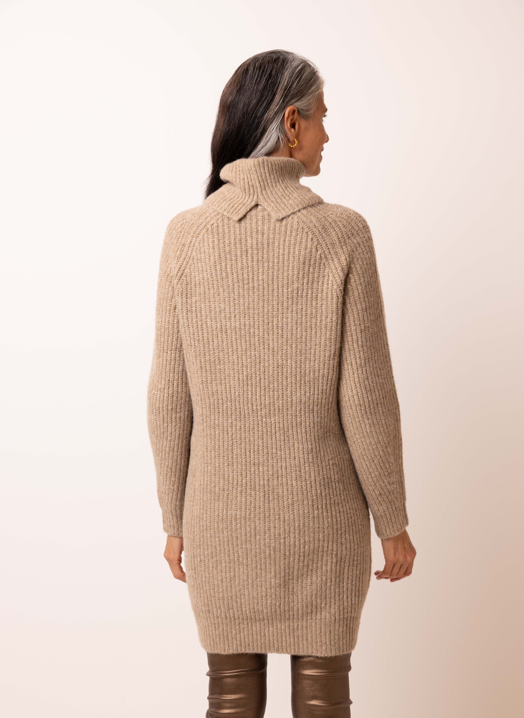 Zandkleurige gebreide midi jurk met col