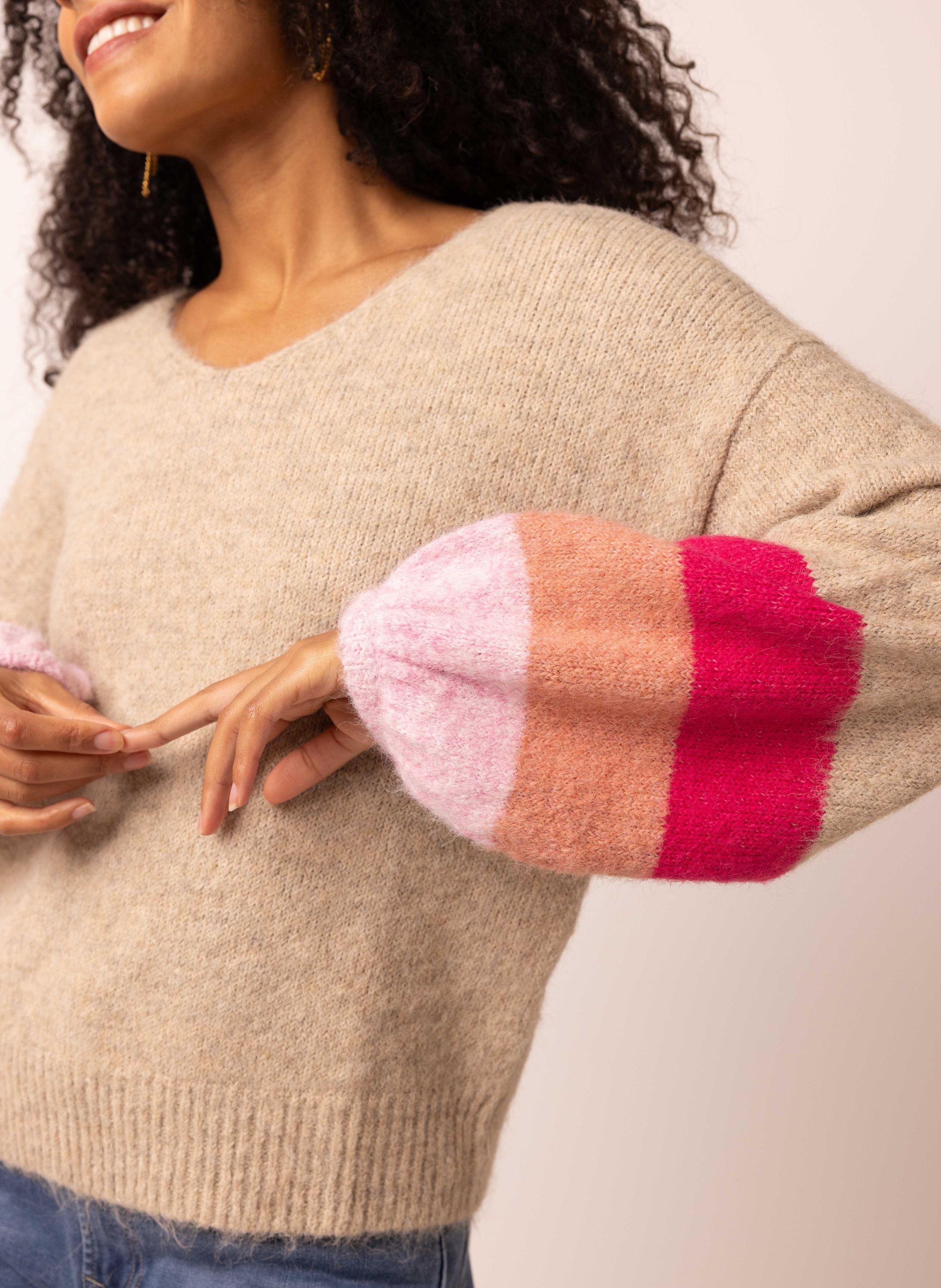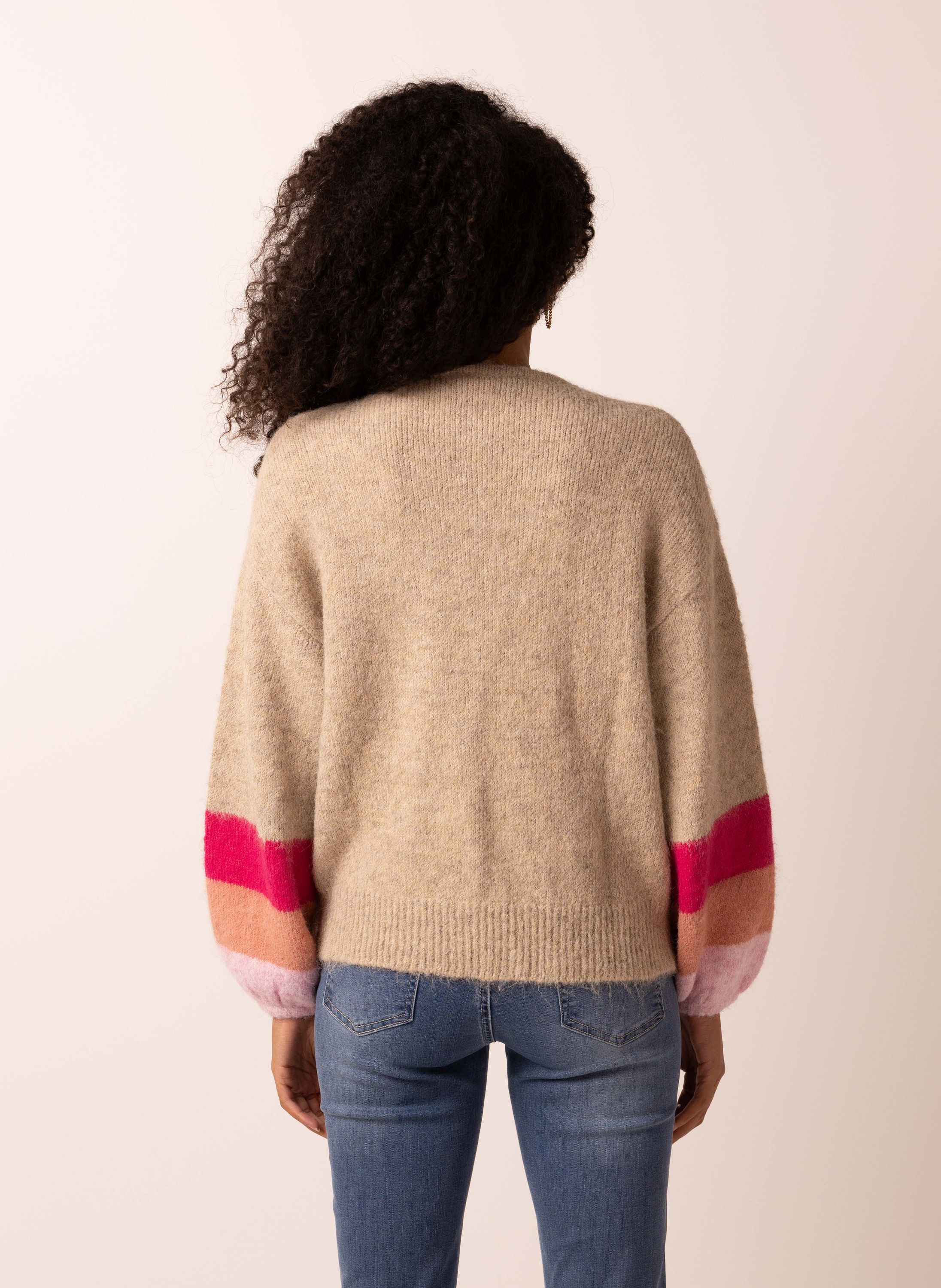 Deze gebreide trui heeft een V-hals en lange mouwen.