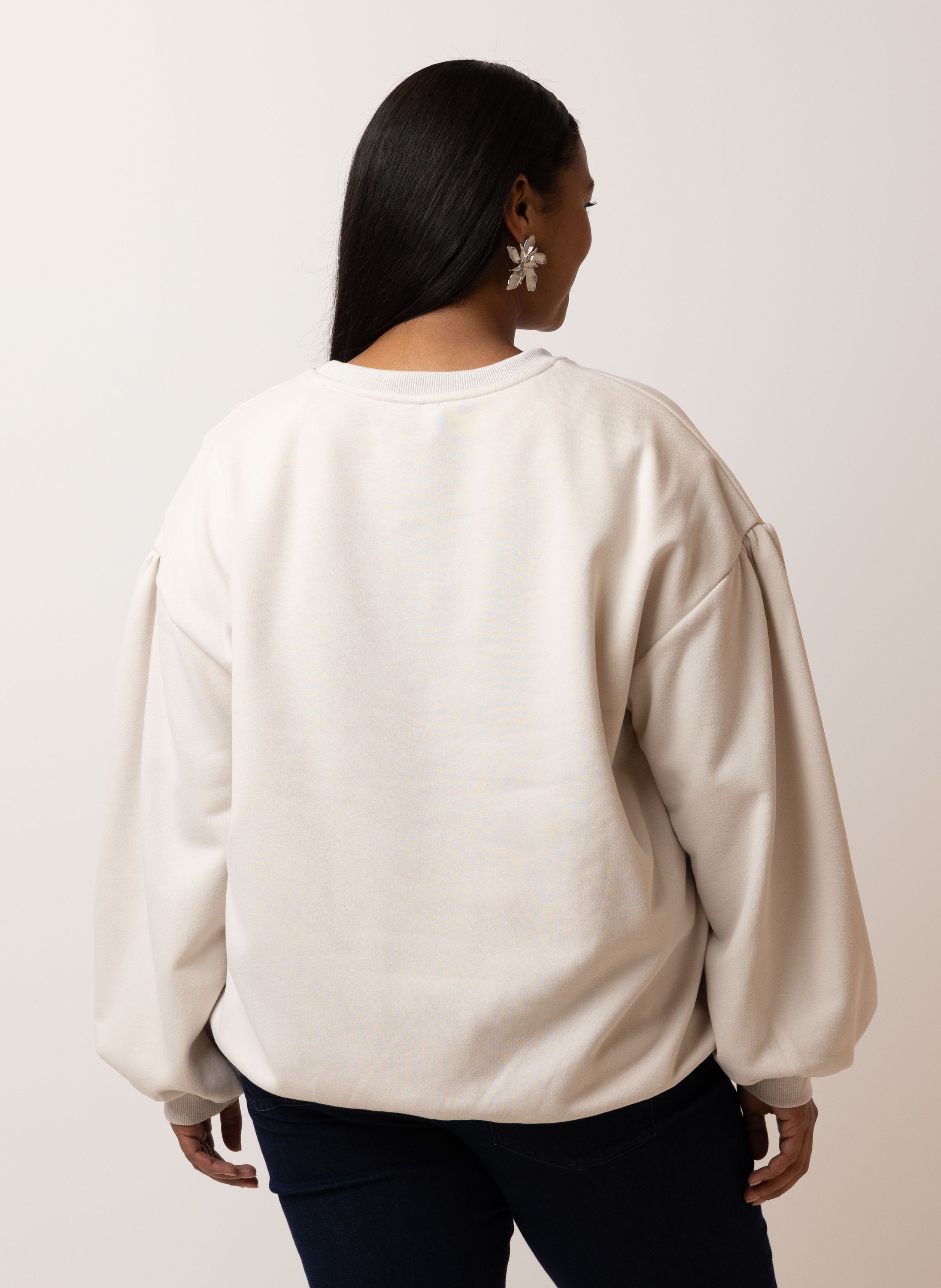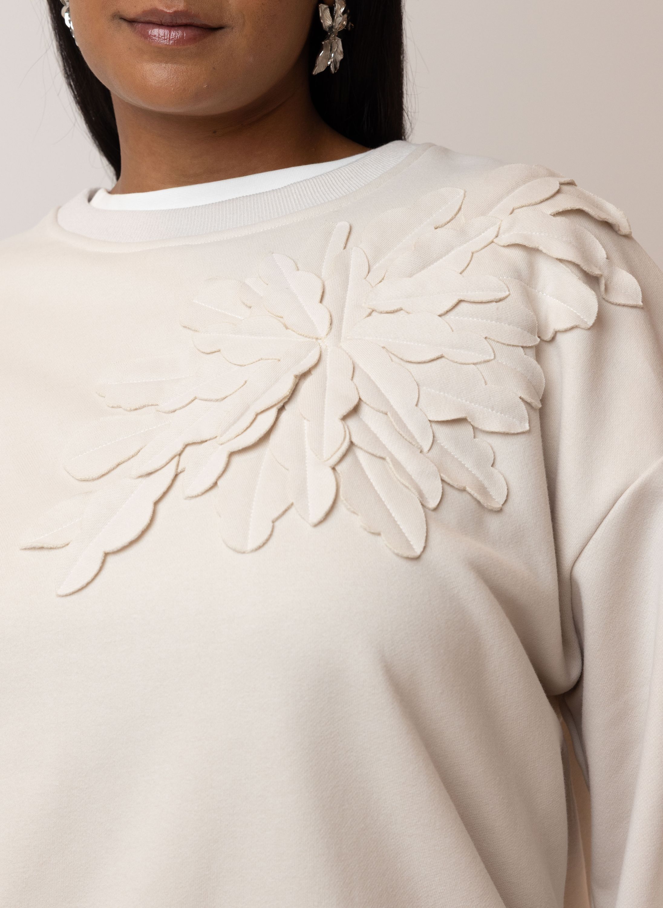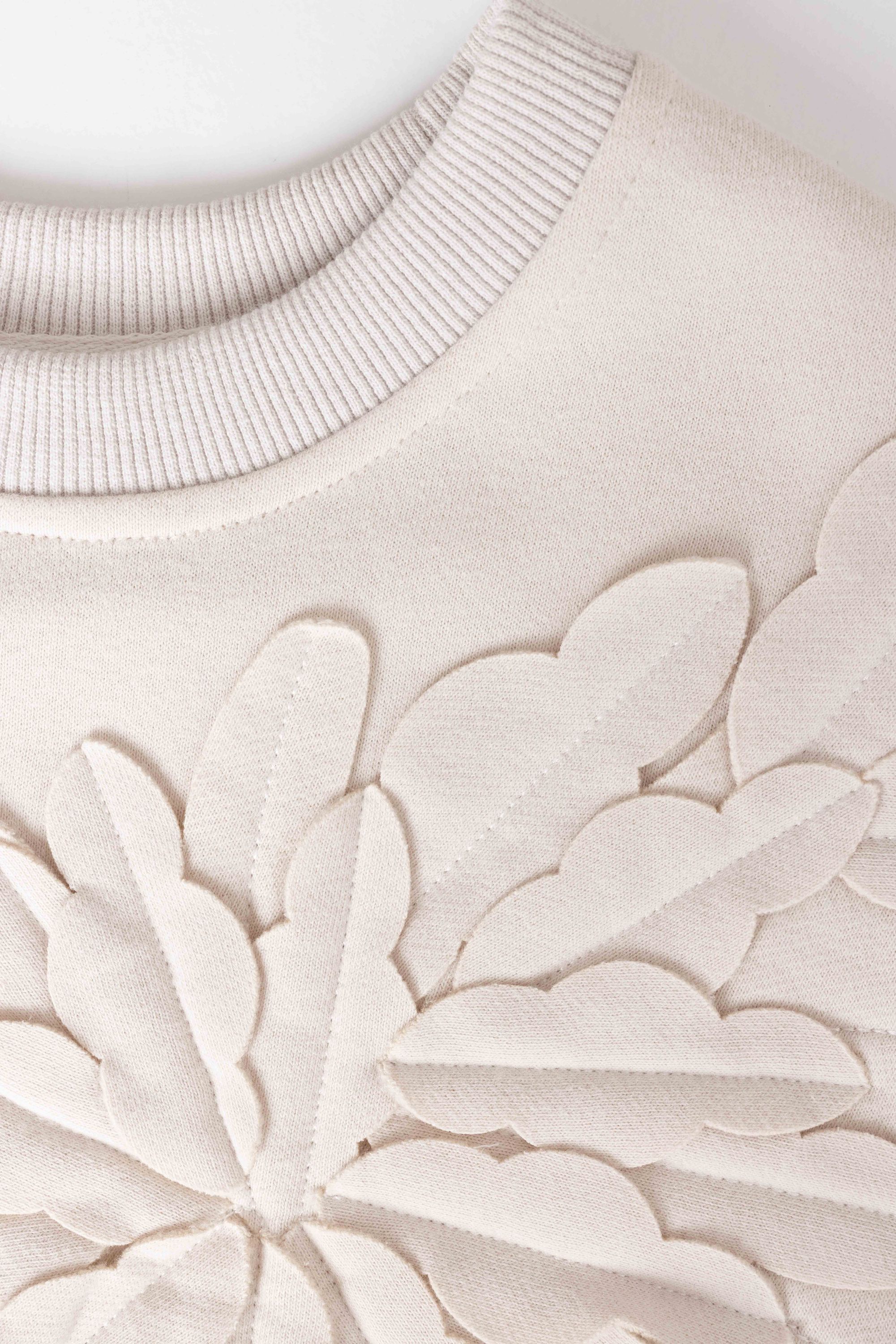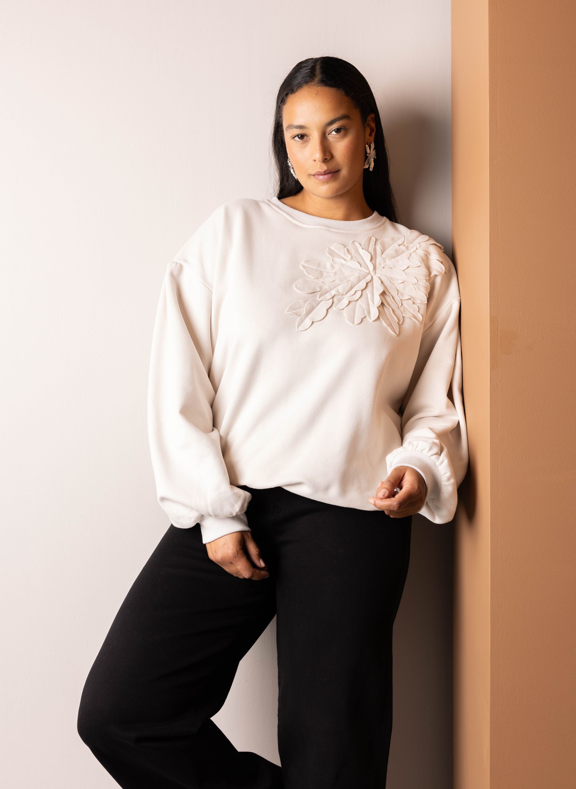 Deze sweater met ronde hals en lange pofmouwen is afgewerkt met een 3d-bloem op één schouder.