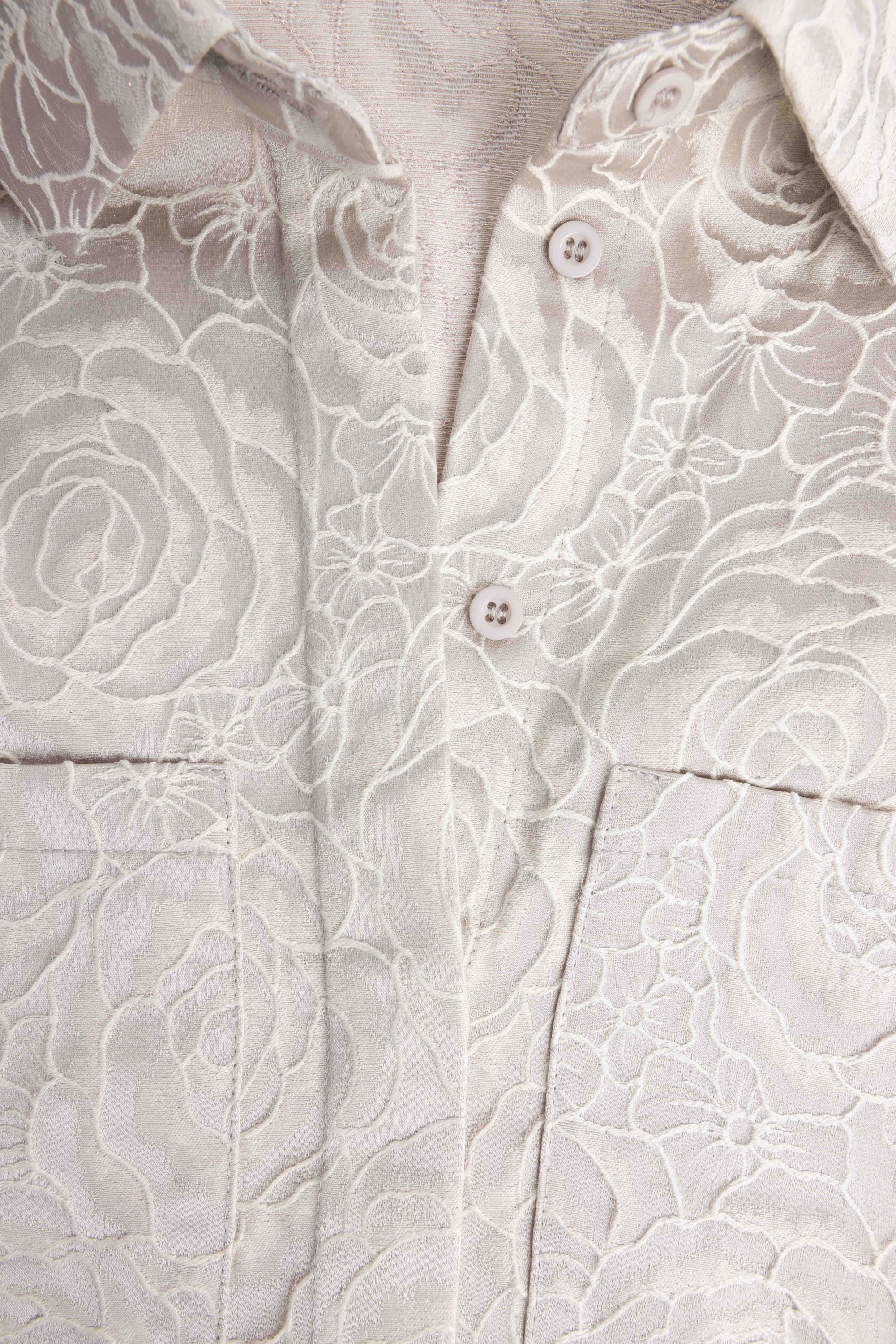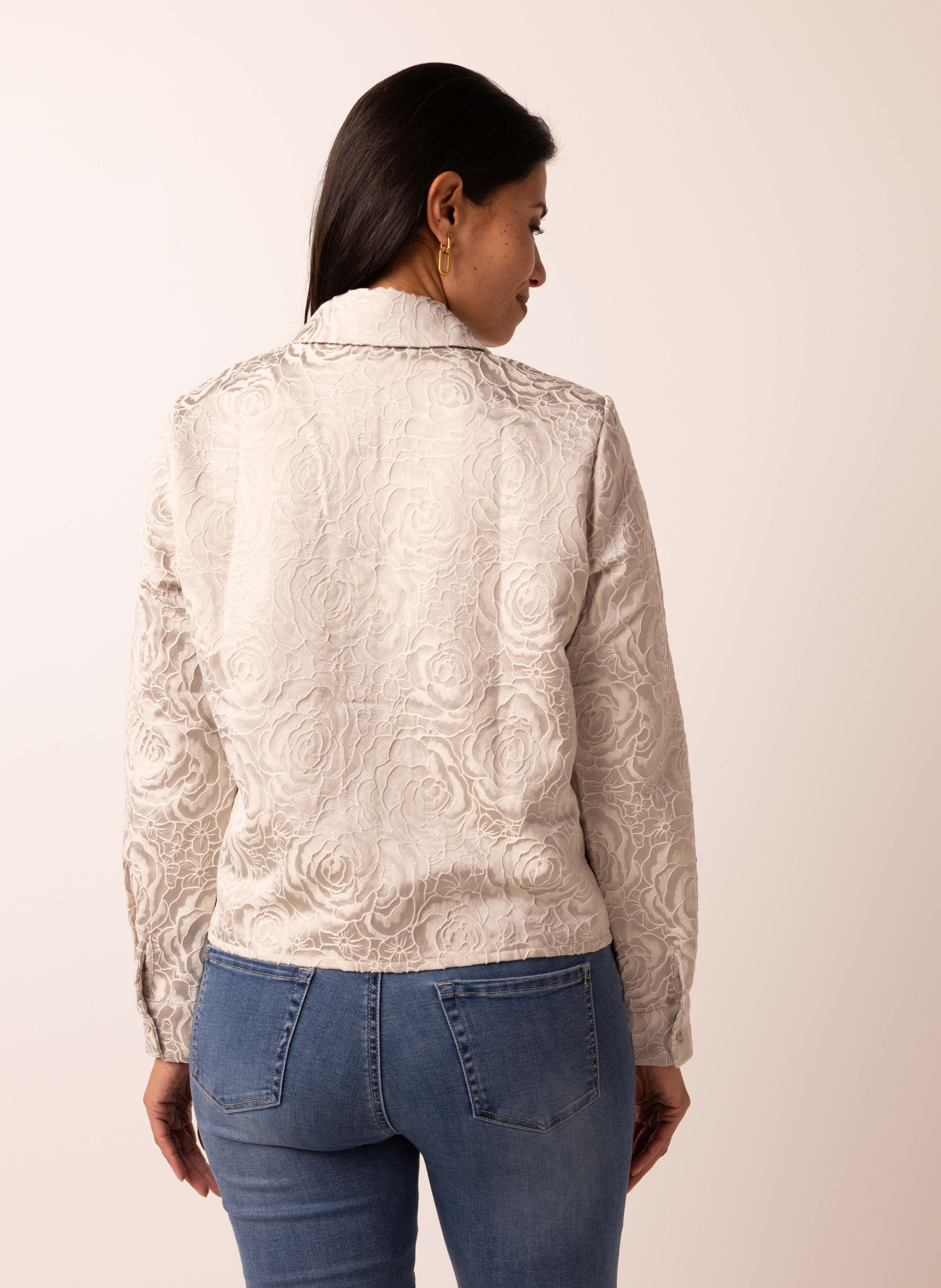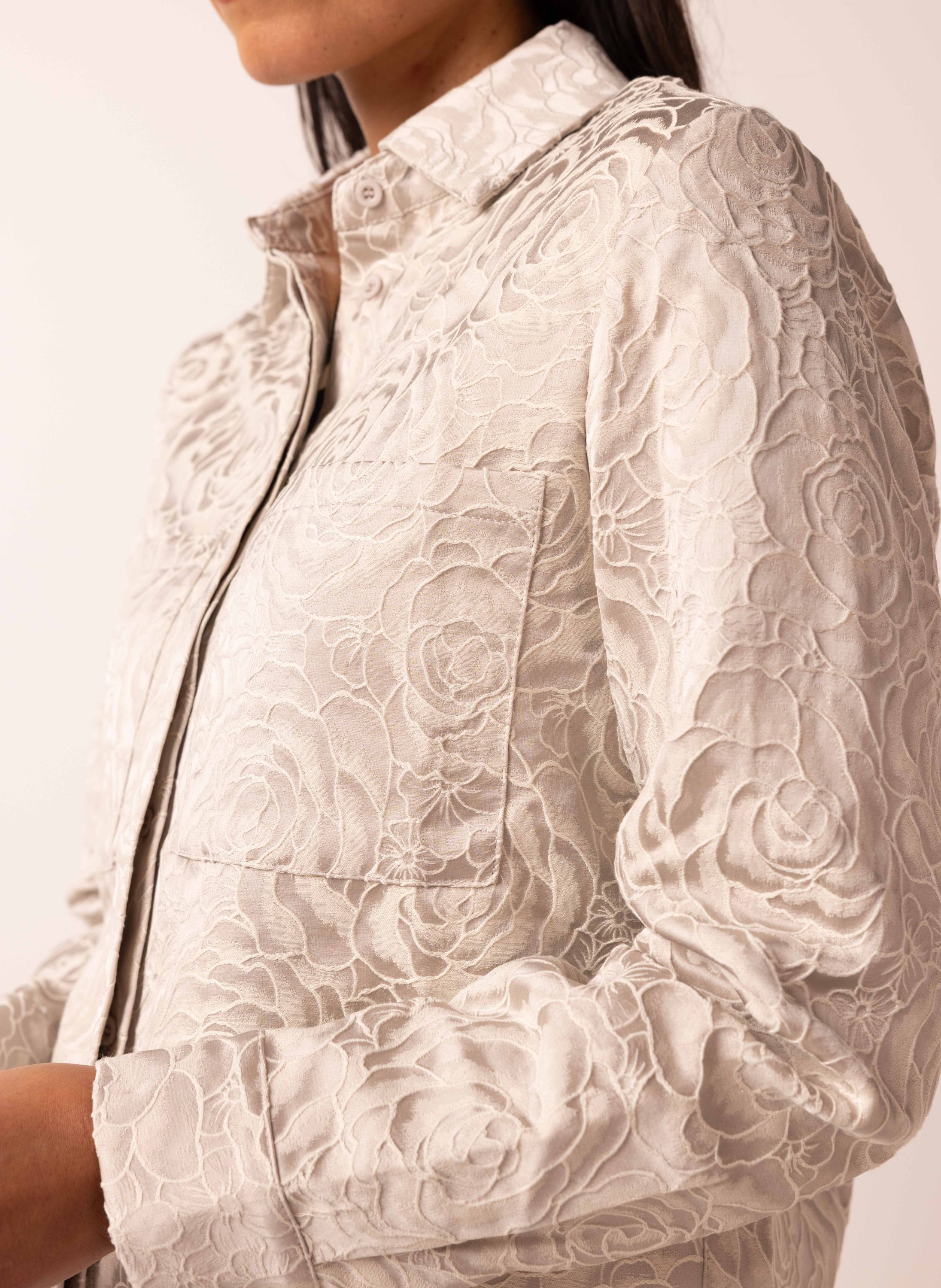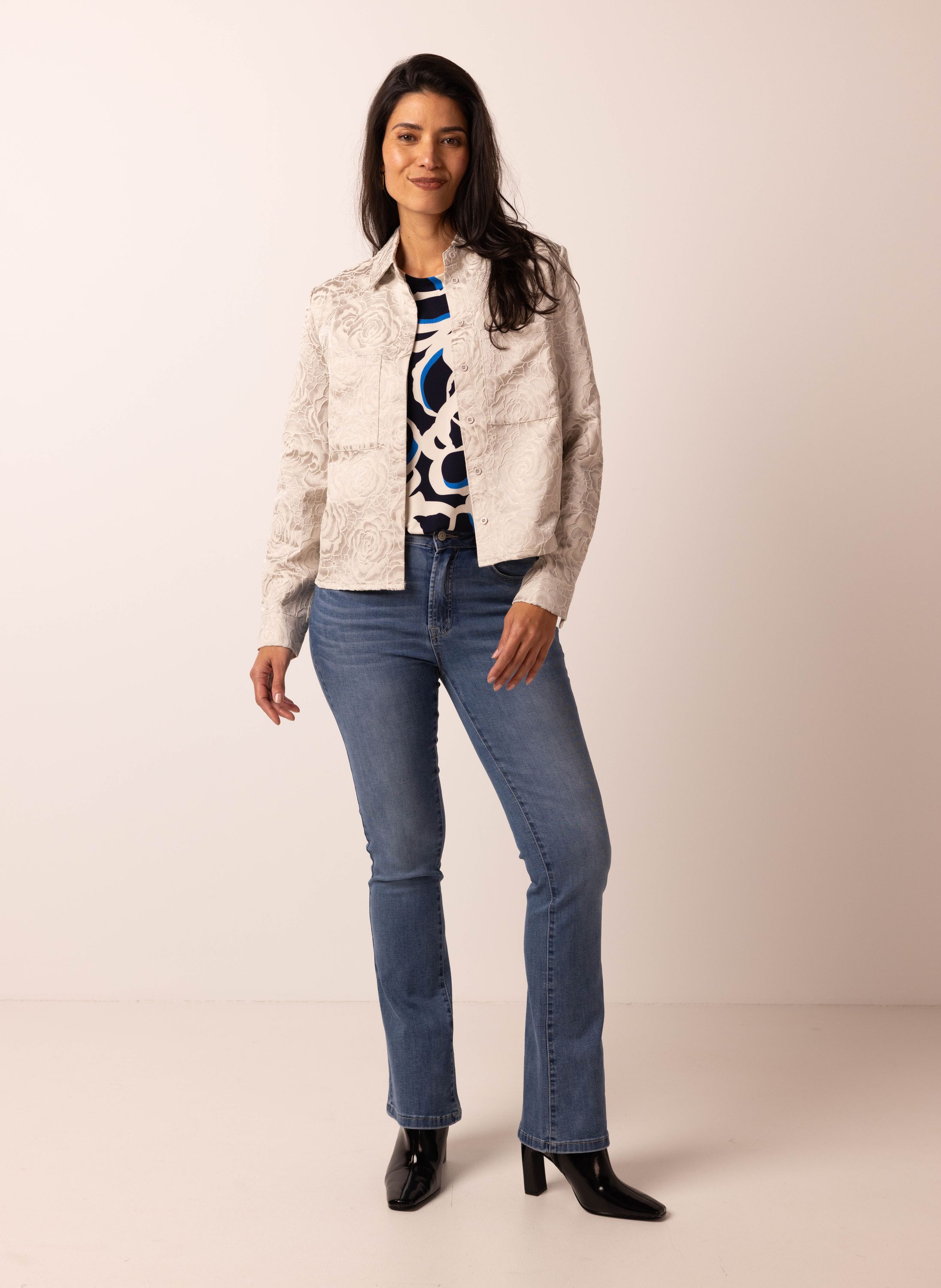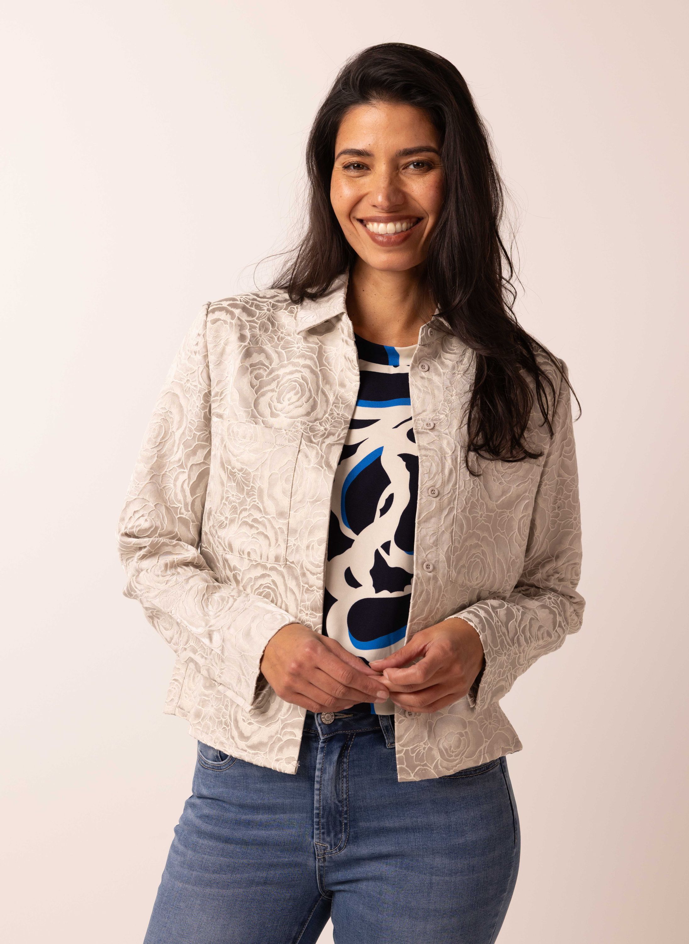 Deze jas is uitgevoerd in een stof met subtiele structuur en heeft een klassieke kraag met een blinde knoopsluiting aan de voorzijde. De licht getailleerde pasvorm en lange mouwen zorgen voor een nette, vrouwelijke look die gemakkelijk te combineren is met zowel een broek als een jurk.