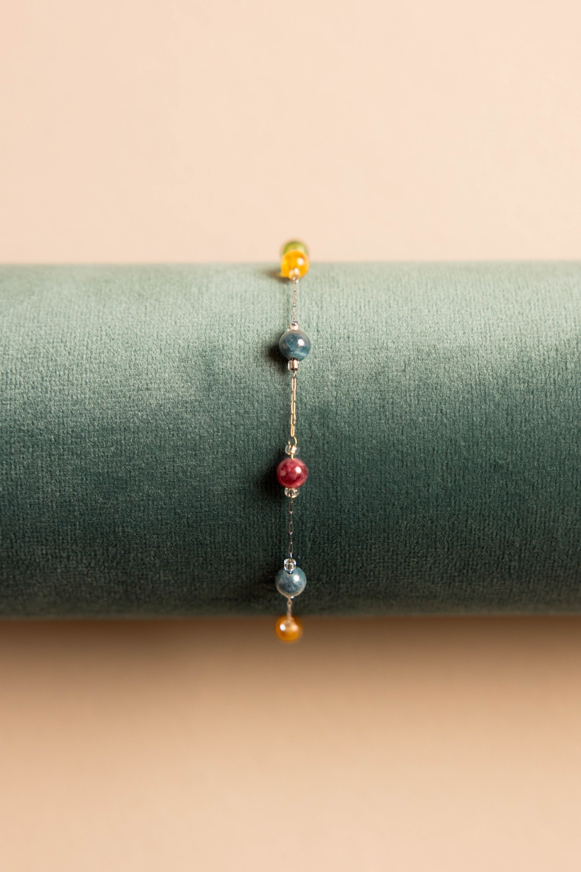 Deze zilverkleurige armband met gekleurde steentjes geeft je outfit een speelse touch.