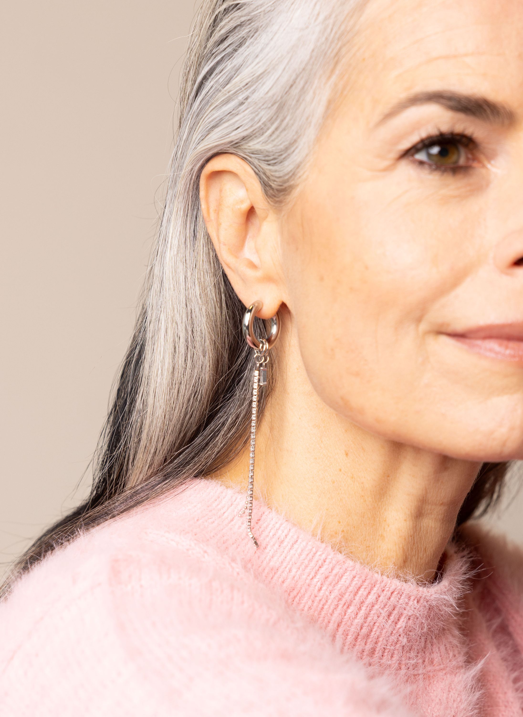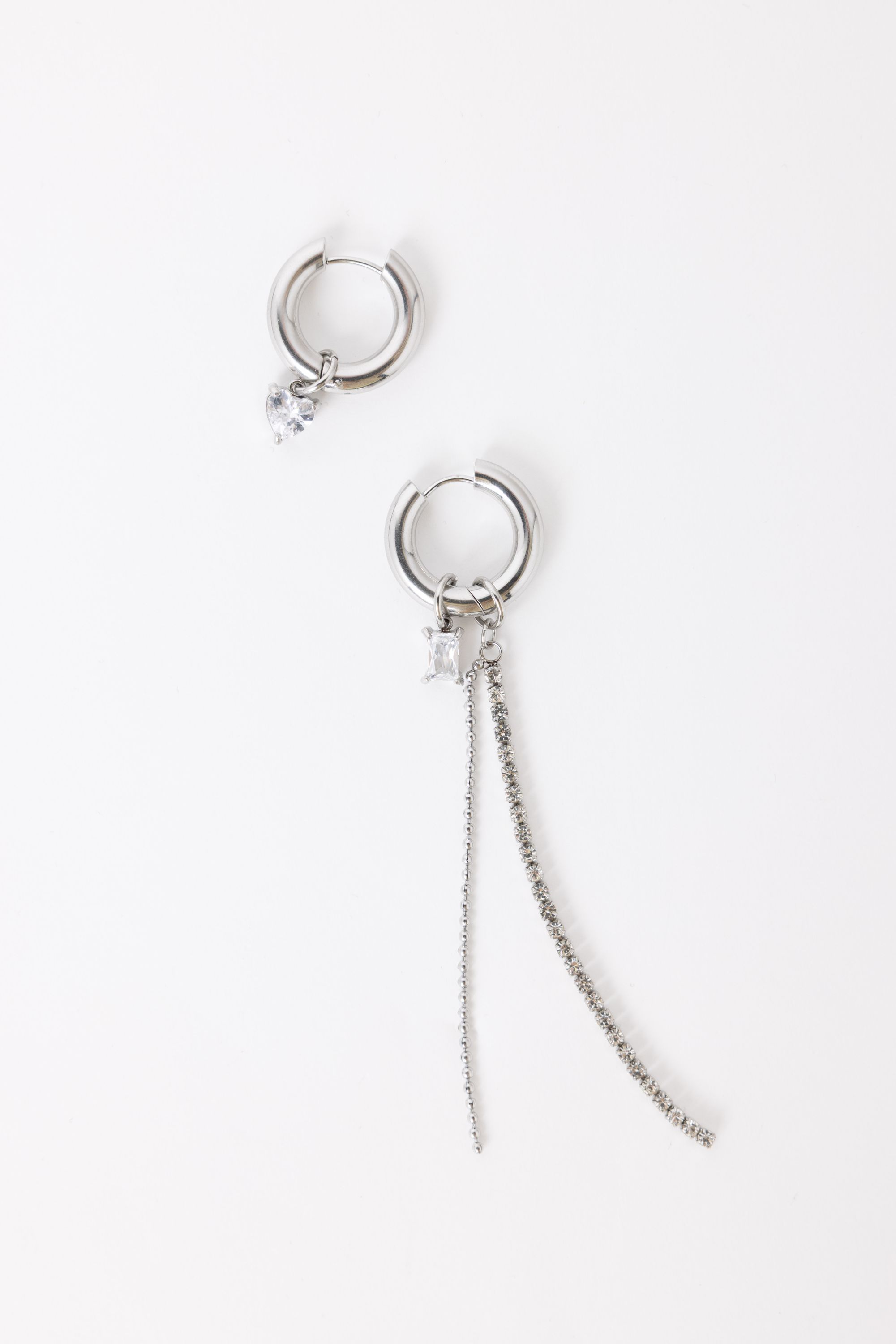 Deze zilverkleurige oorbellen hebben een glinsterend hartje en elegante hangers. Afmeting: ring: 2 cm, hanger klein: 0,5 cm, hanger lang: 8 cm.