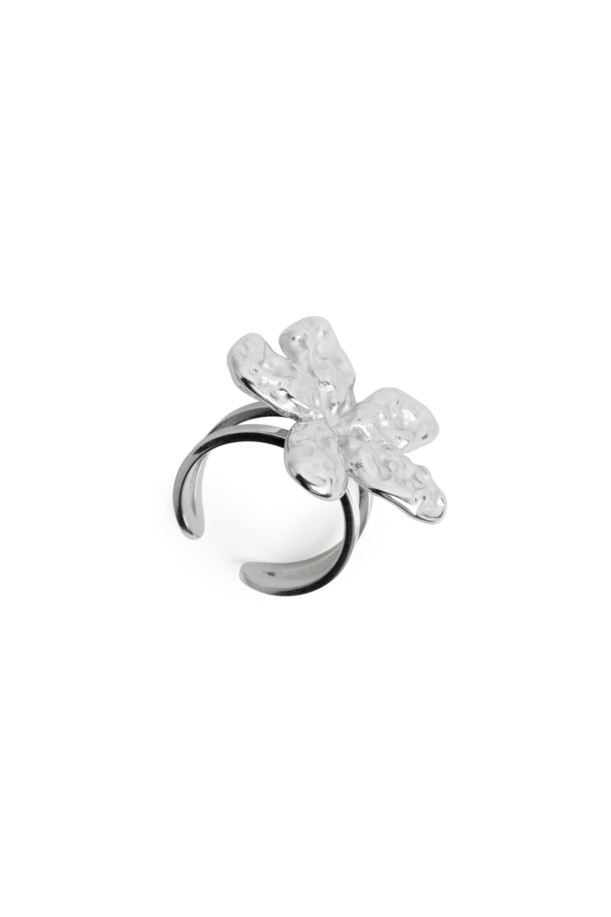 Deze zilverkleurige ring heeft een bloemdetail en is verstelbaar voor een comfortabele pasvorm. Afmeting bloem: 3 cm.