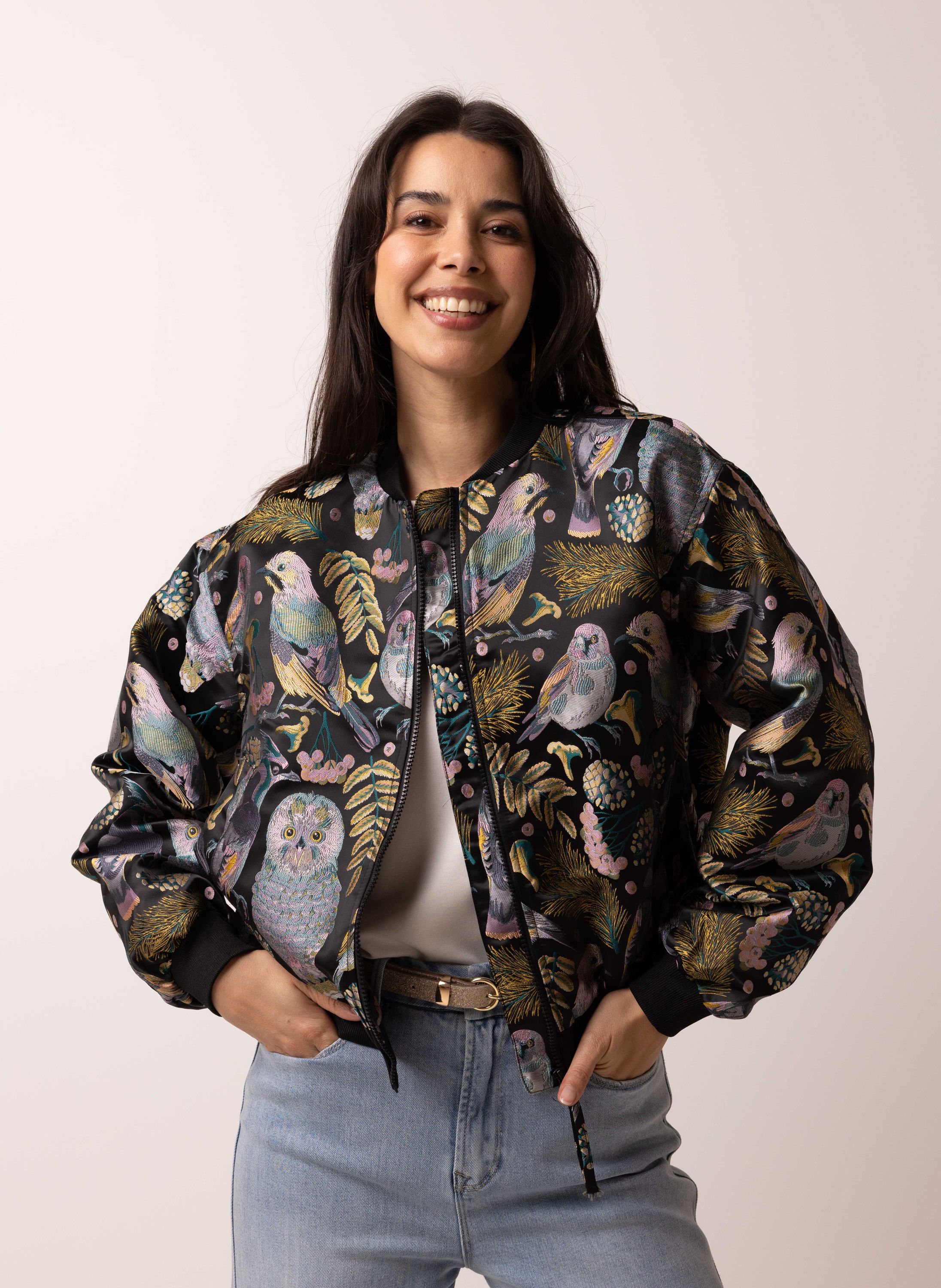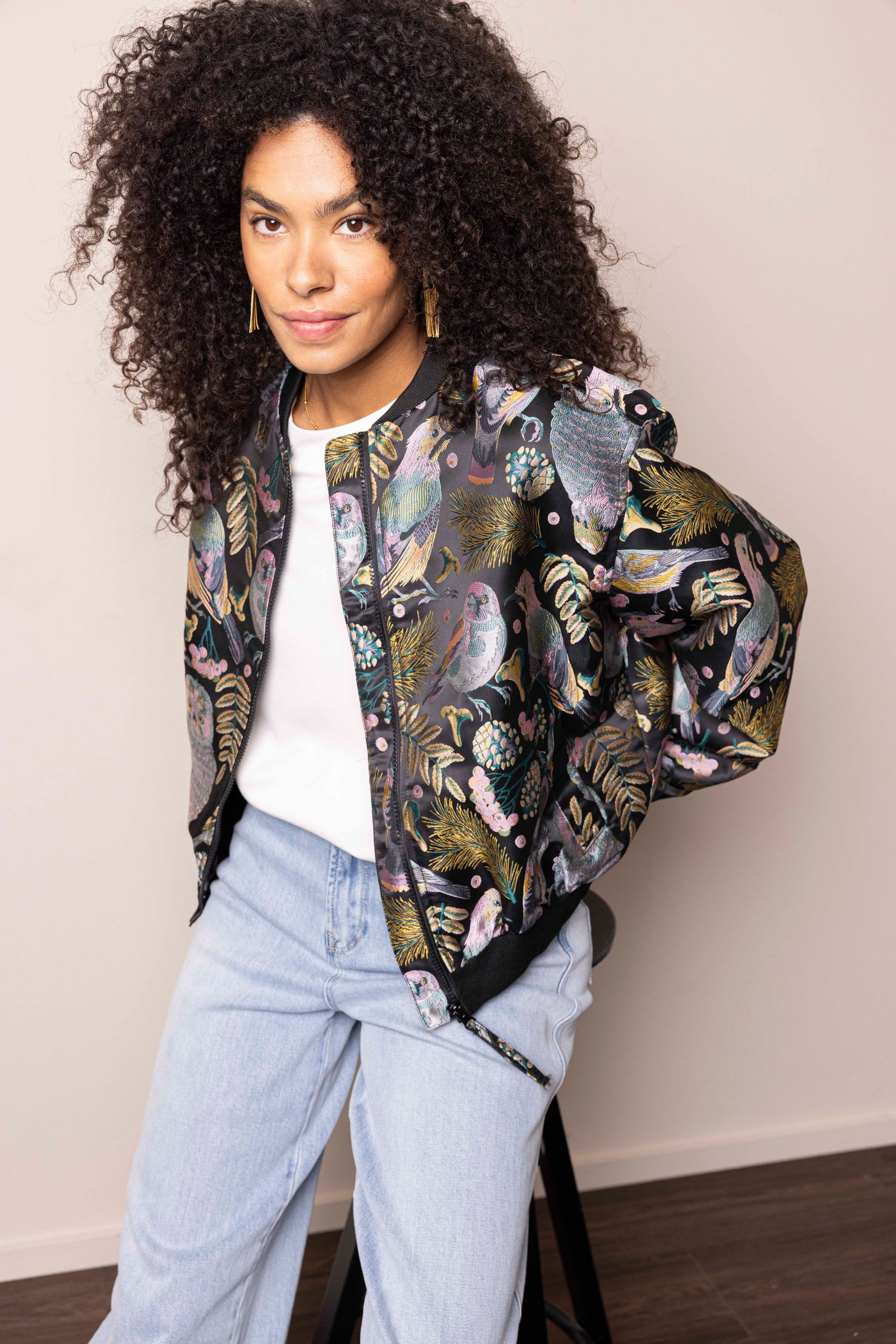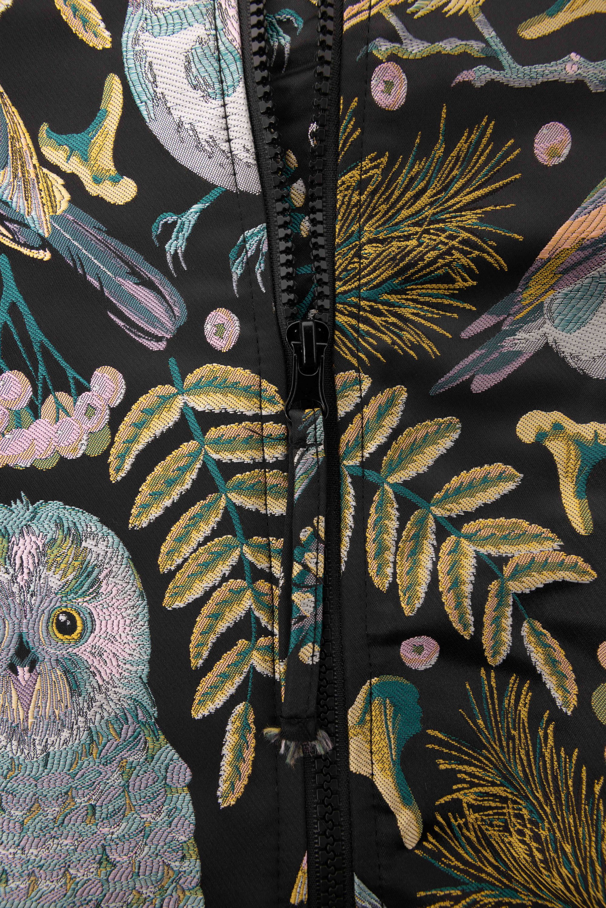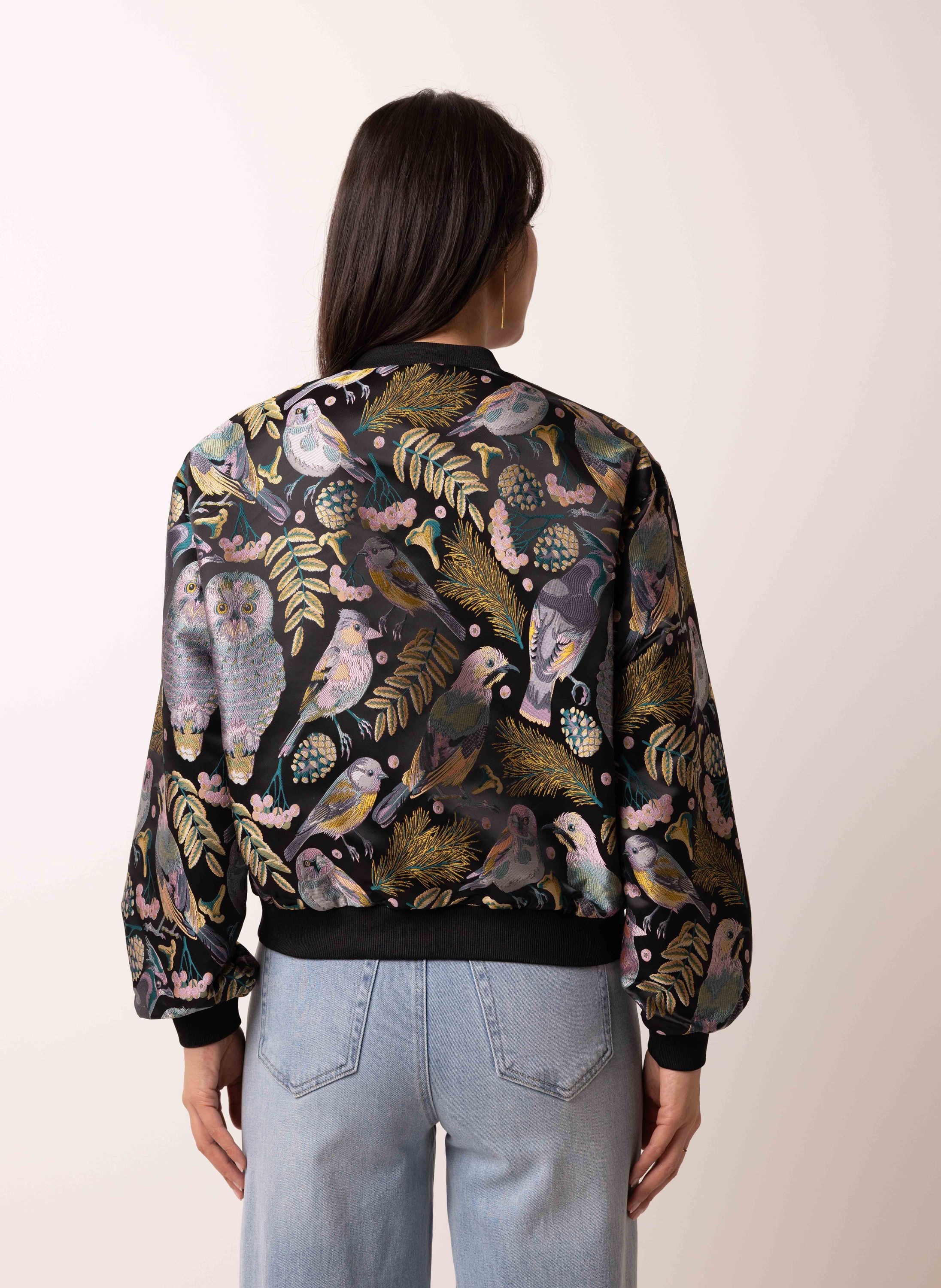 Zwart bomberjas met botanische print