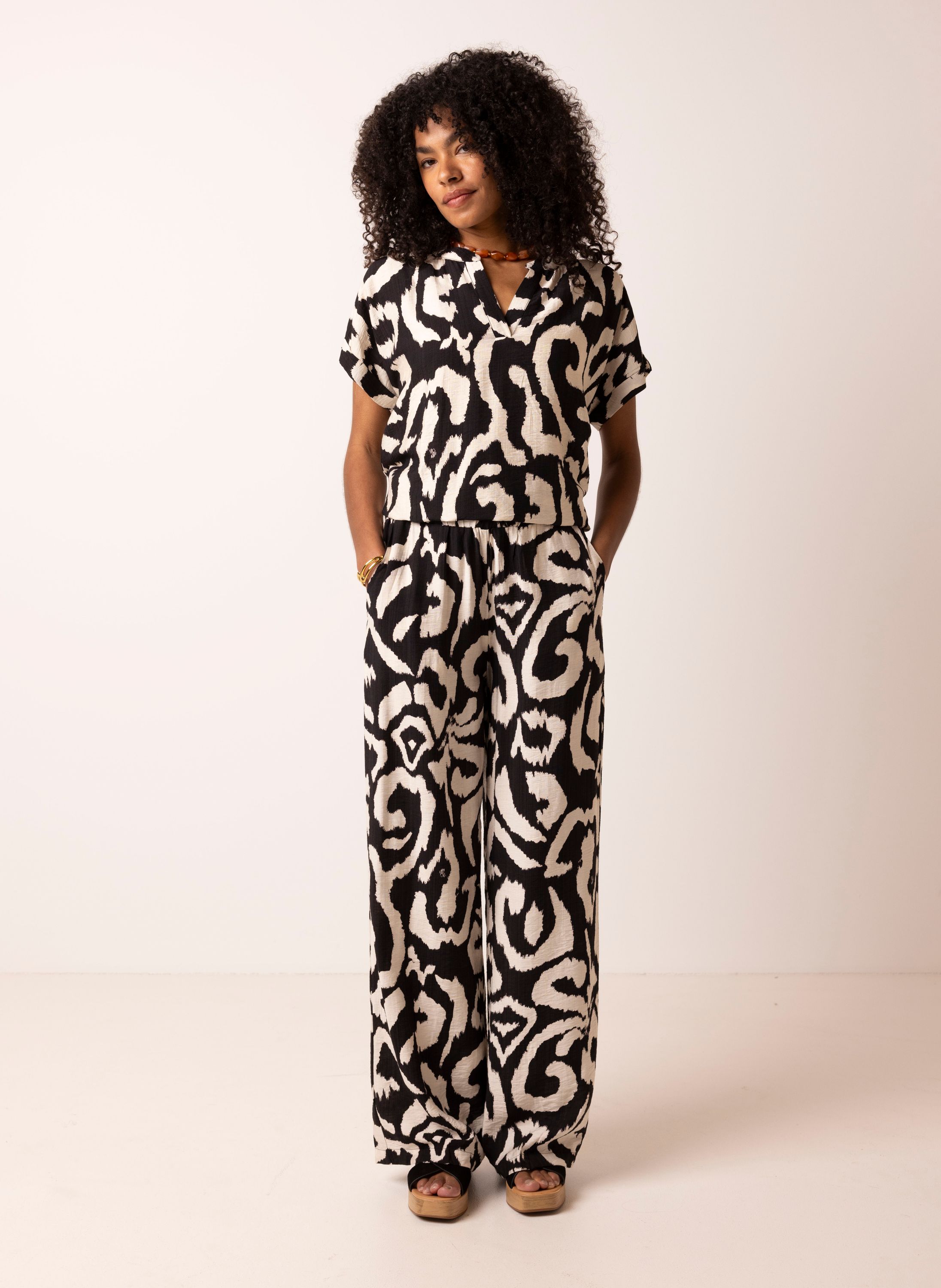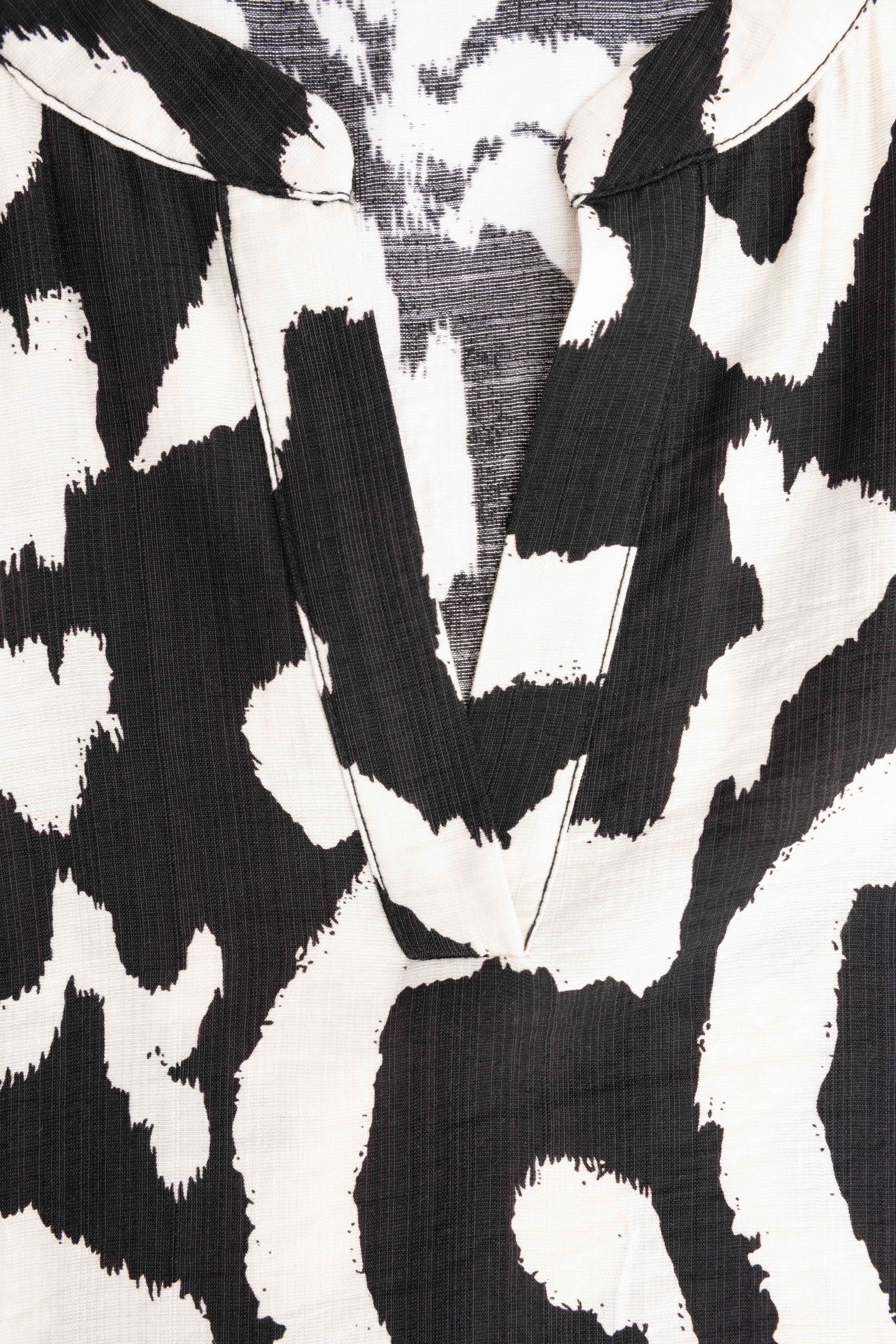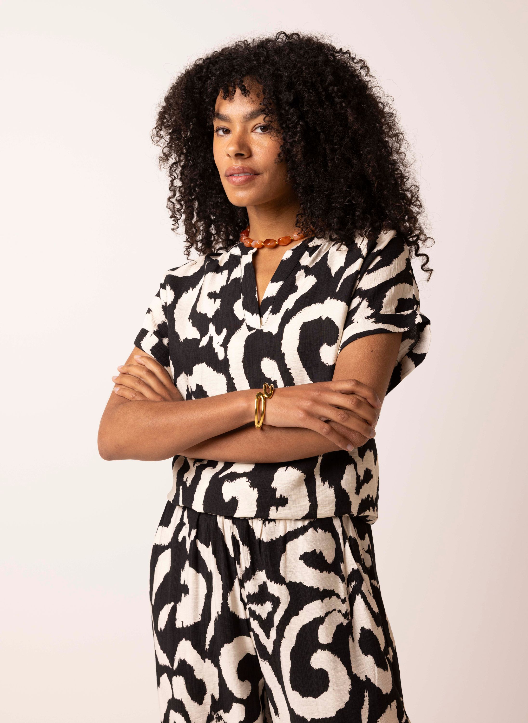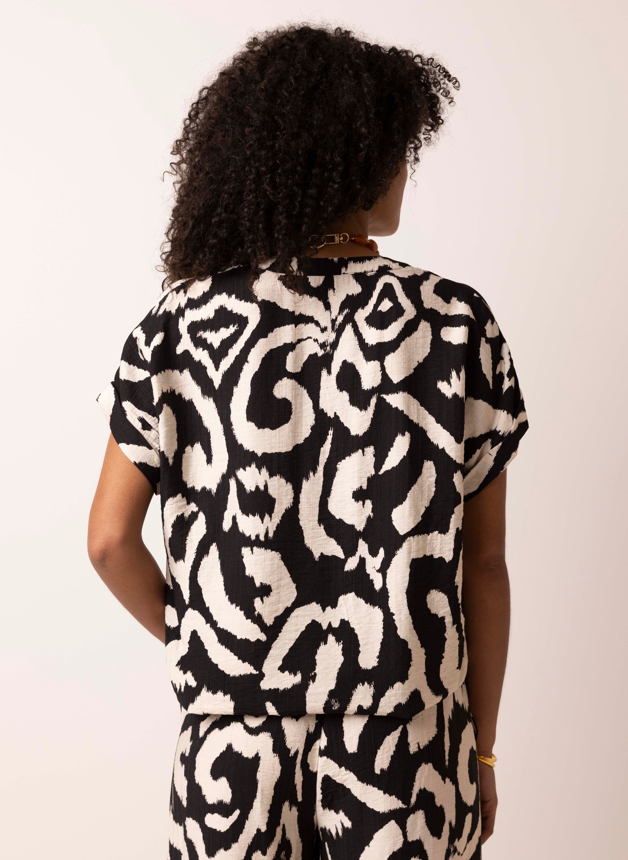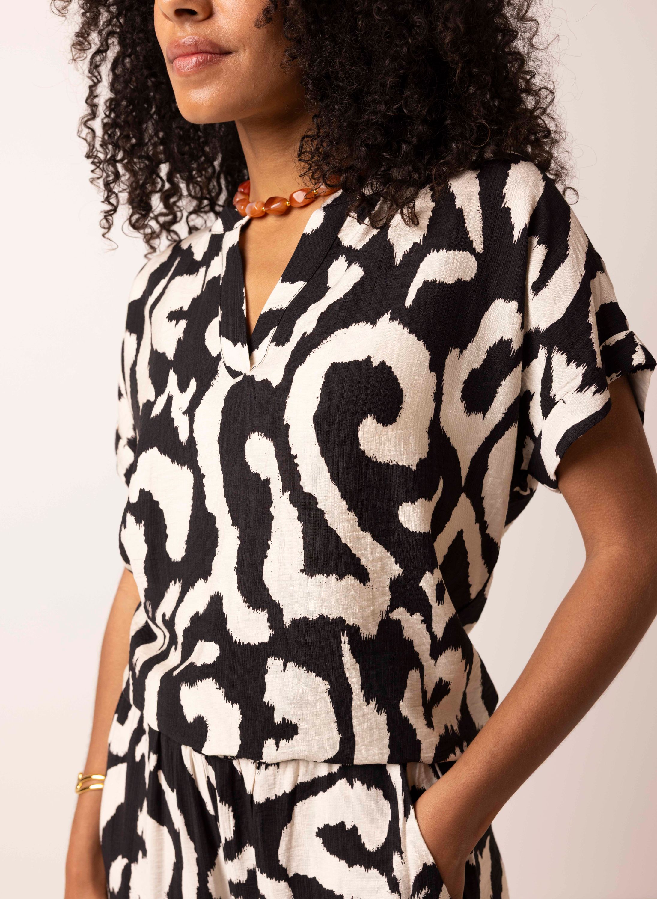 Deze losvallende blouse met V-hals en aangeknipte korte mouwen heeft een luchtige uitstraling.