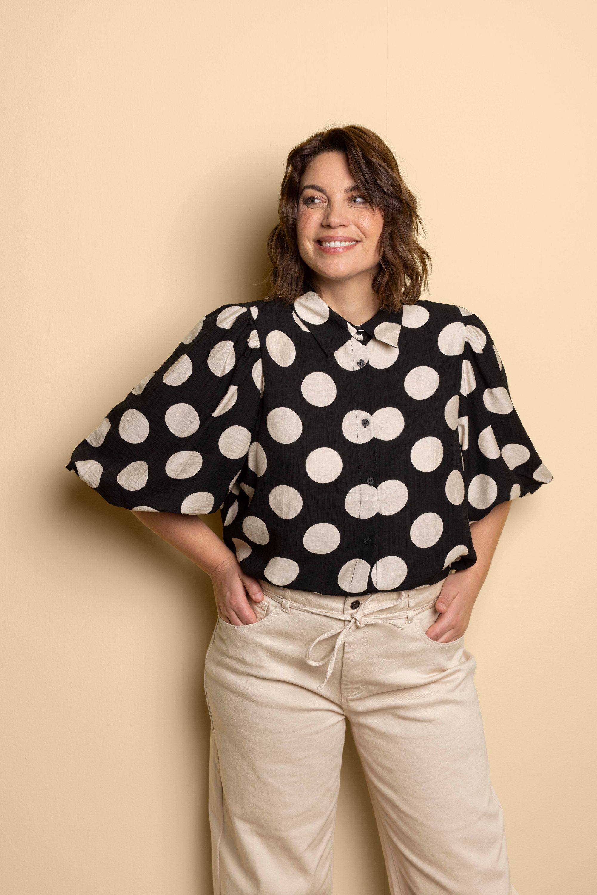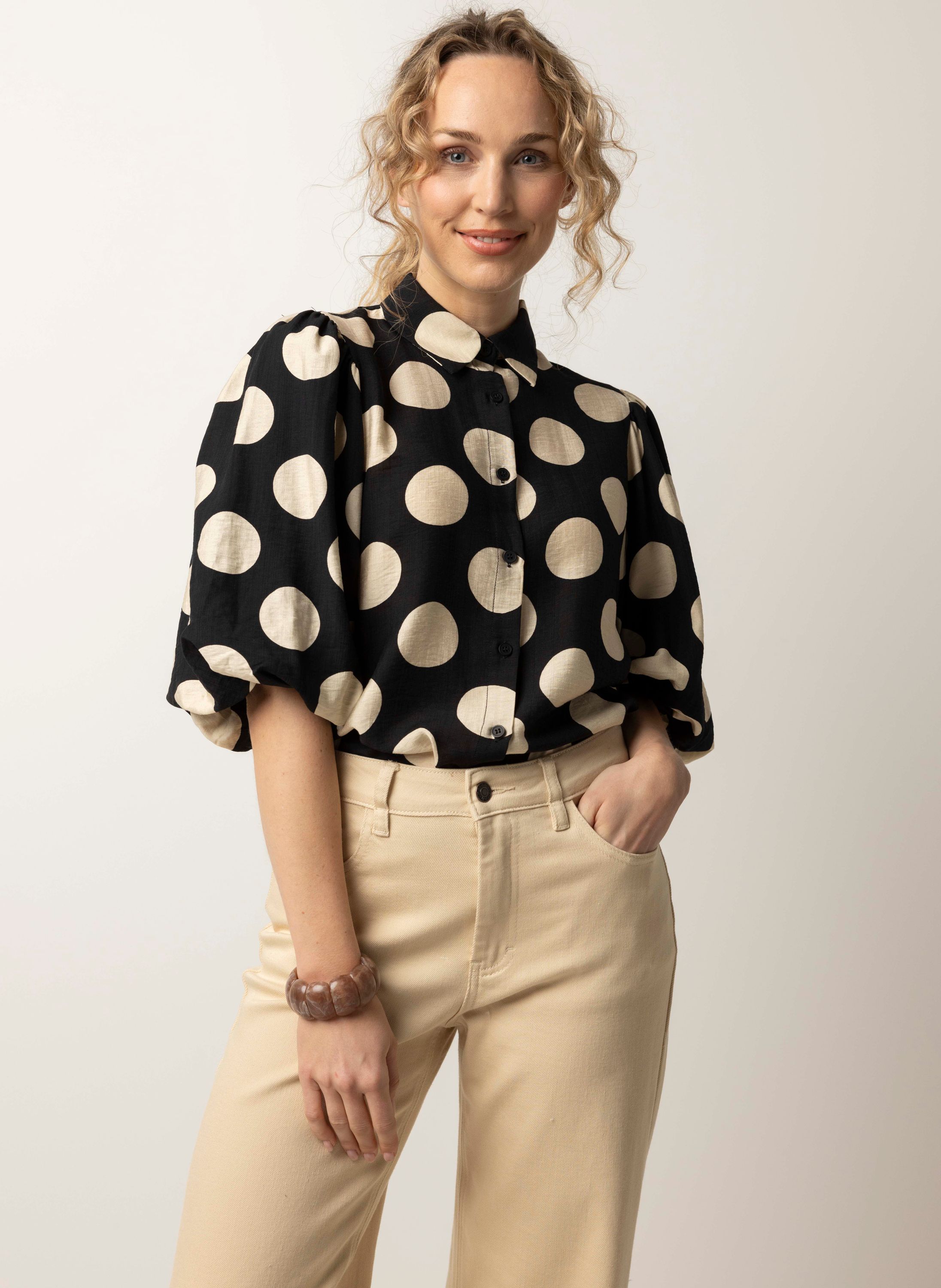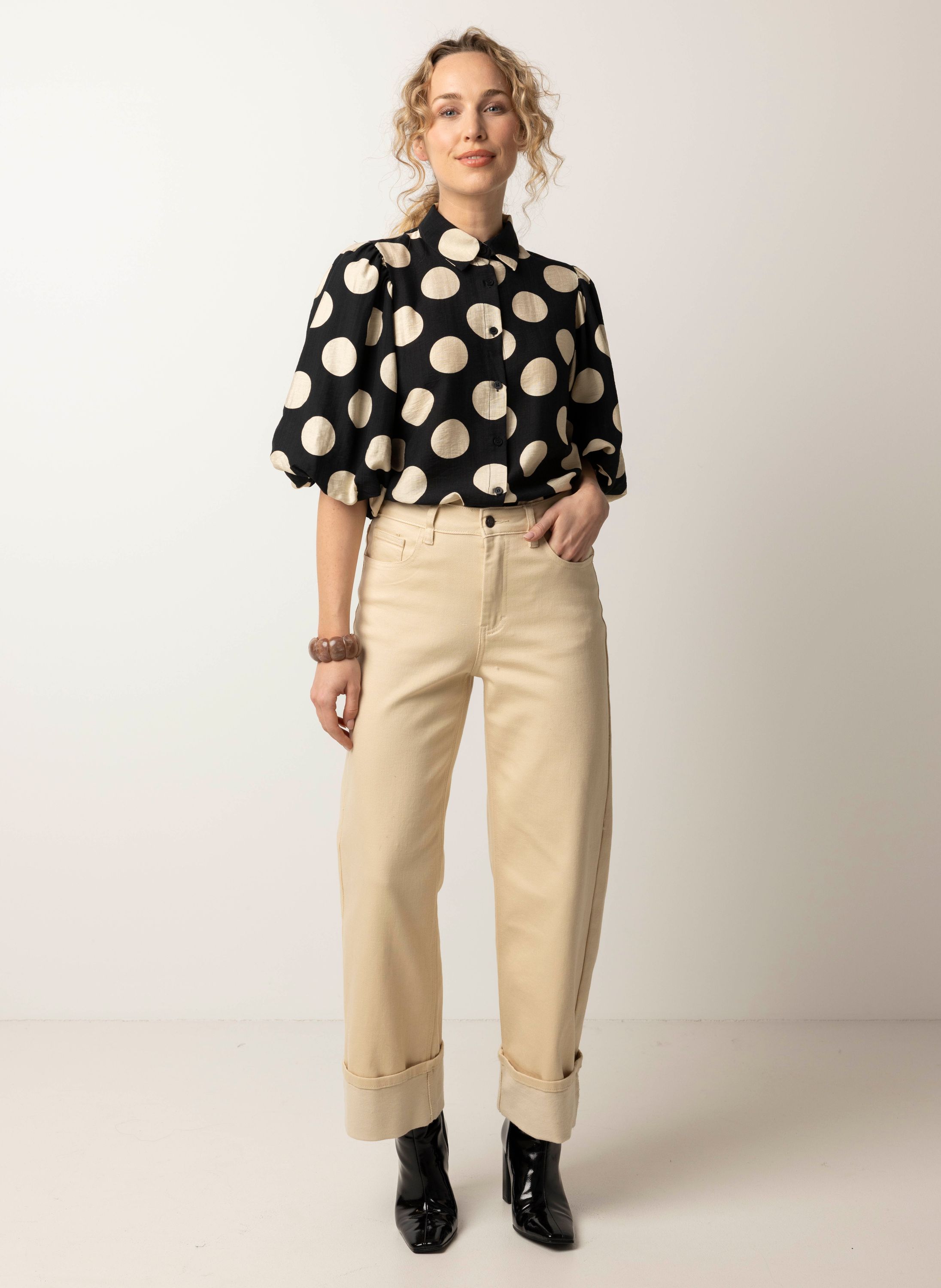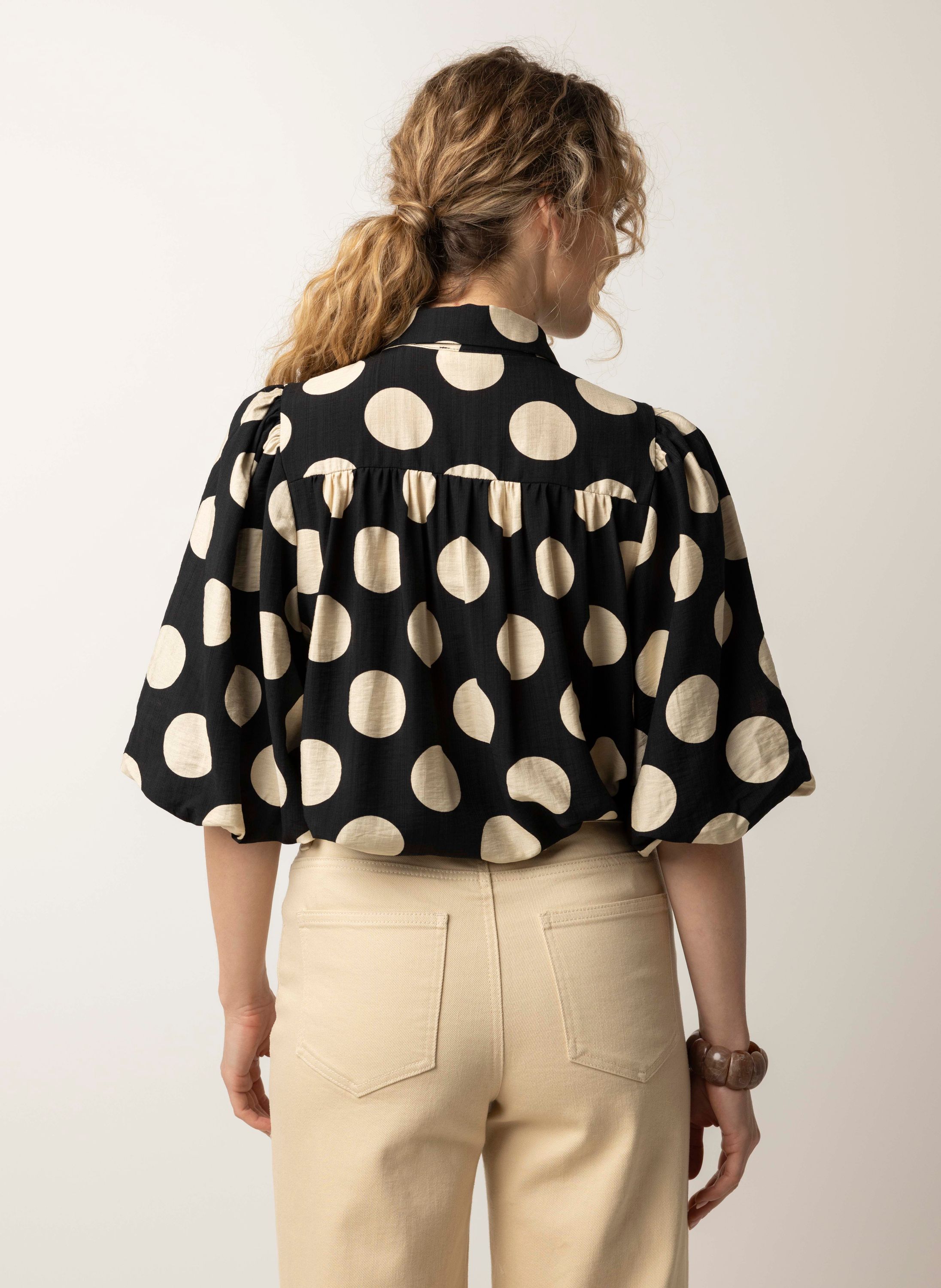 Zwart/ecru blouse met polkadots