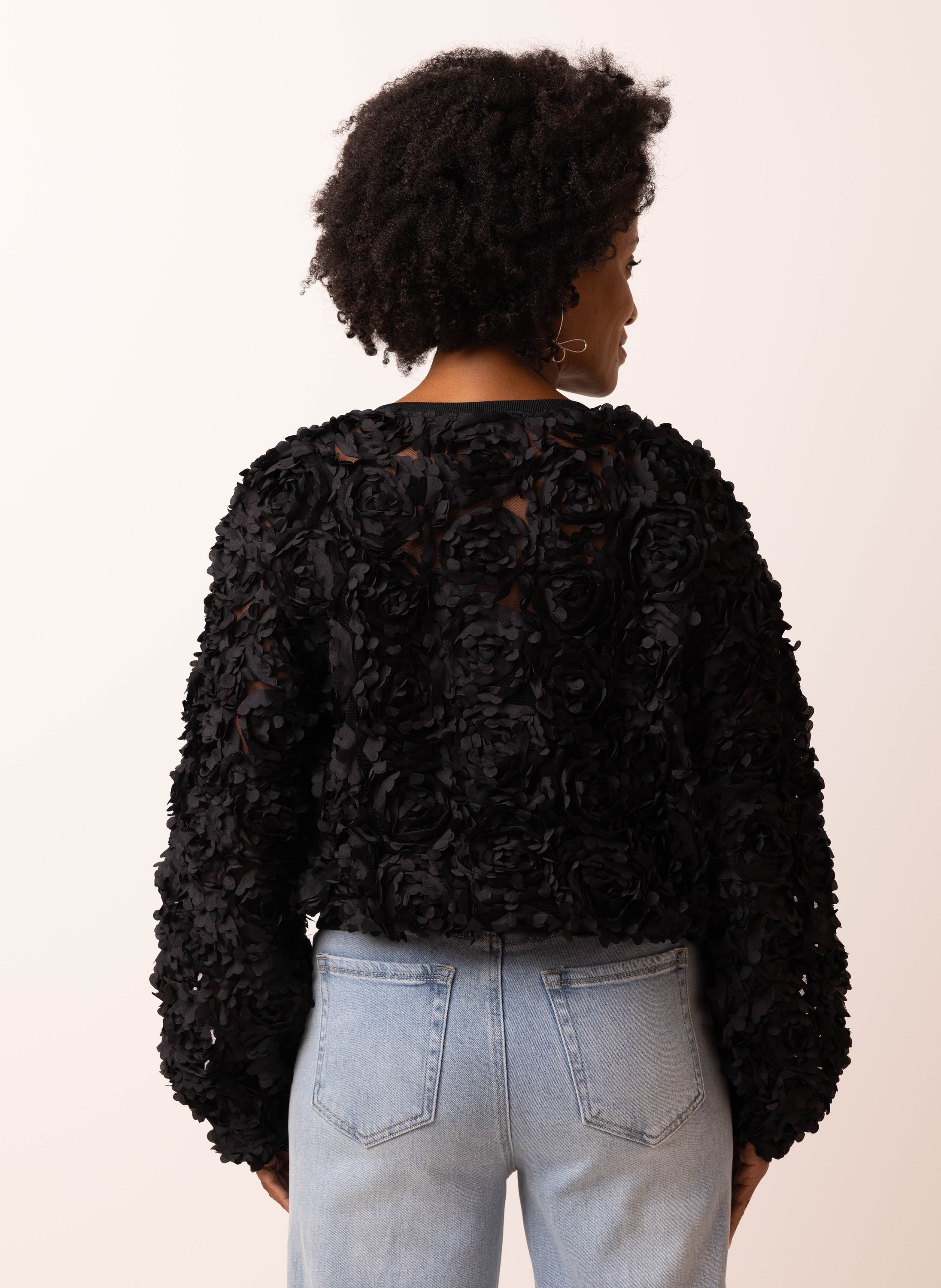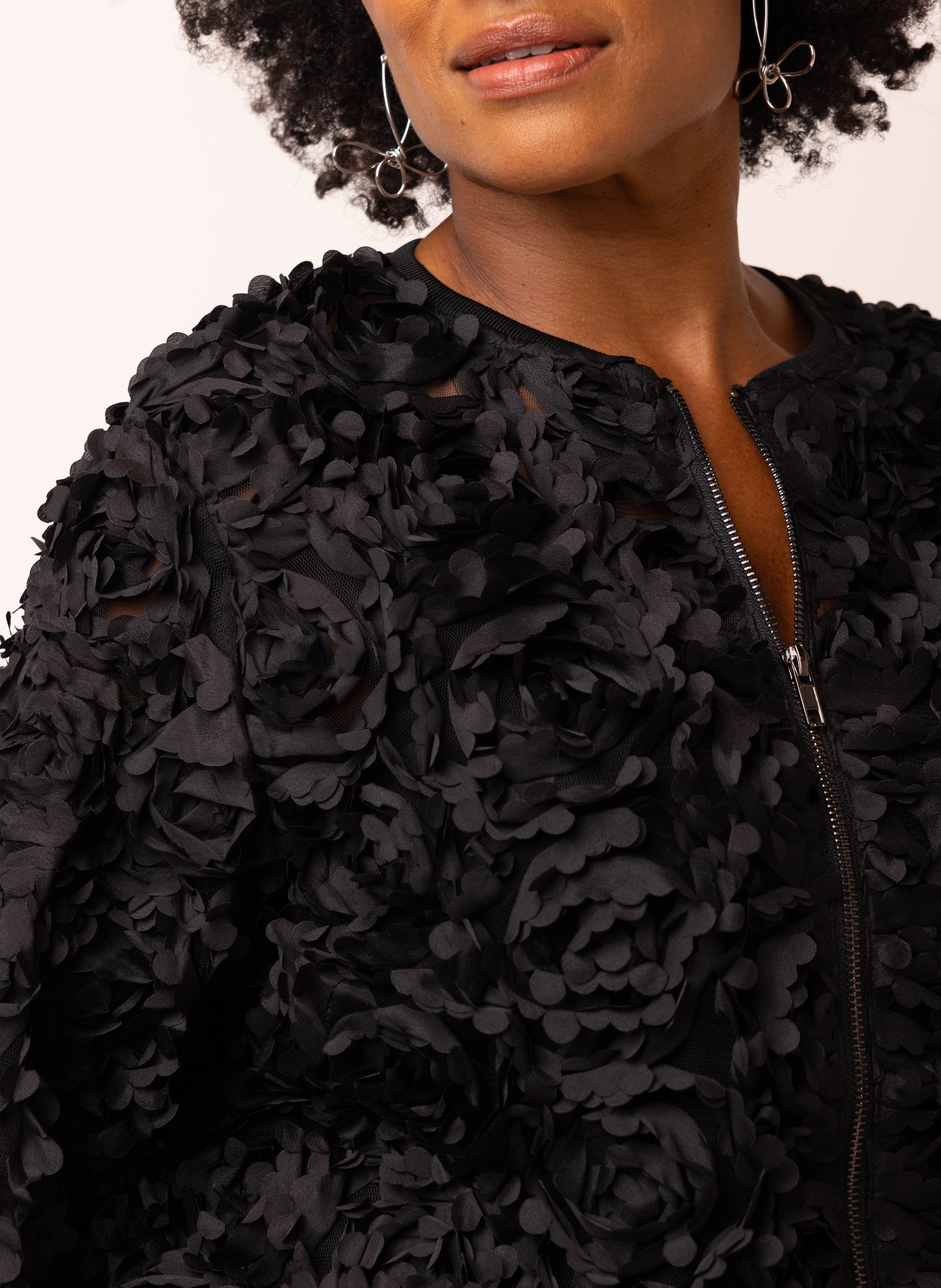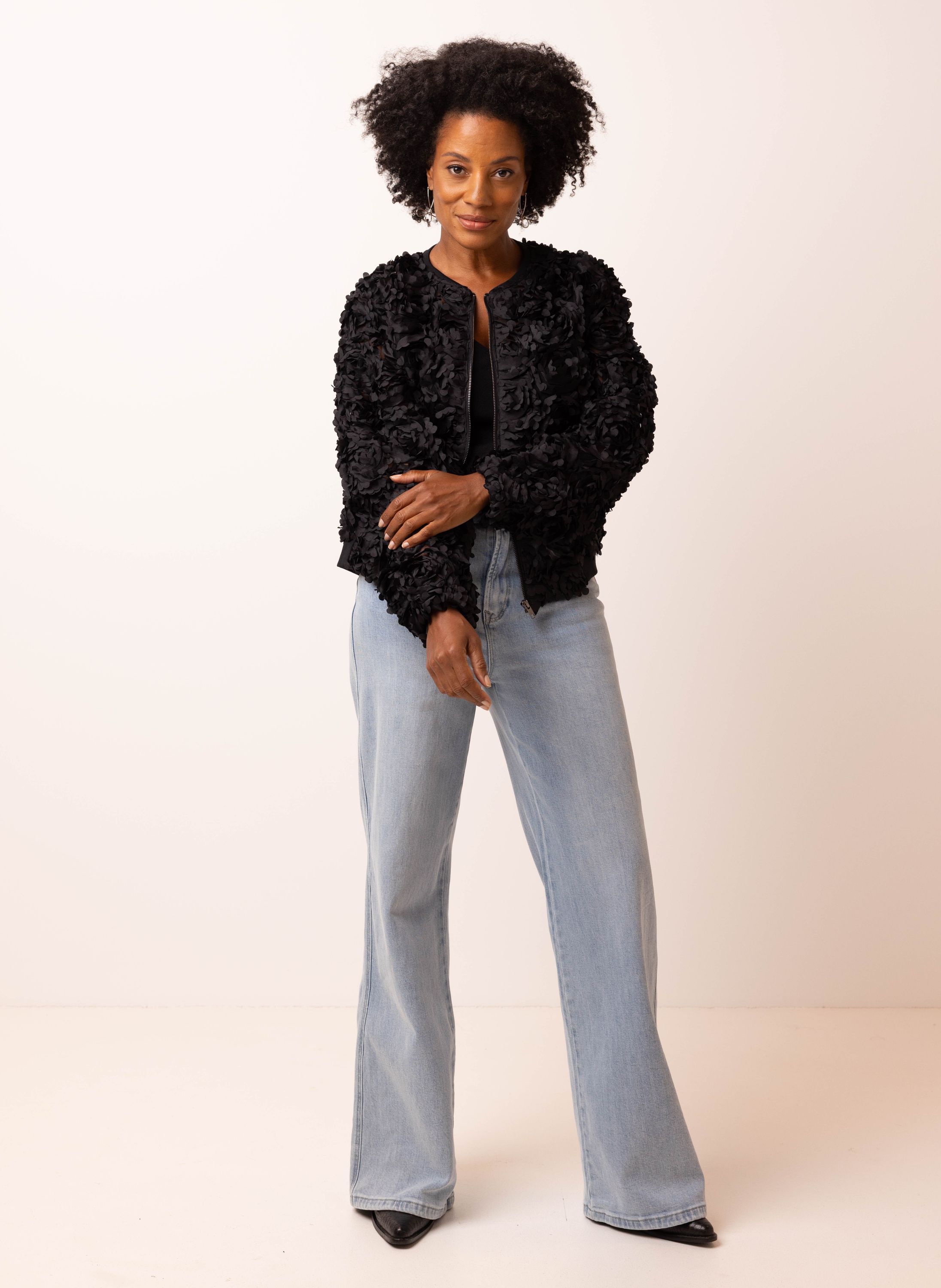 Dit jasje met ronde hals en ritssluiting heeft lange mouwen en een elastische band aan de onderzijde, uitgevoerd in een deels transparante stof.