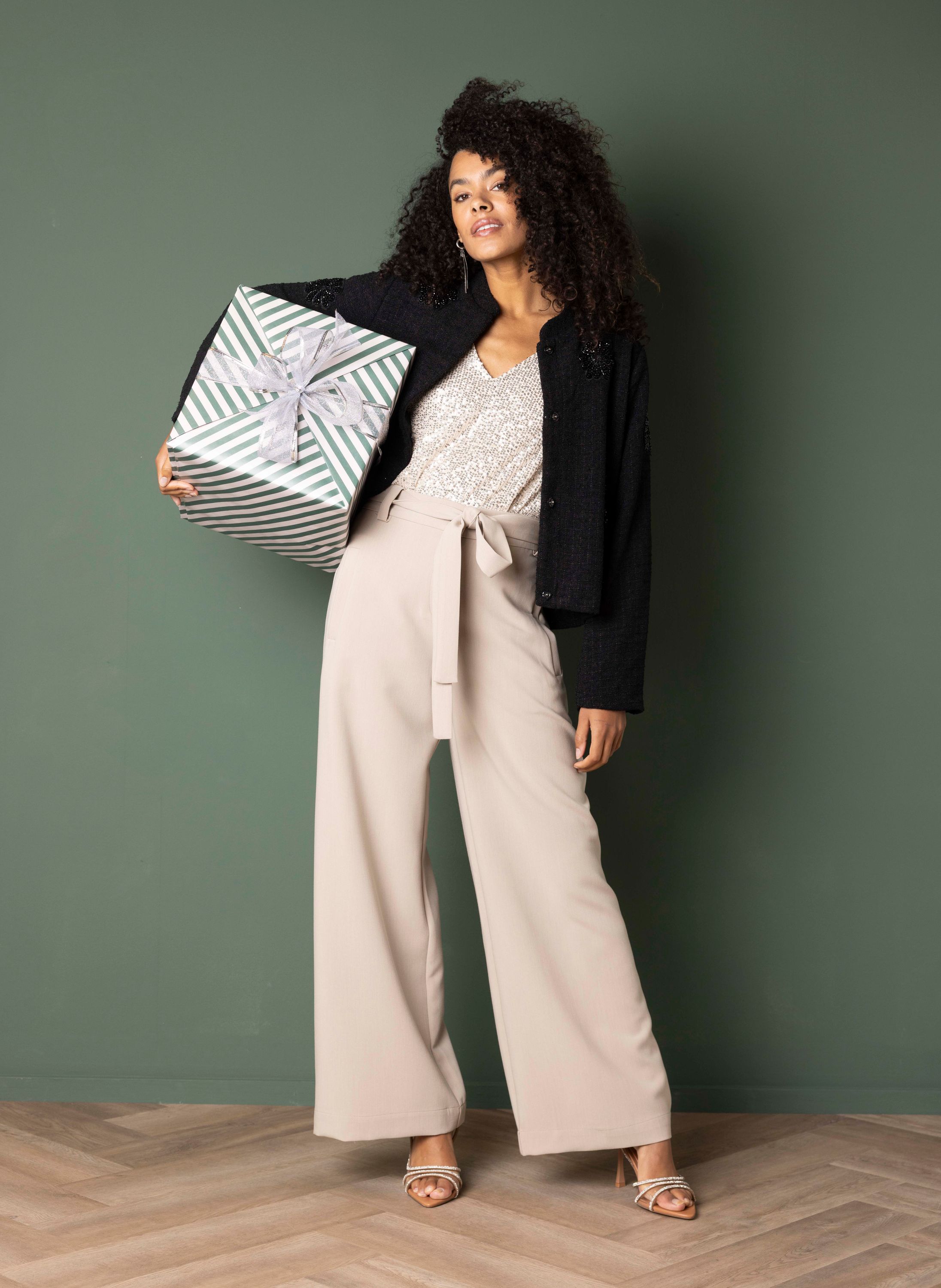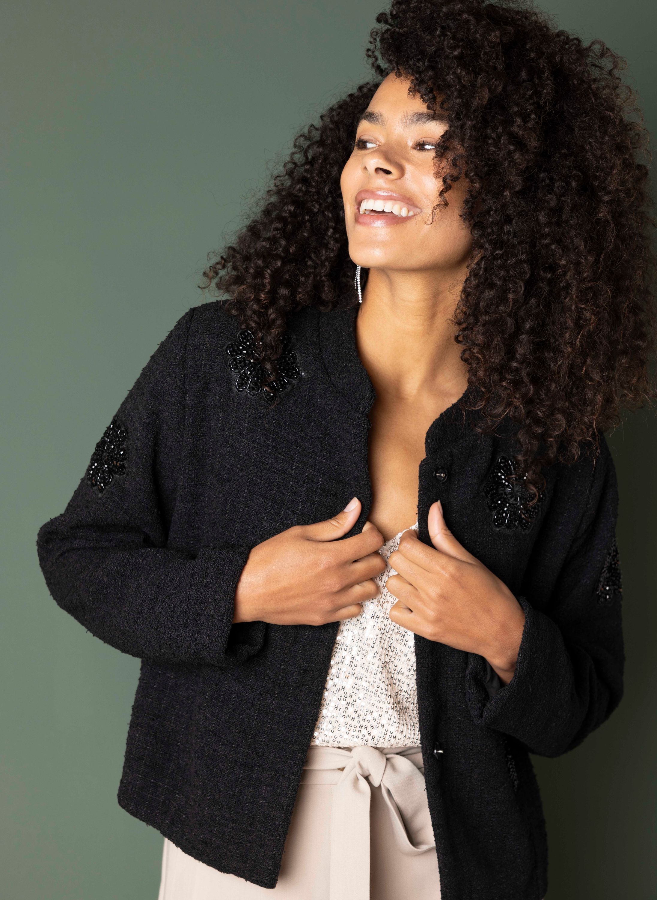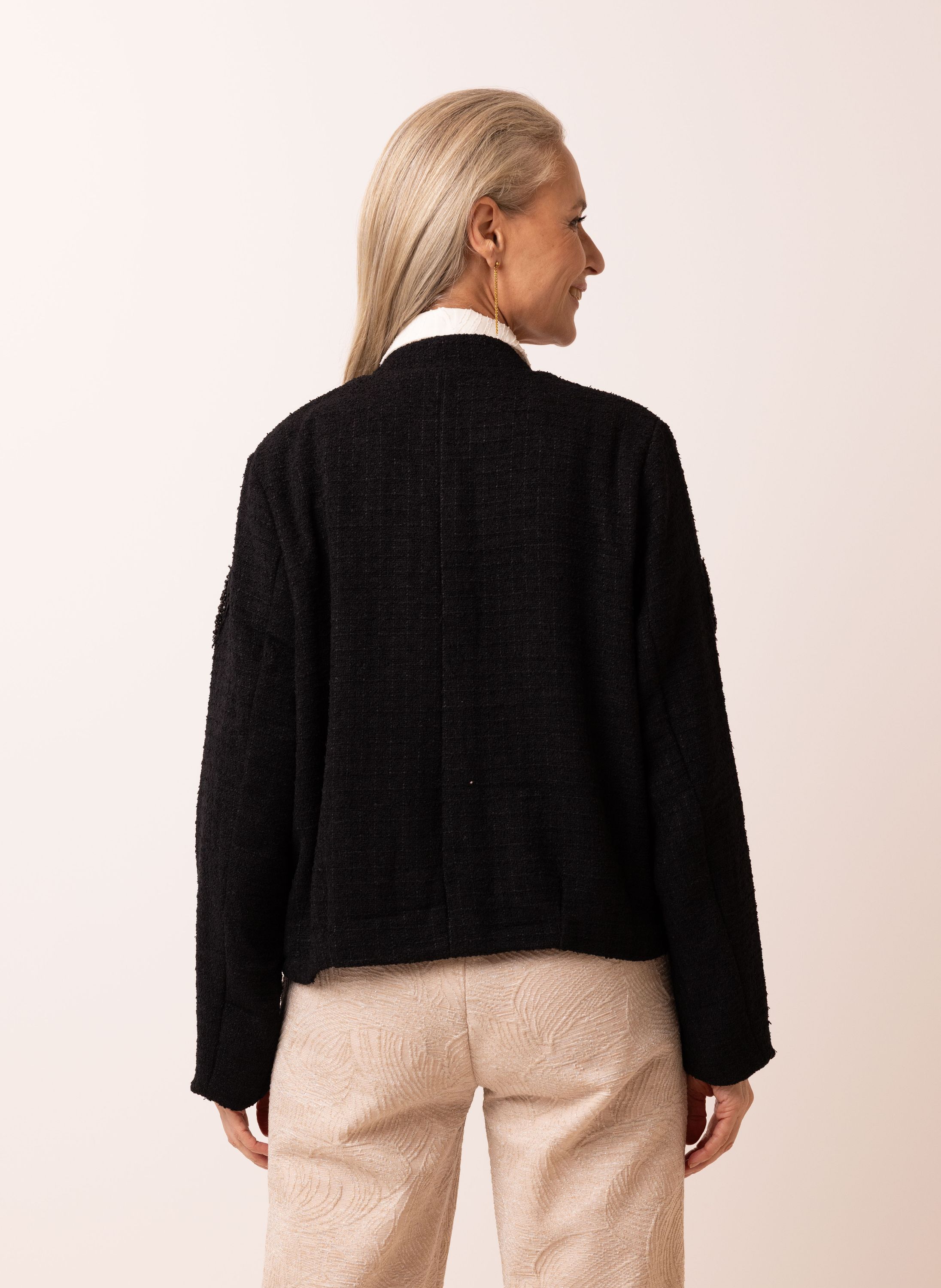 Dit jasje met ronde hals, steekzakken, blinde knoopsluiting en lange mouwen heeft een feestelijke look.