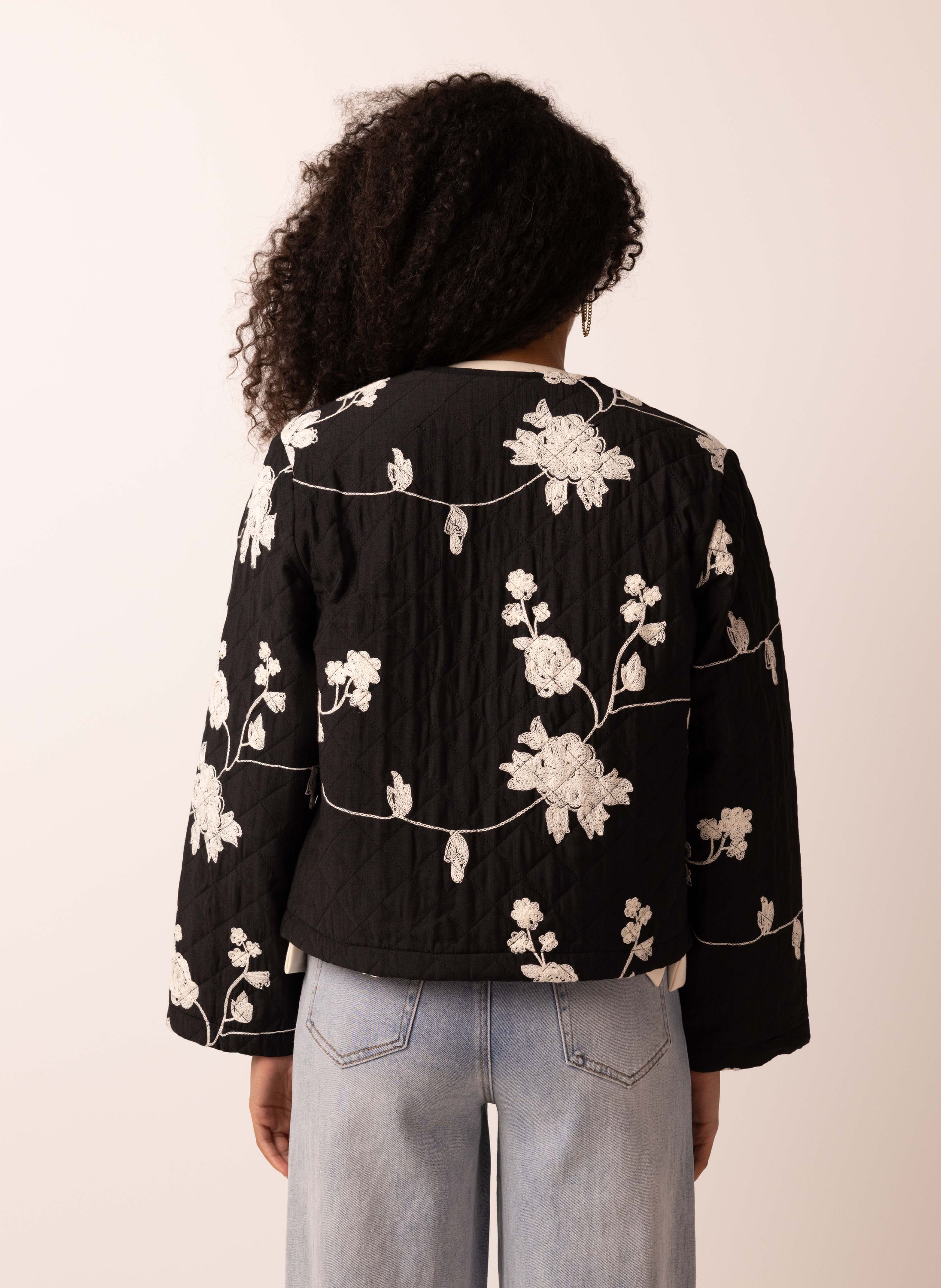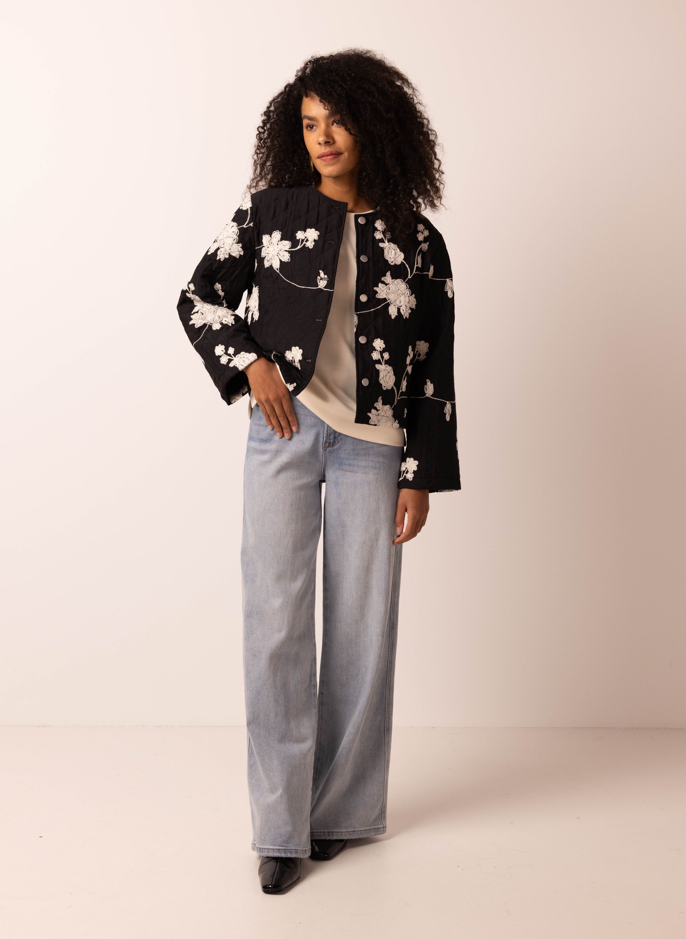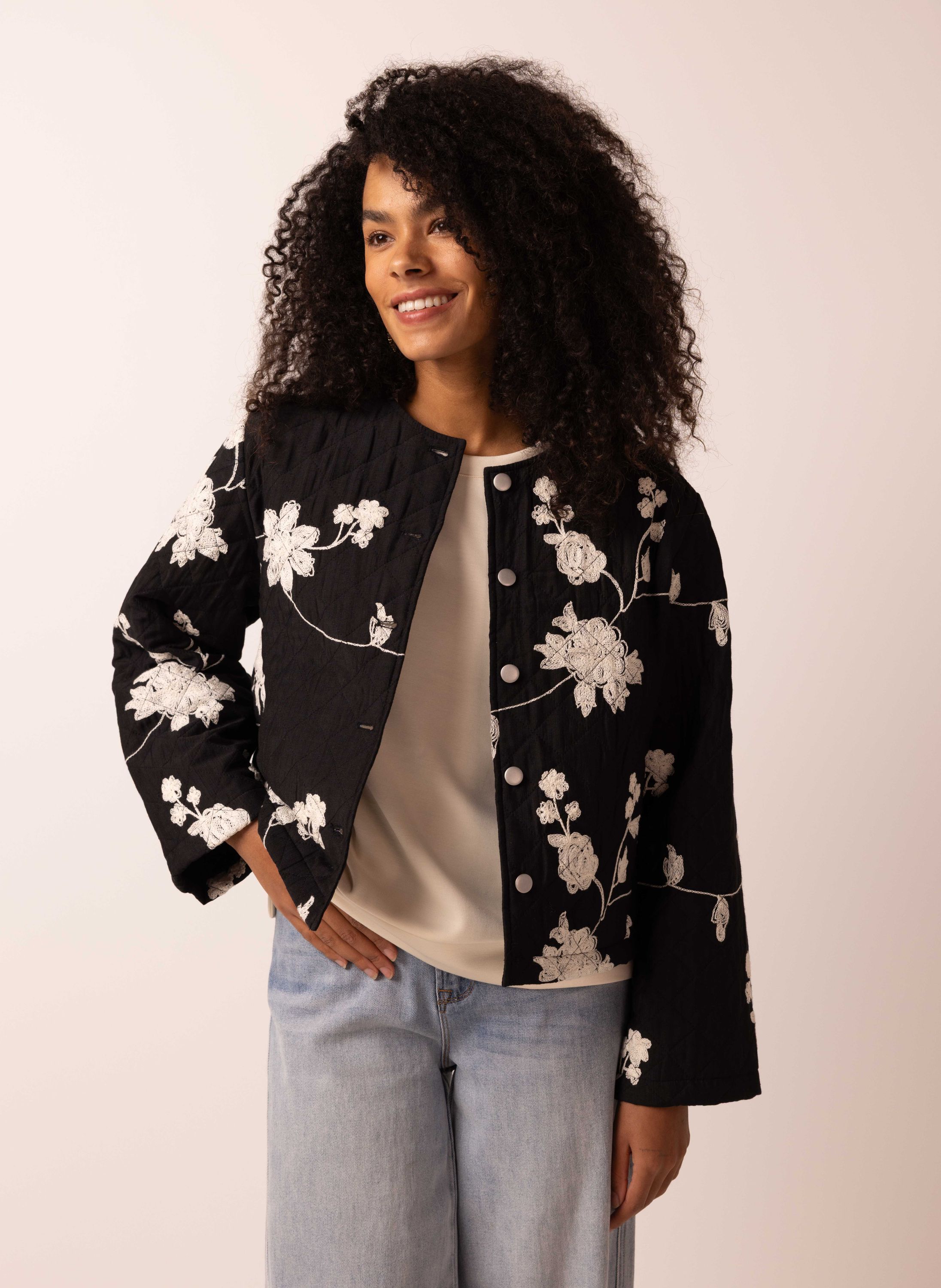Dit zwarte jasje heeft een ronde hals, knoopsluiting, steekzakken en lange mouwen. Het bloemendessin geeft het jasje een opvallende en vrouwelijke uitstraling. Mooi te dragen als licht jasje of als stijlvol laagje over een top of blouse.