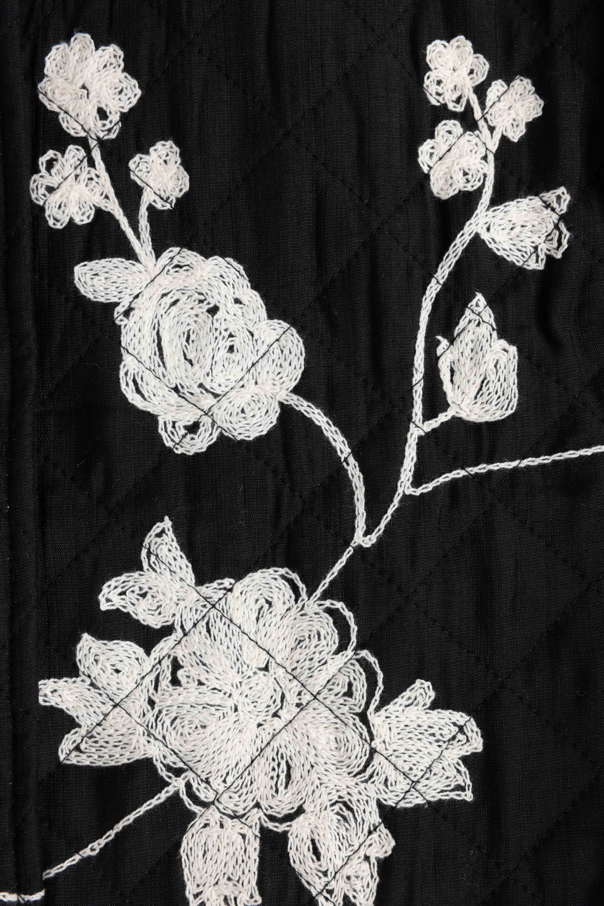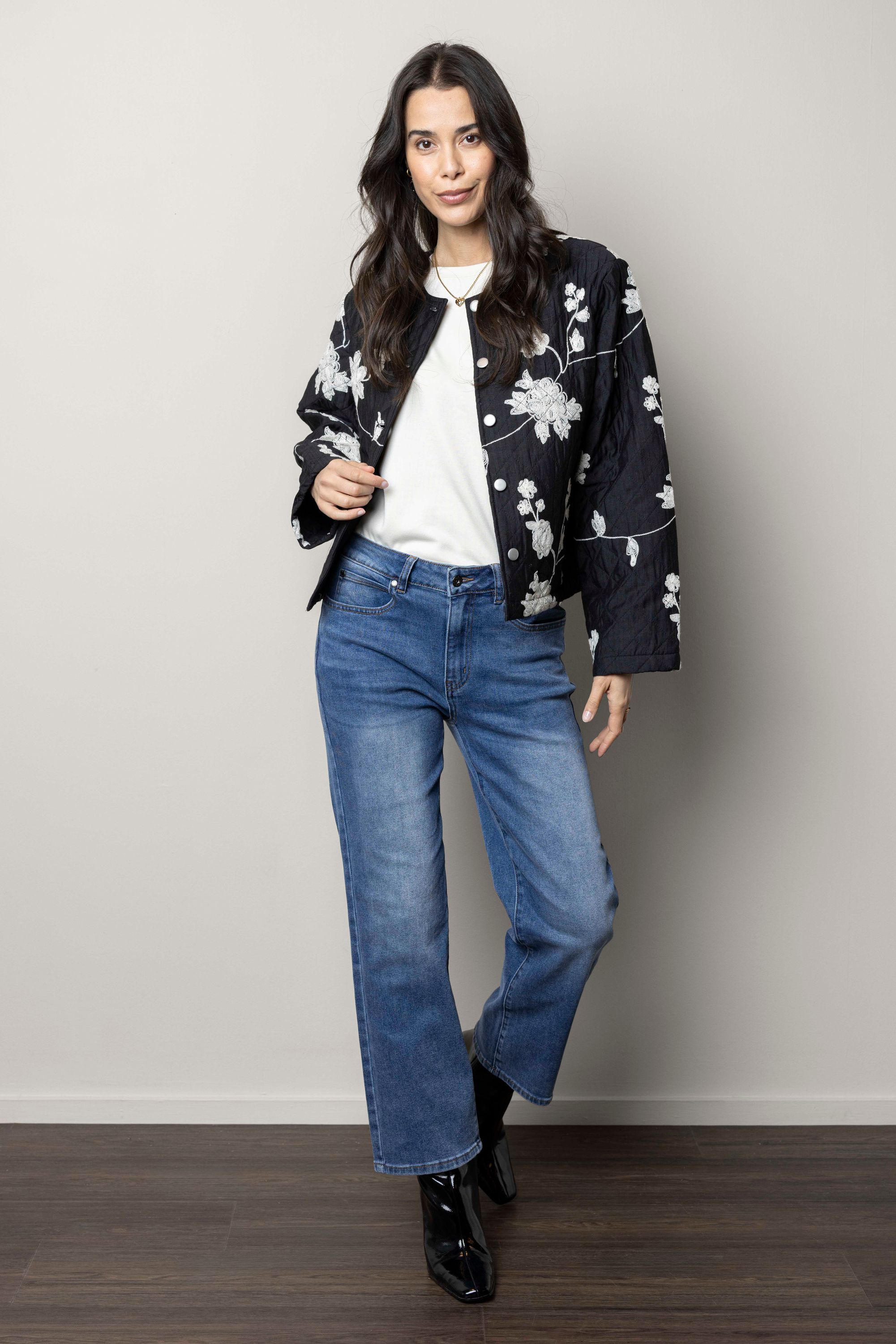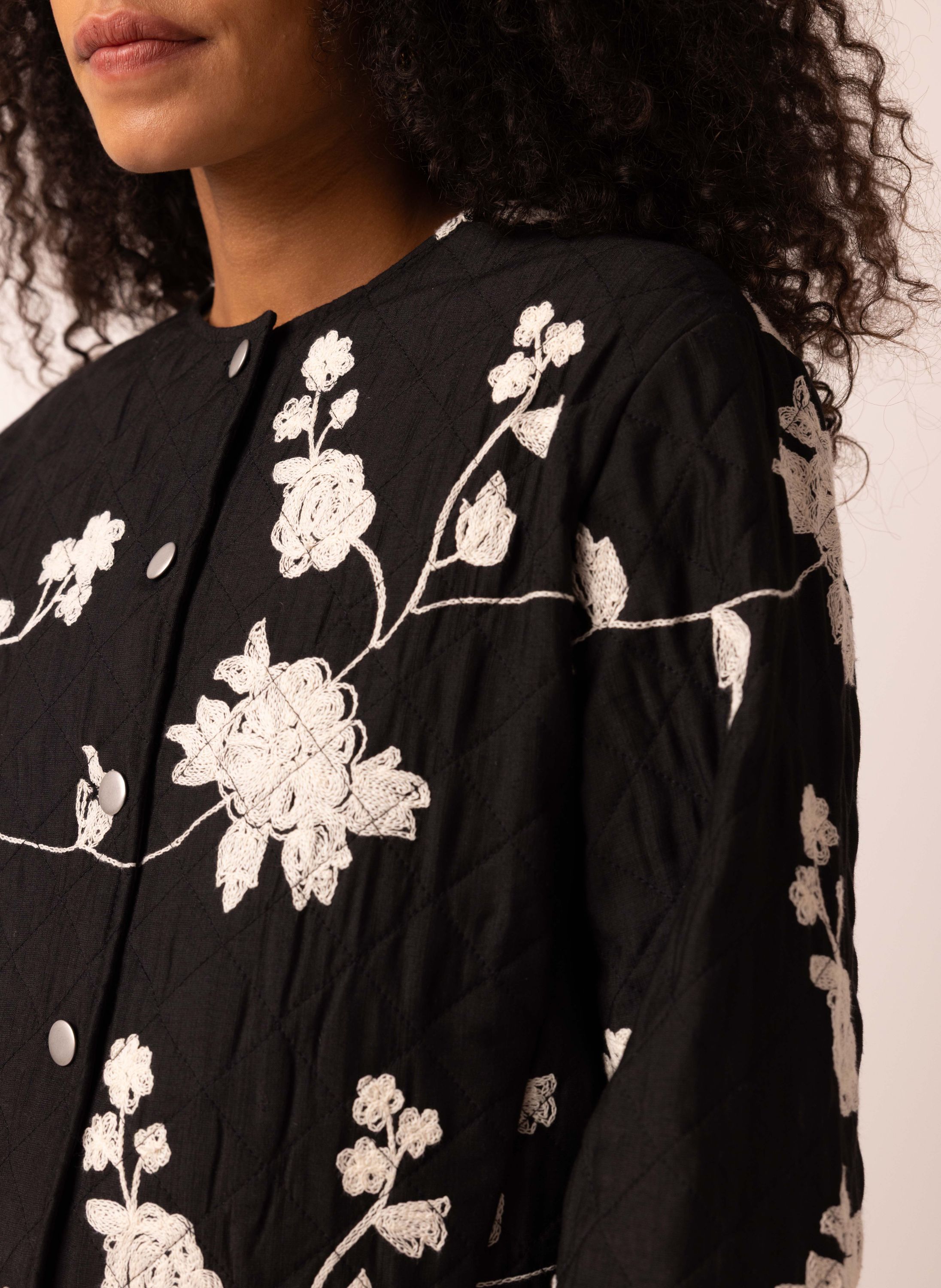 Dit zwarte jasje heeft een ronde hals, knoopsluiting, steekzakken en lange mouwen. Het bloemendessin geeft het jasje een opvallende en vrouwelijke uitstraling. Mooi te dragen als licht jasje of als stijlvol laagje over een top of blouse.