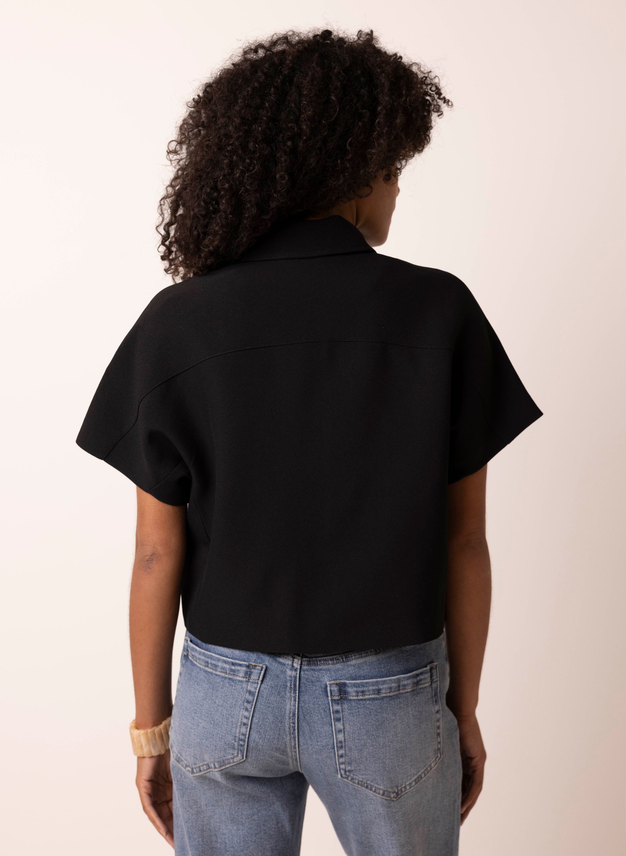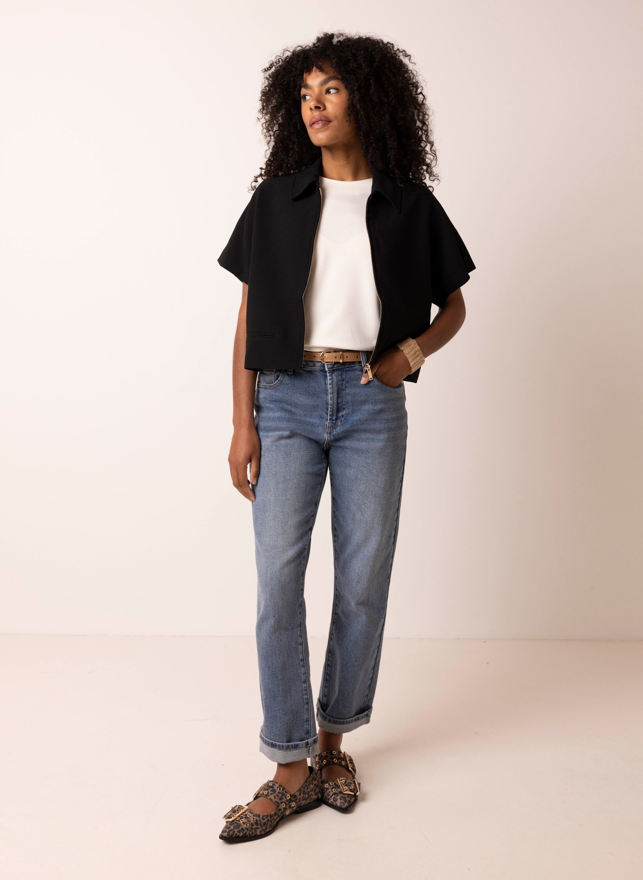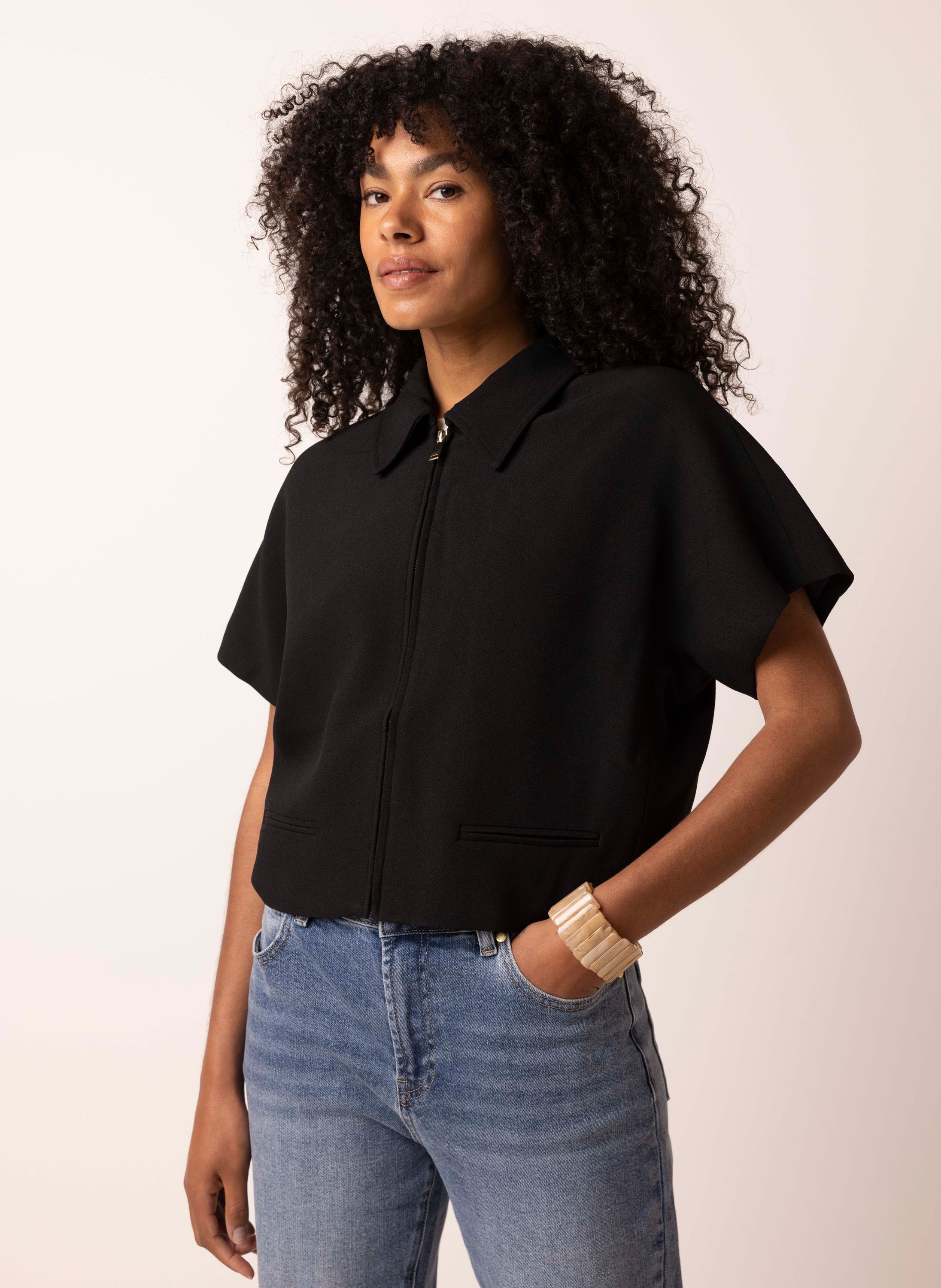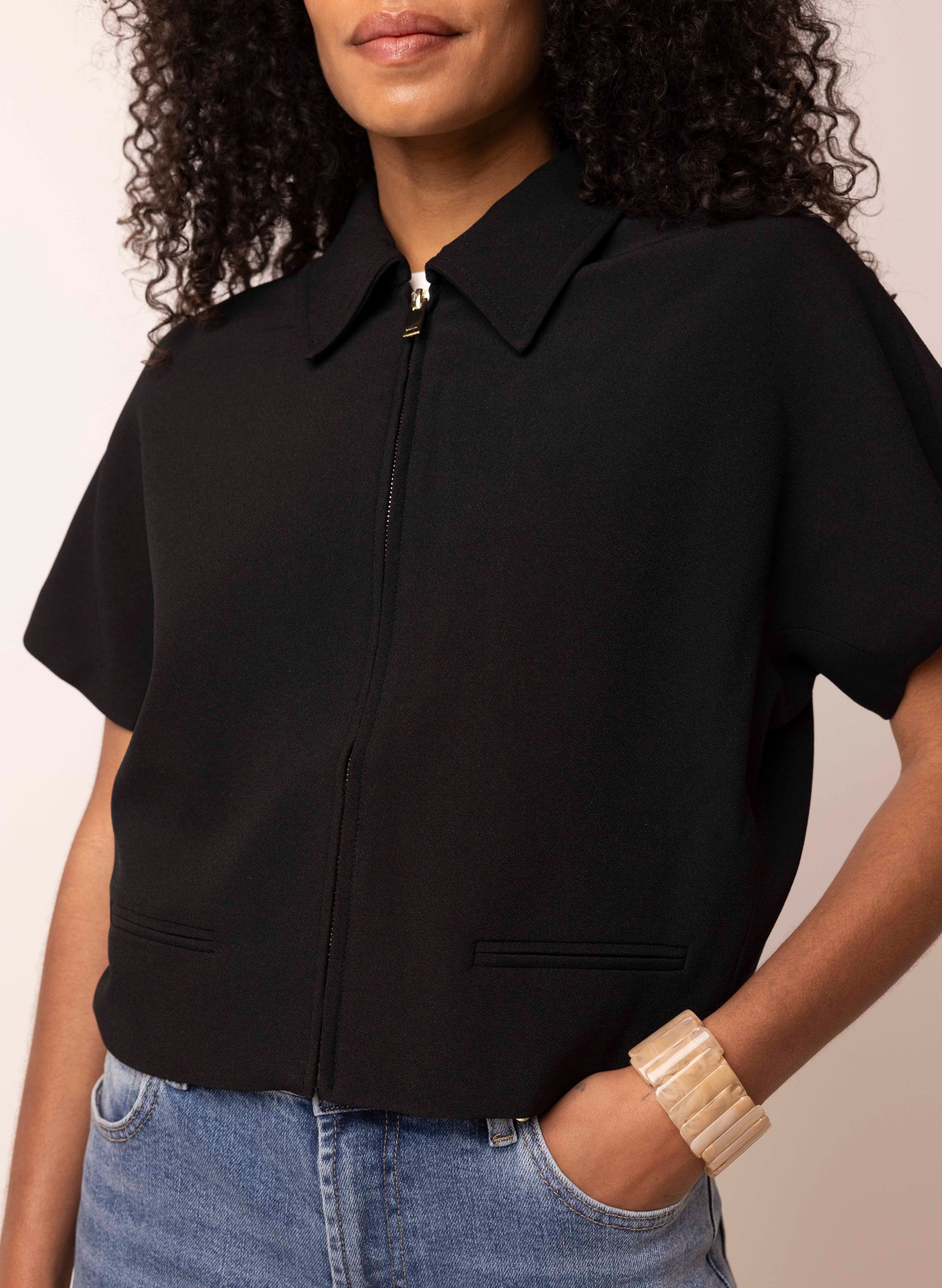 Dit jasje met klassieke kraag, korte mouwen, ritssluiting en decoratieve zakken is een stijlvol item.