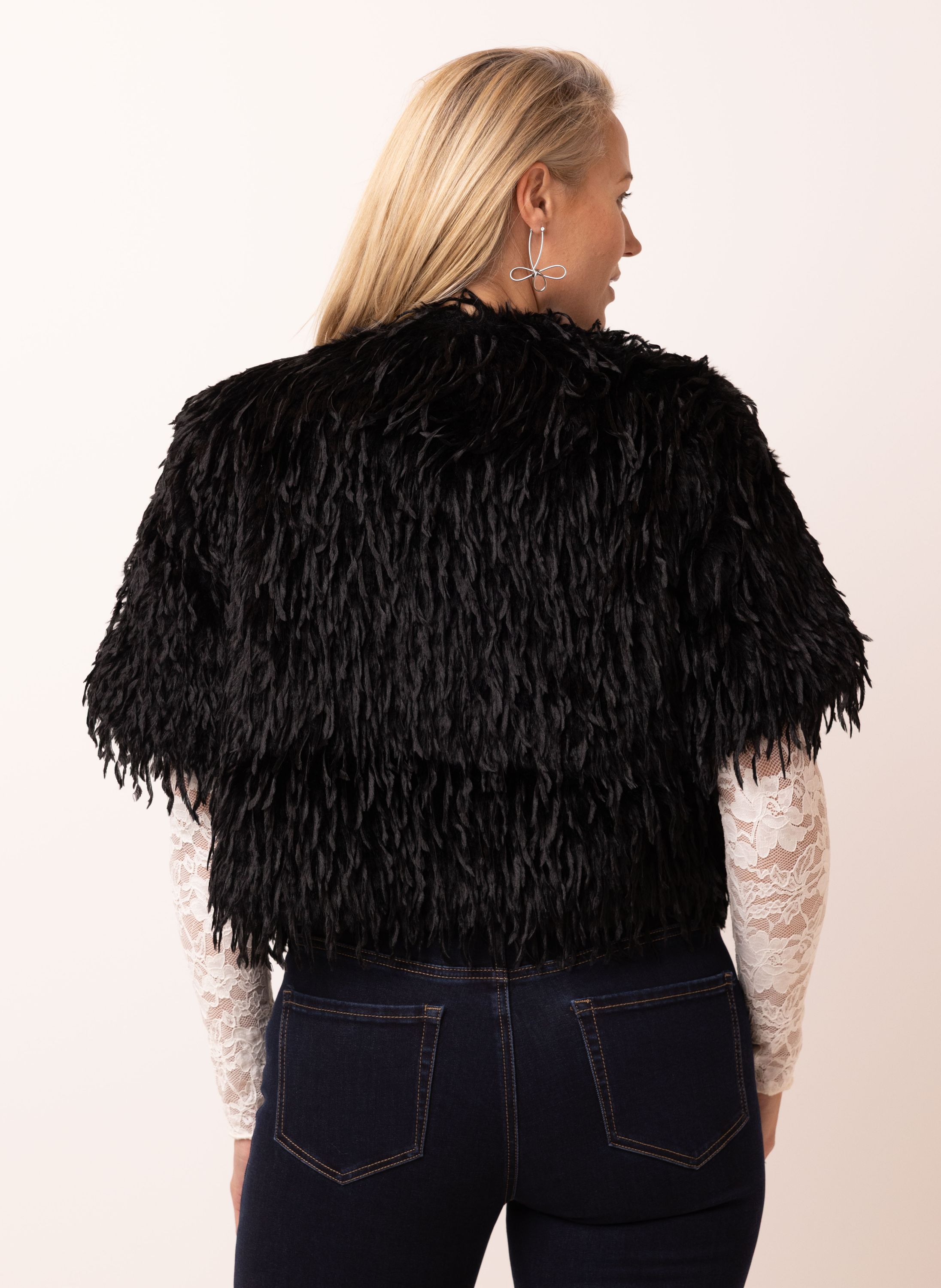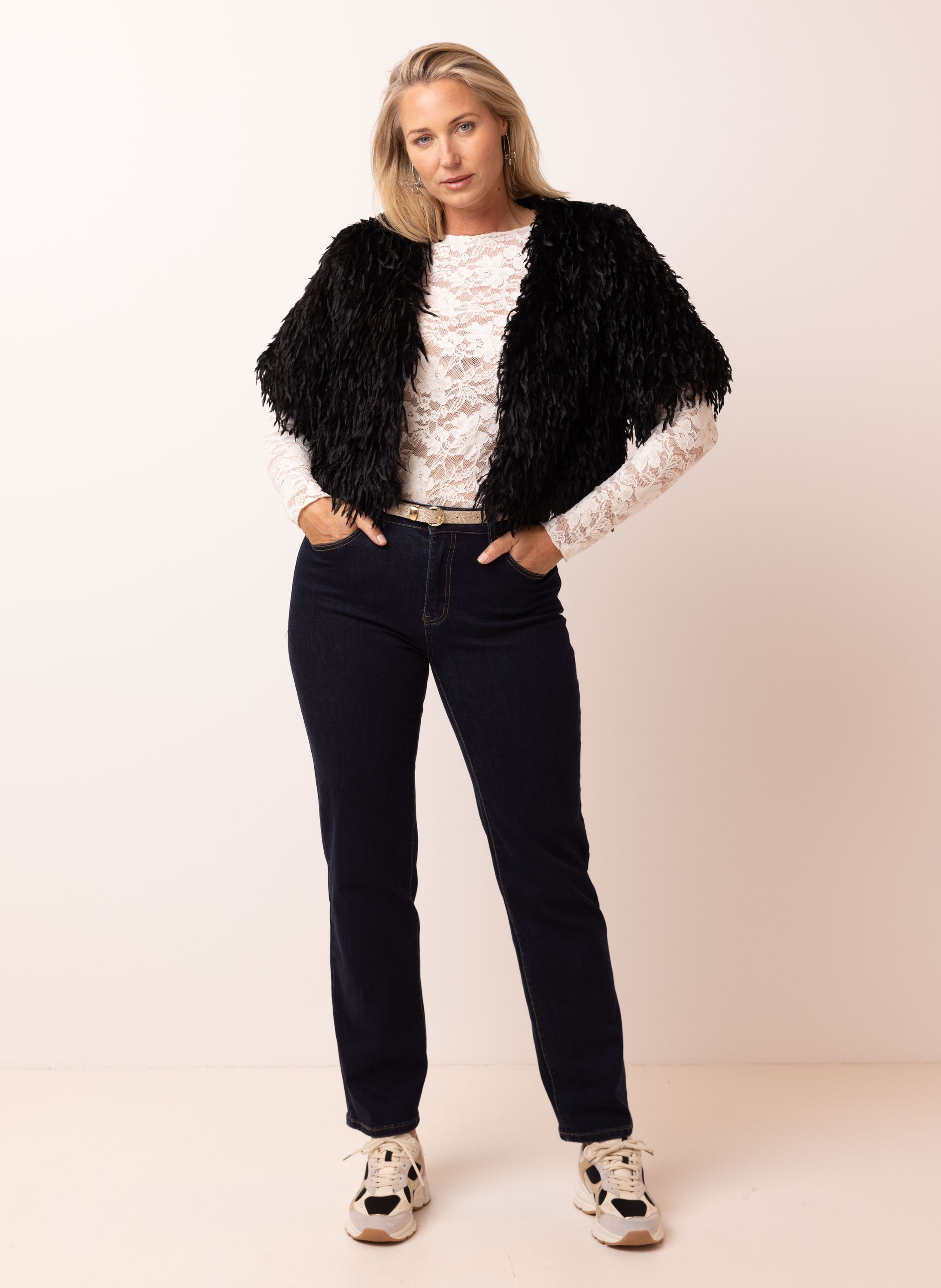 Dit korte jasje met V-hals en halflange mouwen heeft een speelse structuur en is een echte eyecatcher.