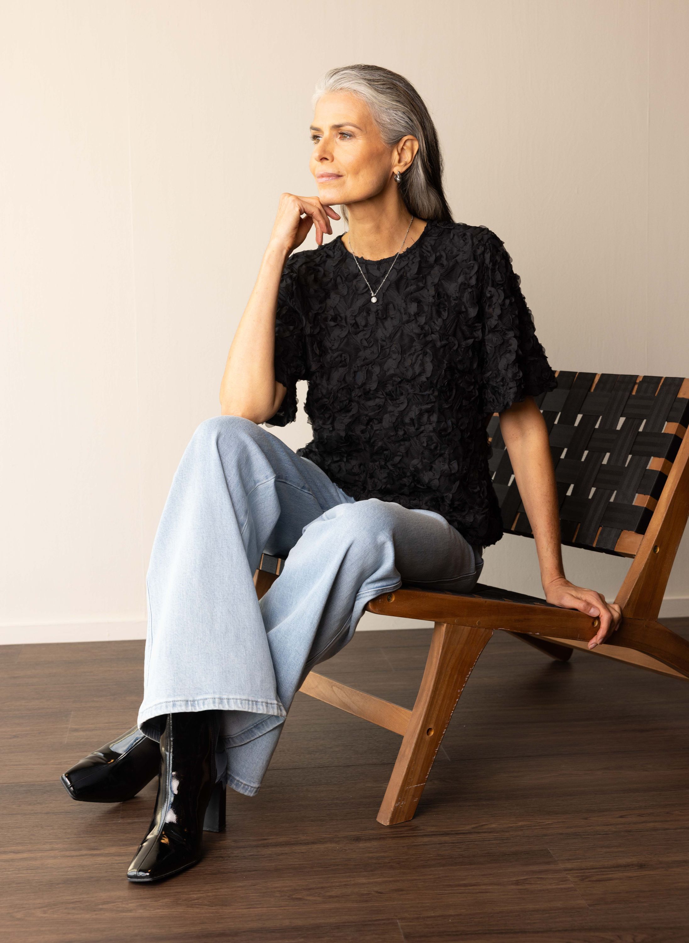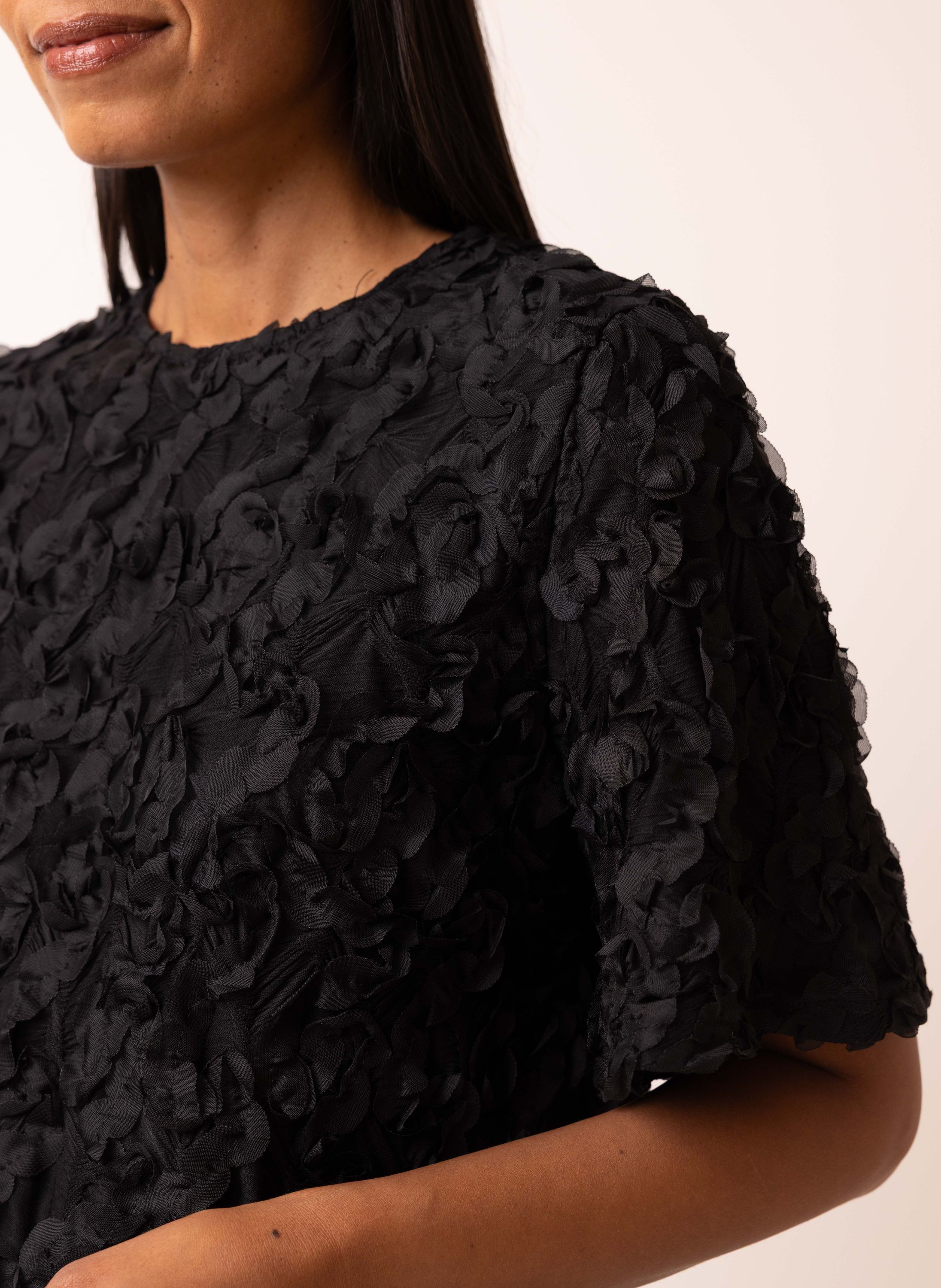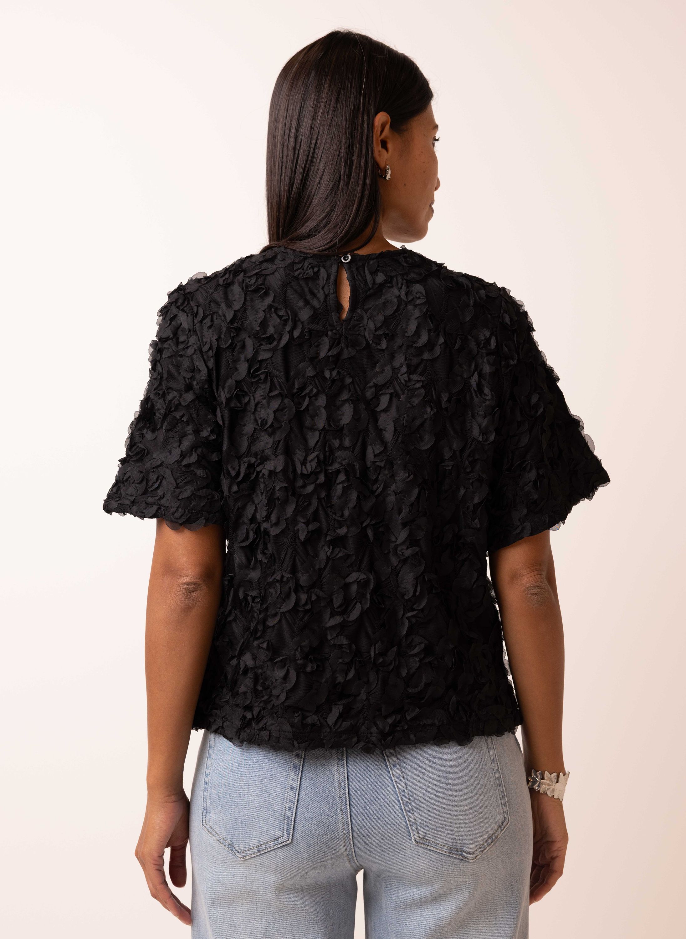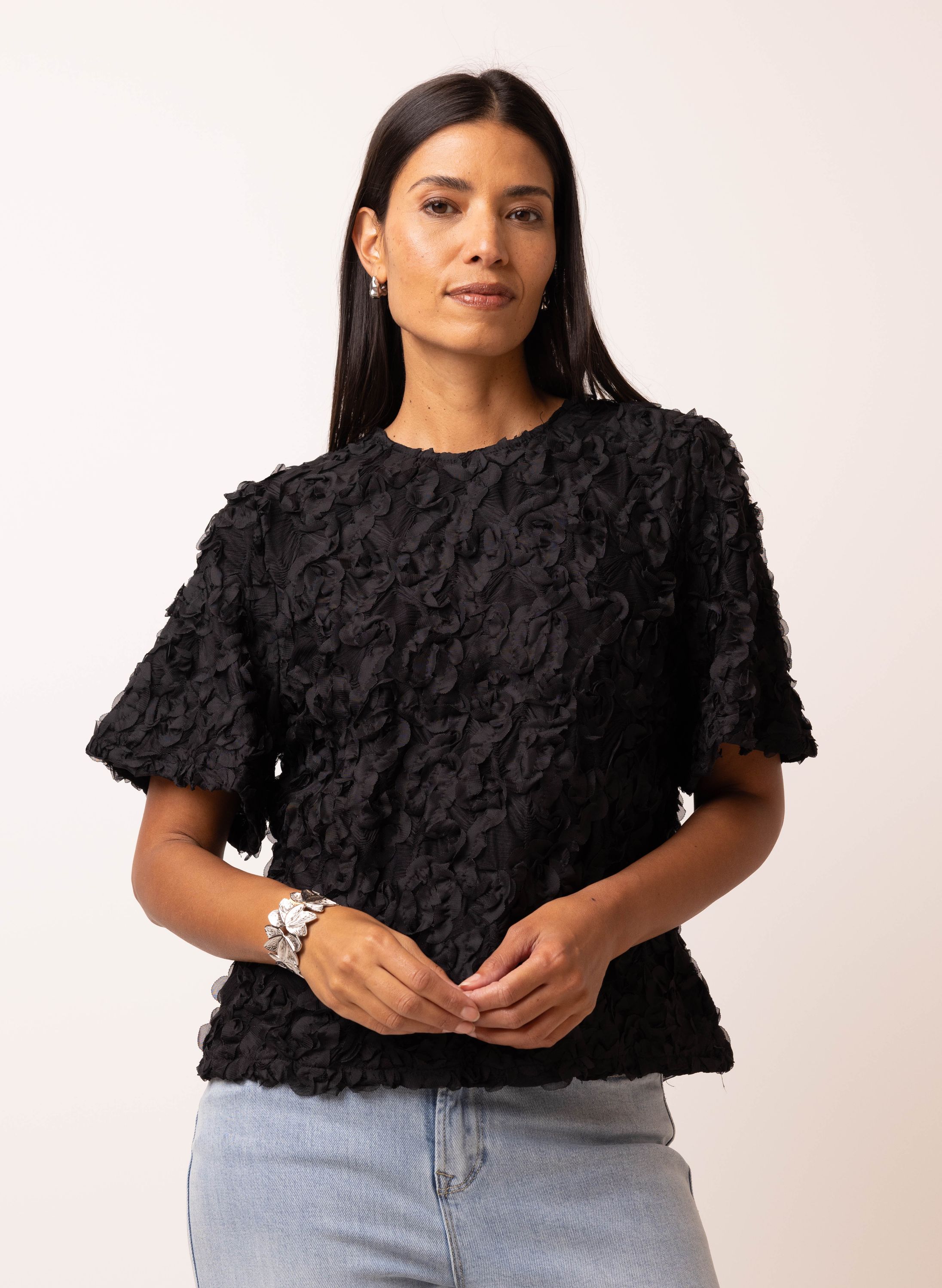 Dit shirt met ronde hals, halflange mouwen en 3D bloemen geeft je outfit een speelse twist.