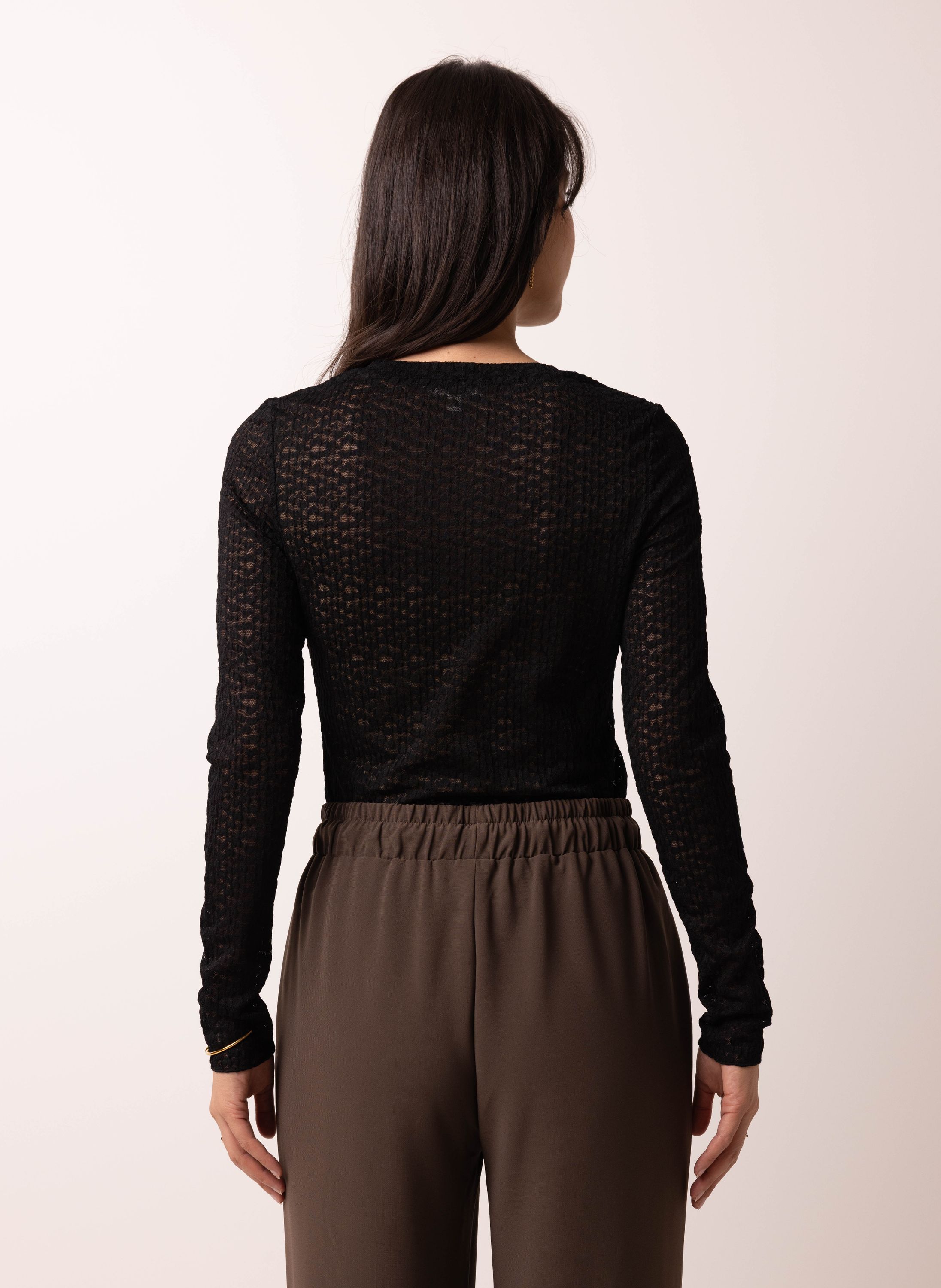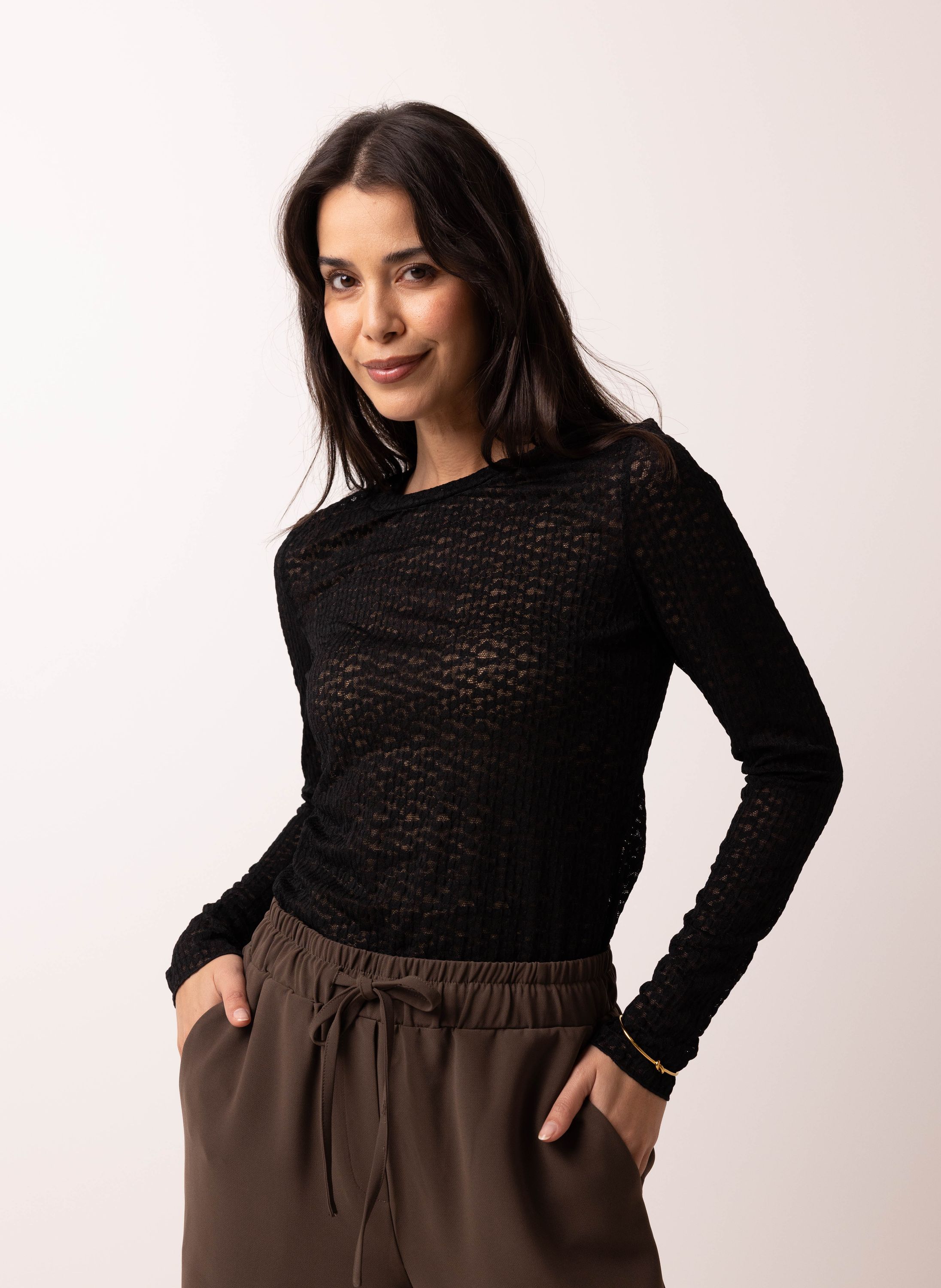 Shirt met ronde hals, lange mouwen en een structuur. Het shirt schijnt licht door. We adviseren je er een Marianne top onder te dragen.