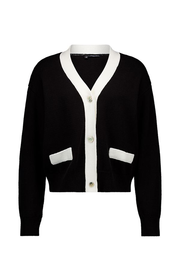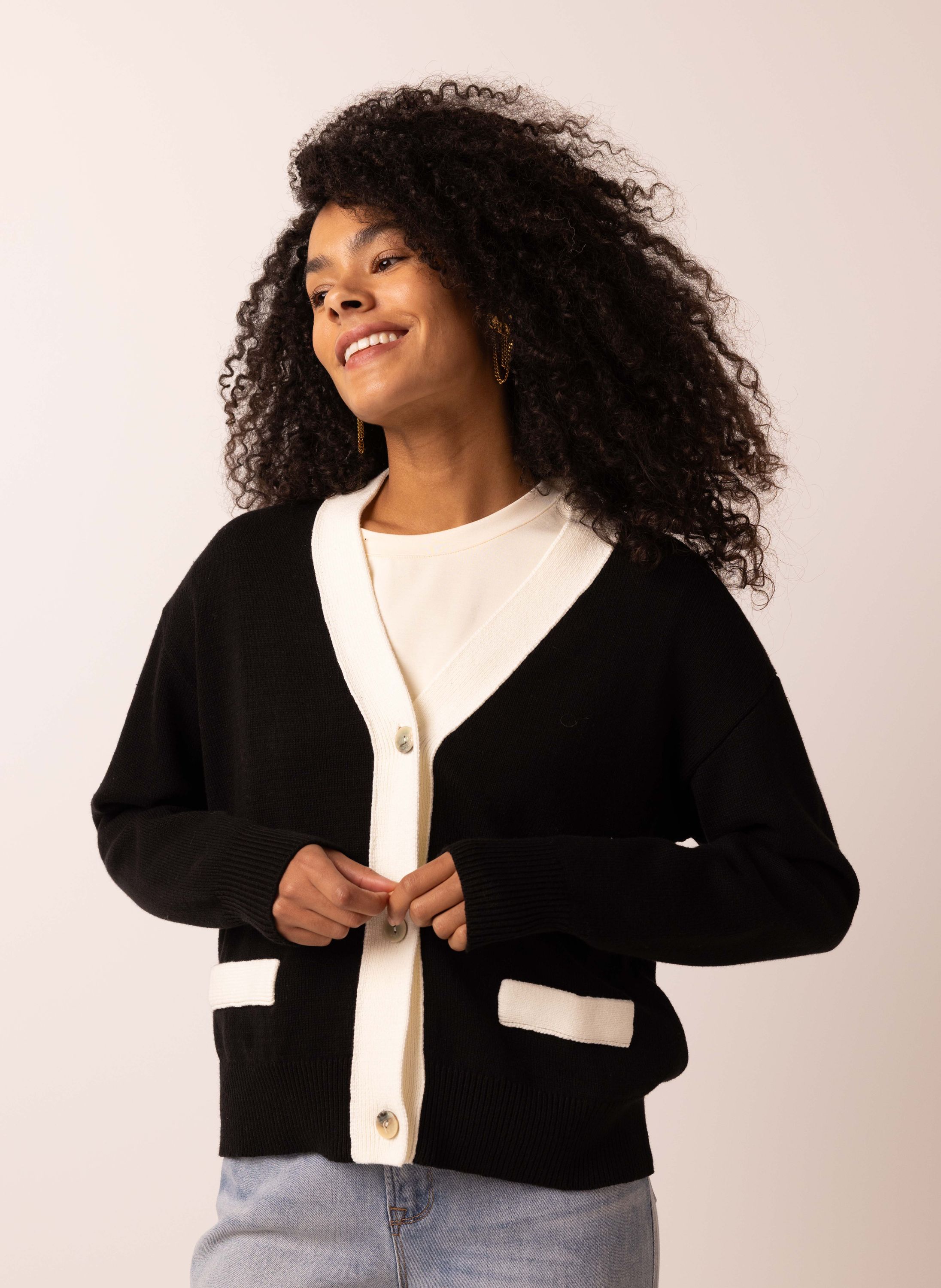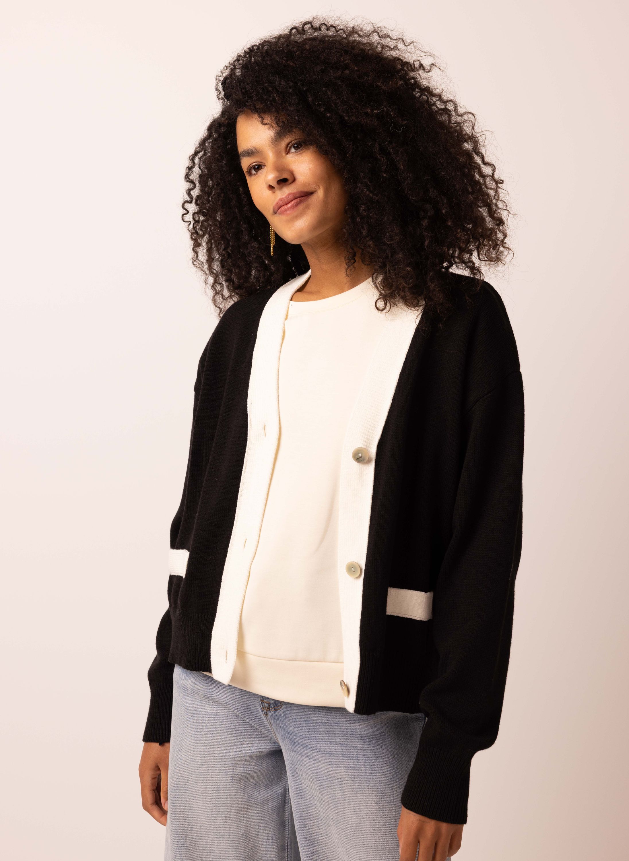 Dit gebreide vest heeft een V-hals, knoopsluiting en een contrasterende bies langs de hals en zakken. Ideaal om zowel open als gesloten te dragen.