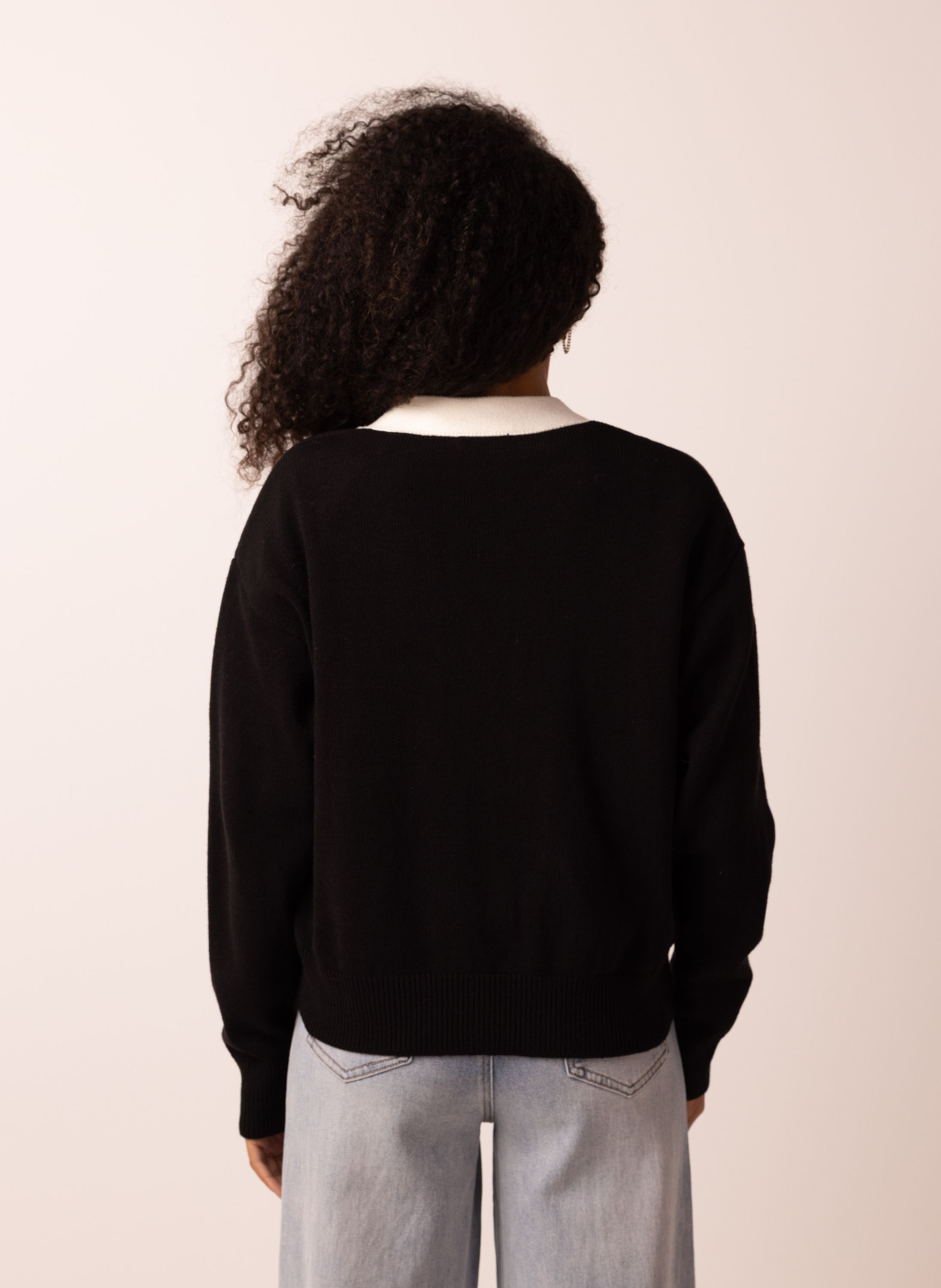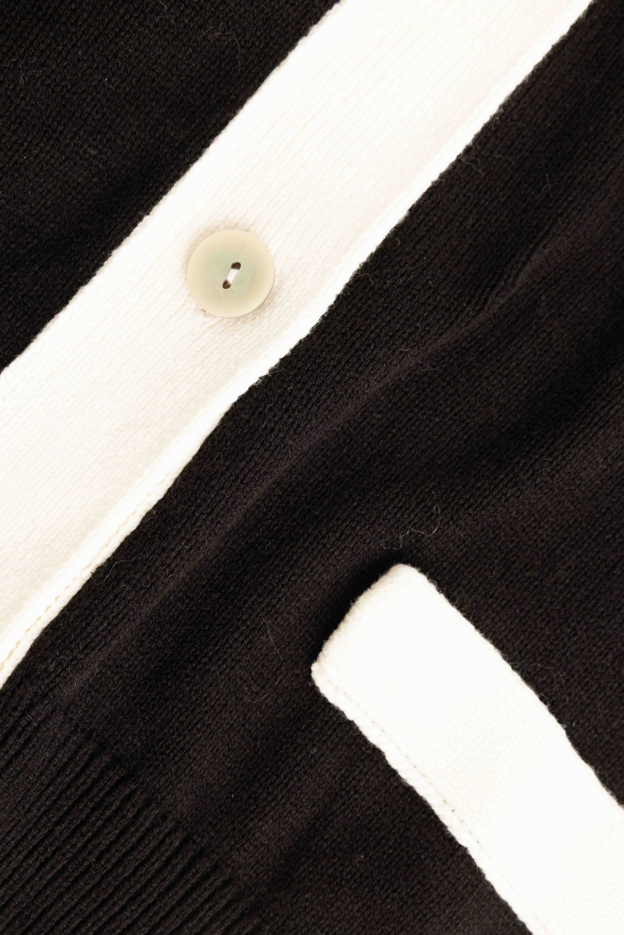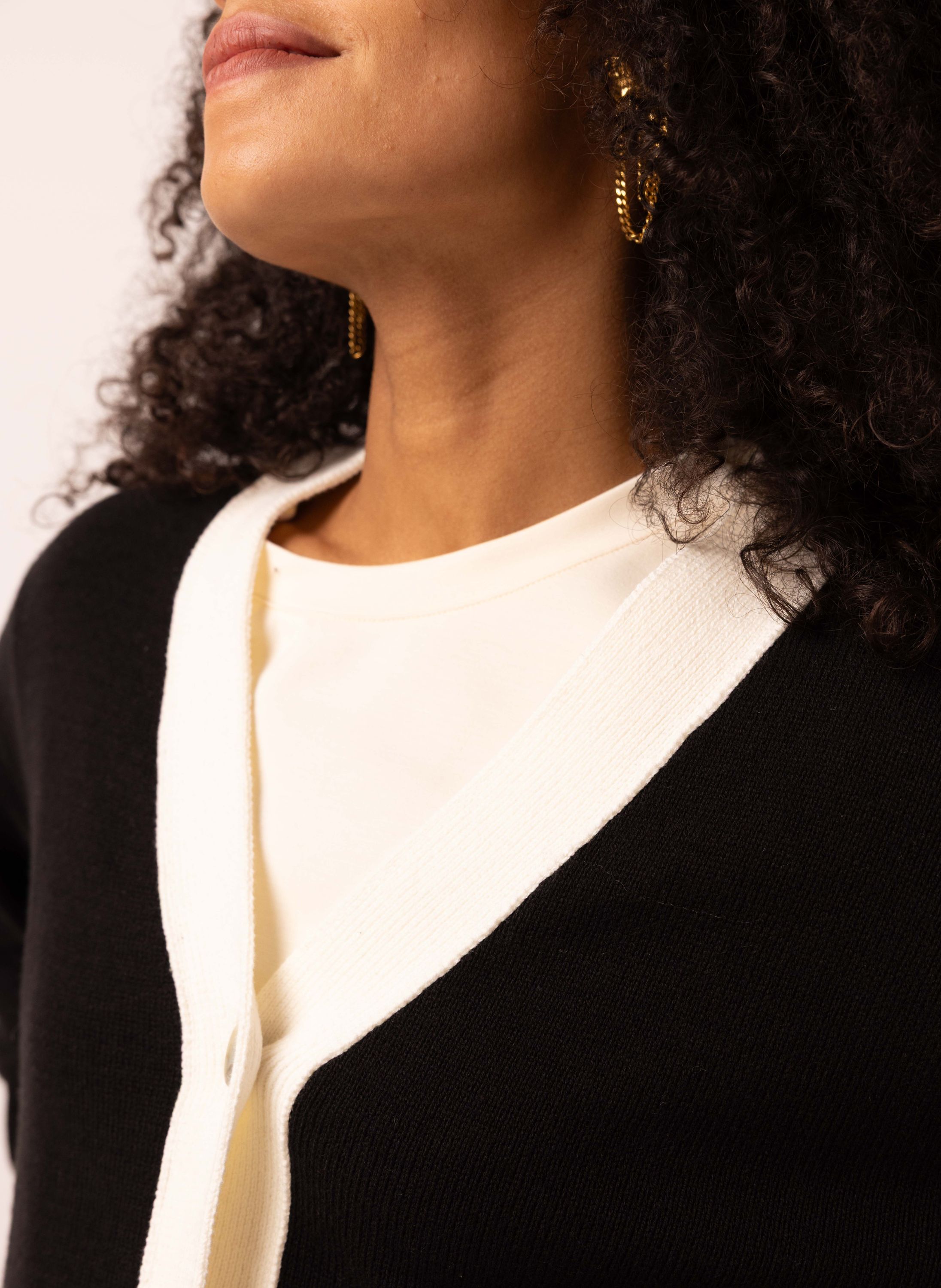 Dit gebreide vest heeft een V-hals, knoopsluiting en een contrasterende bies langs de hals en zakken. Ideaal om zowel open als gesloten te dragen.