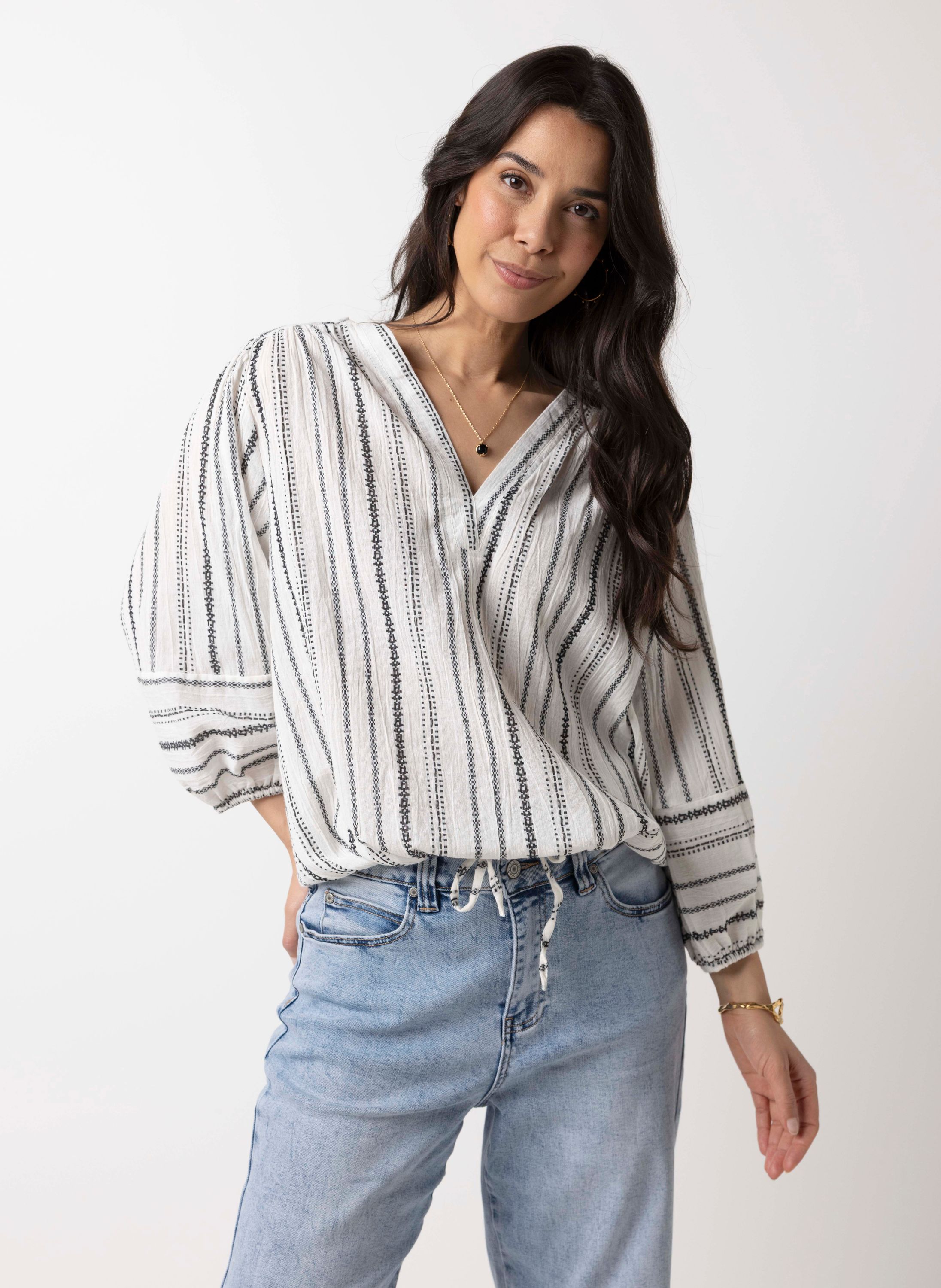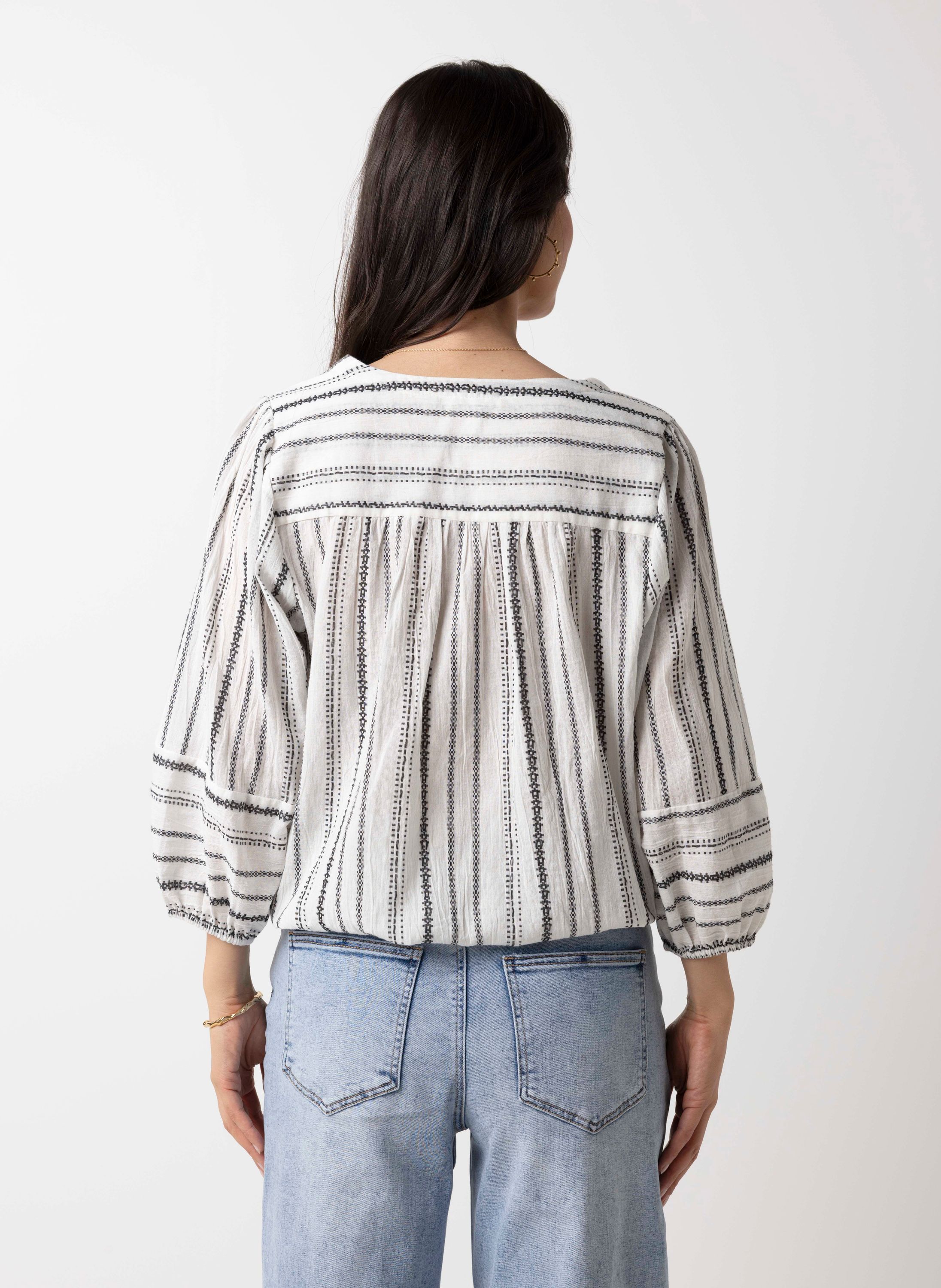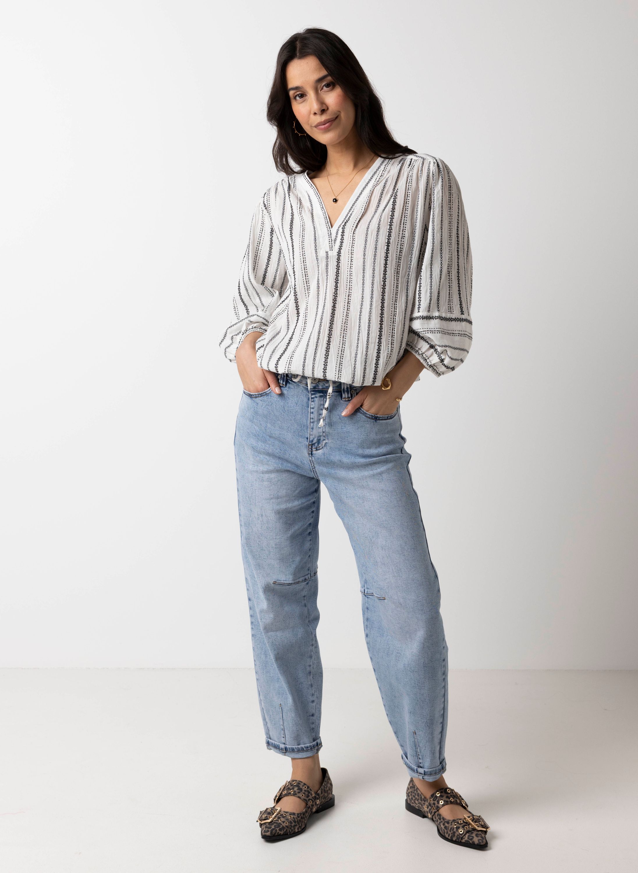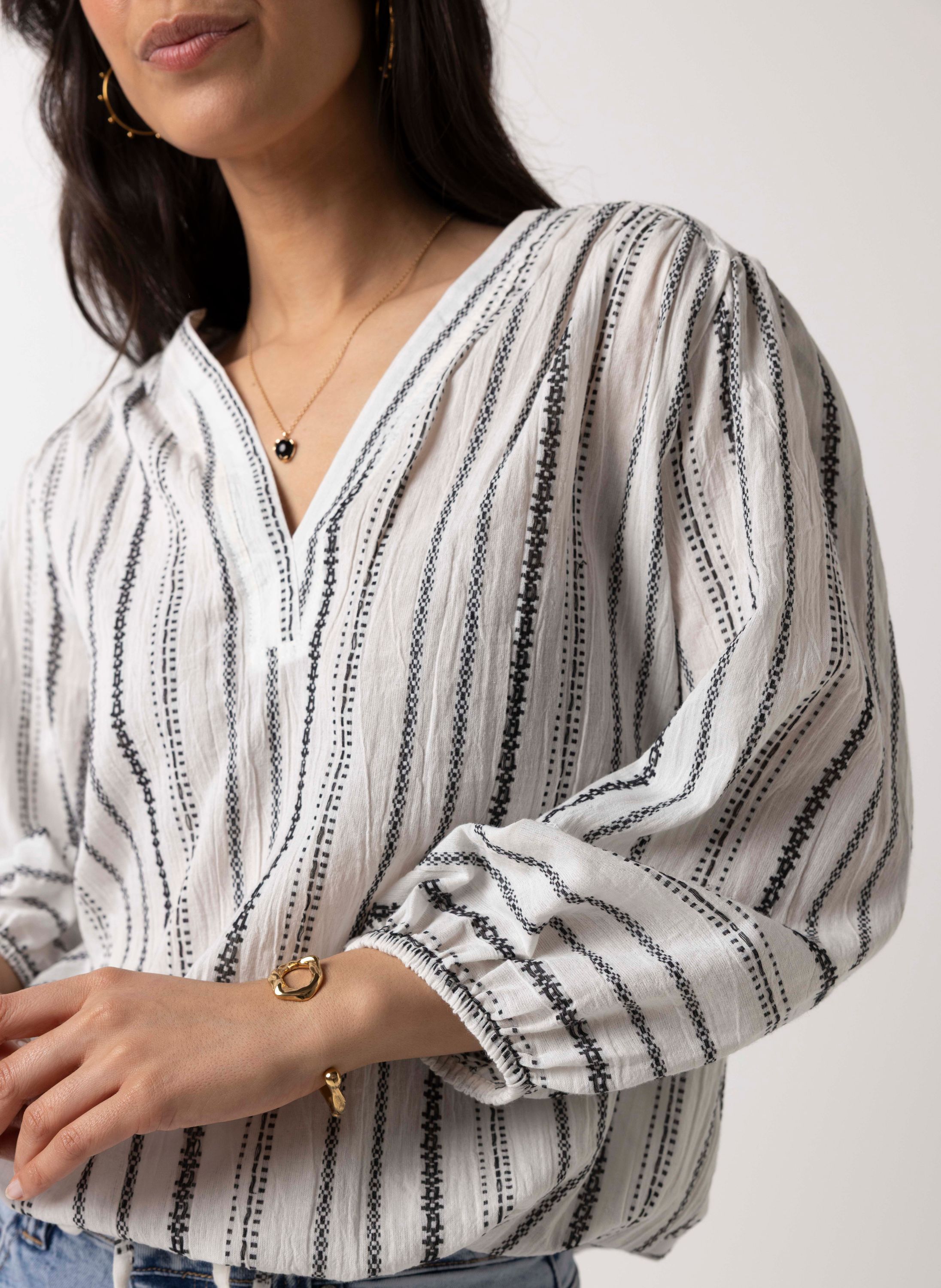 Deze katoenen top met V-hals en driekwart mouwen met elastische band heeft een strikkoord aan de onderzijde voor een speels detail.