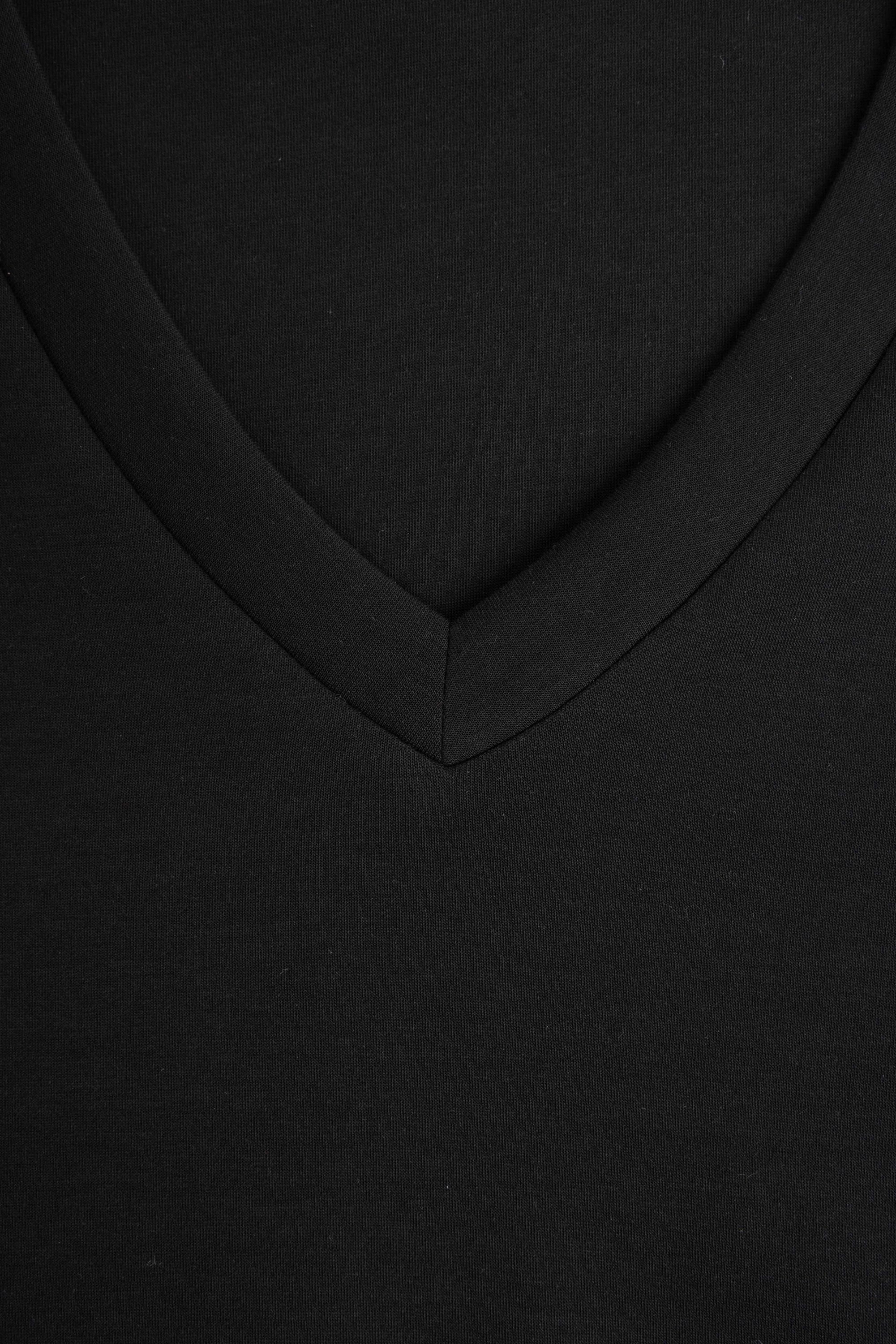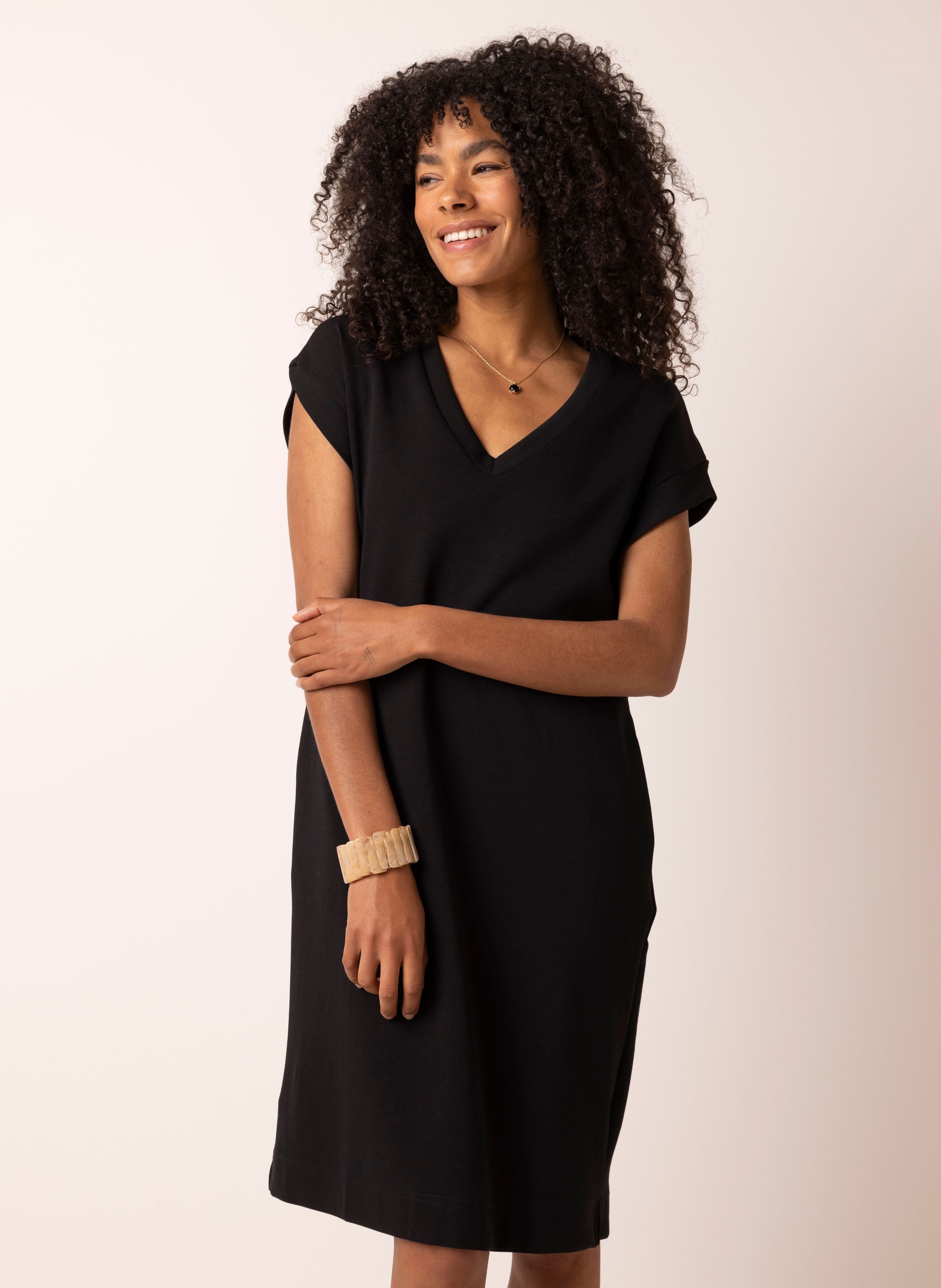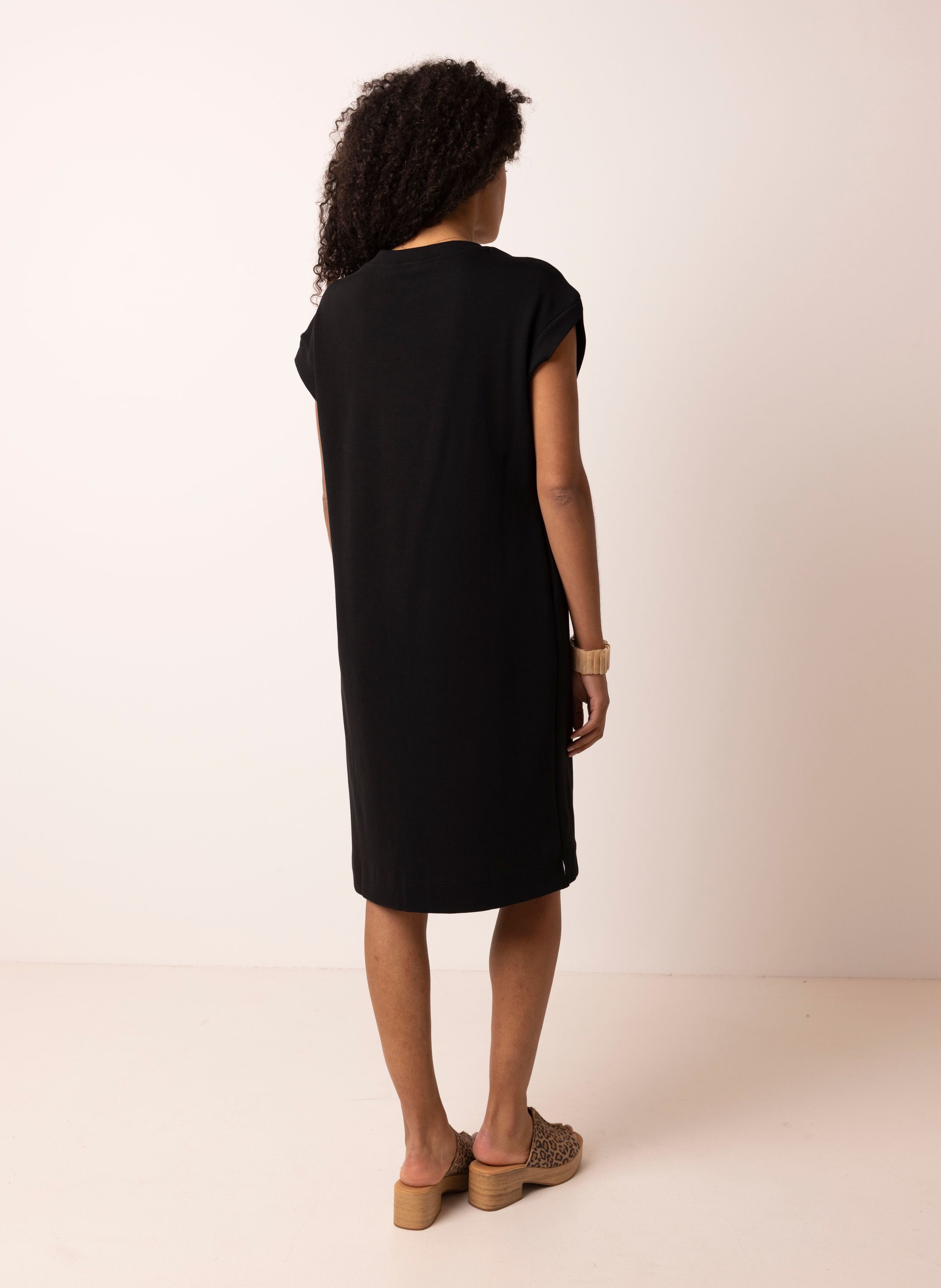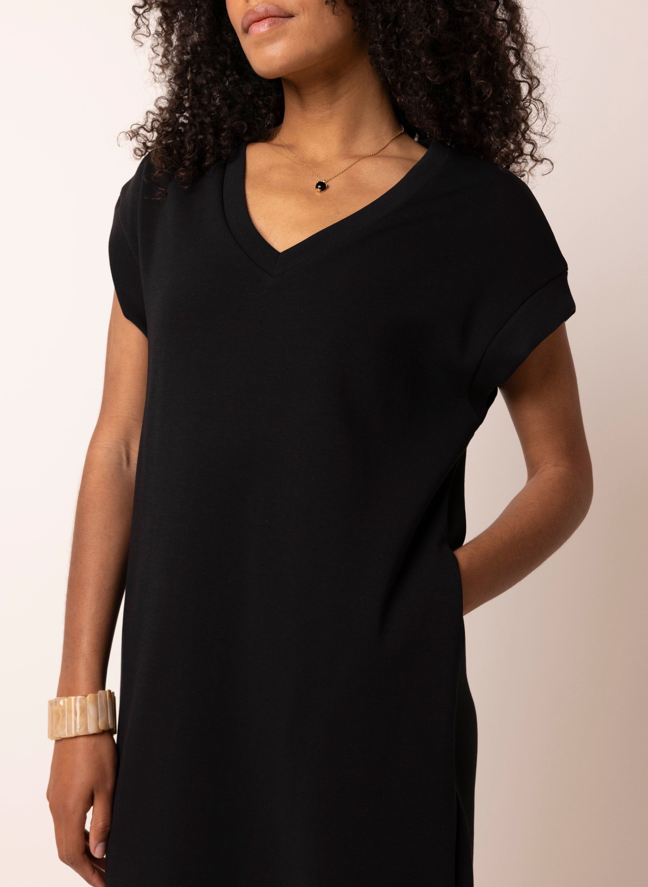 Deze midi jurk met V-hals en korte mouwen heeft een vrouwelijke uitstraling.