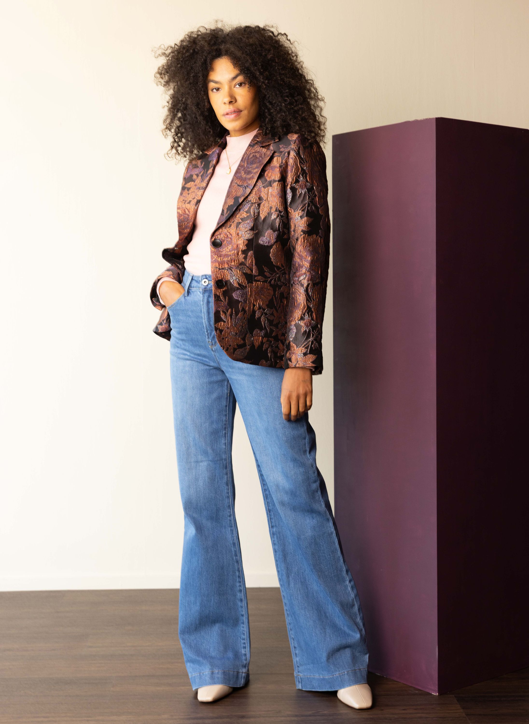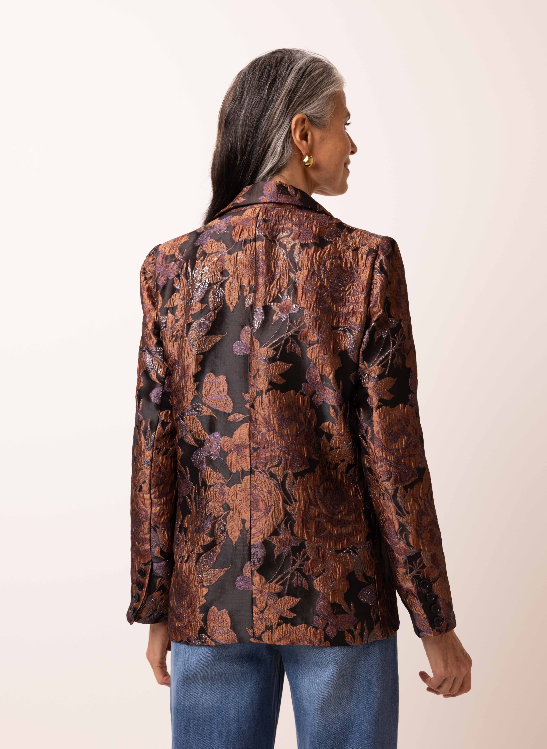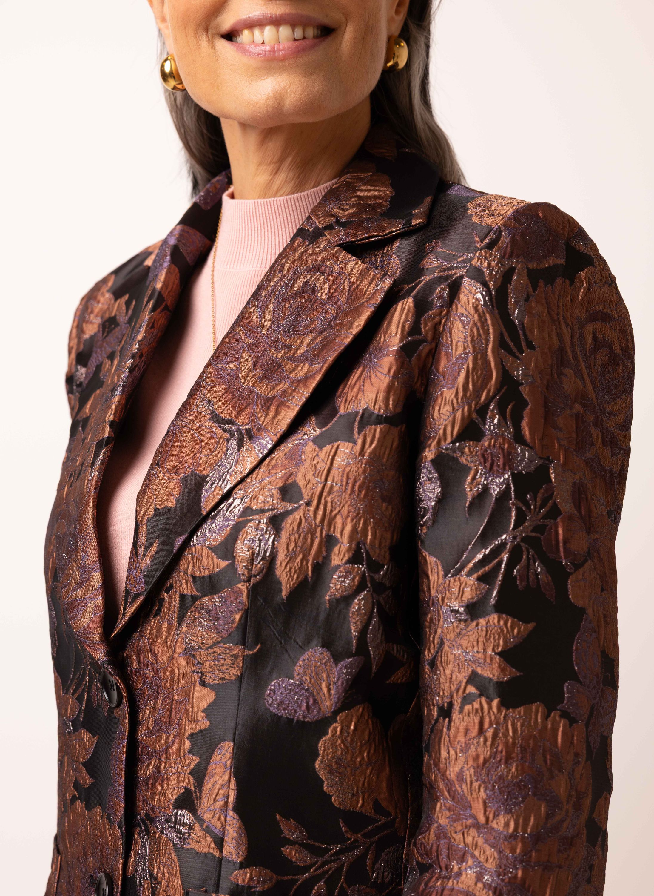 Deze blazer met reverskraag, knoopsluiting, lange mouwen en open zakken heeft een subtiele glans.