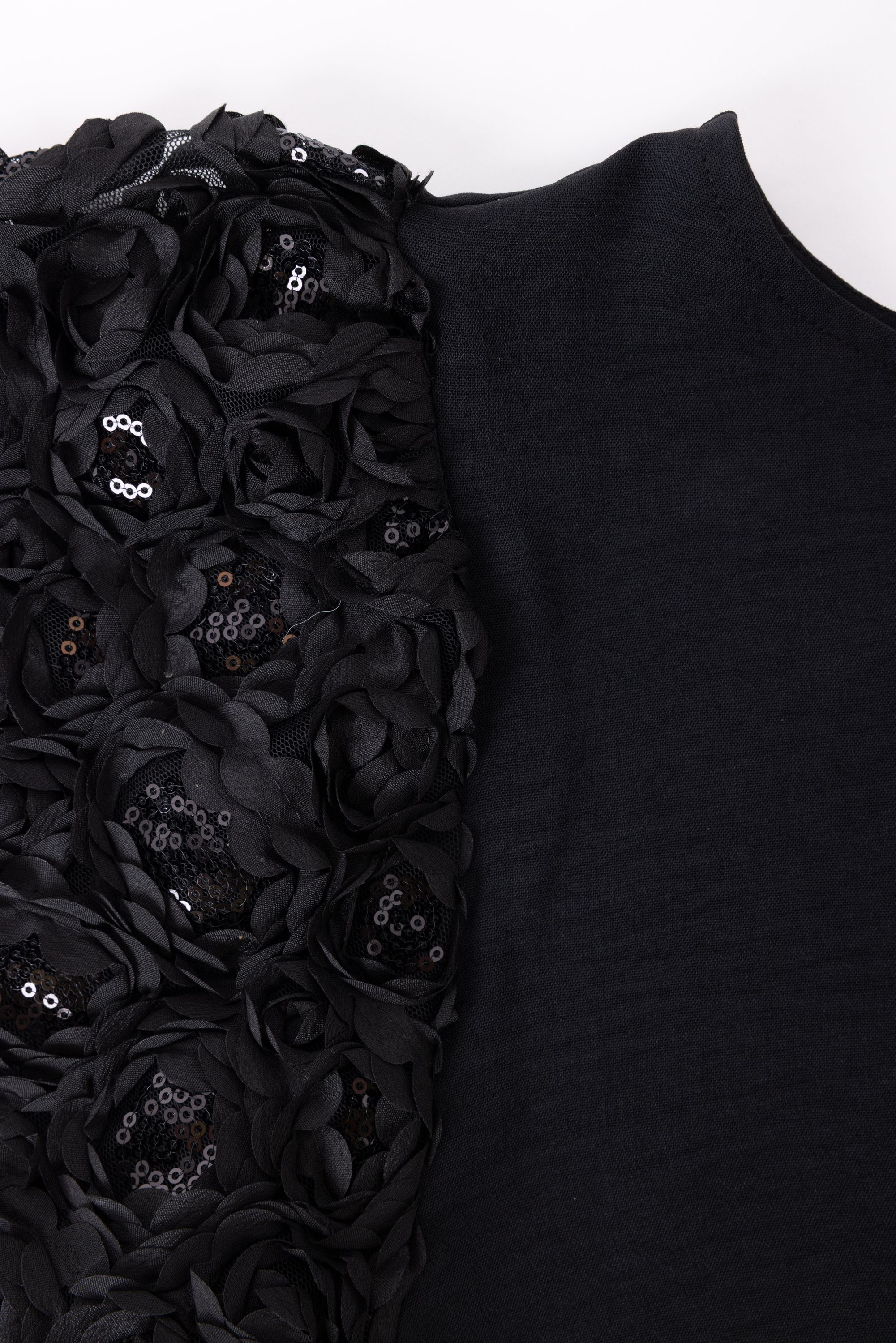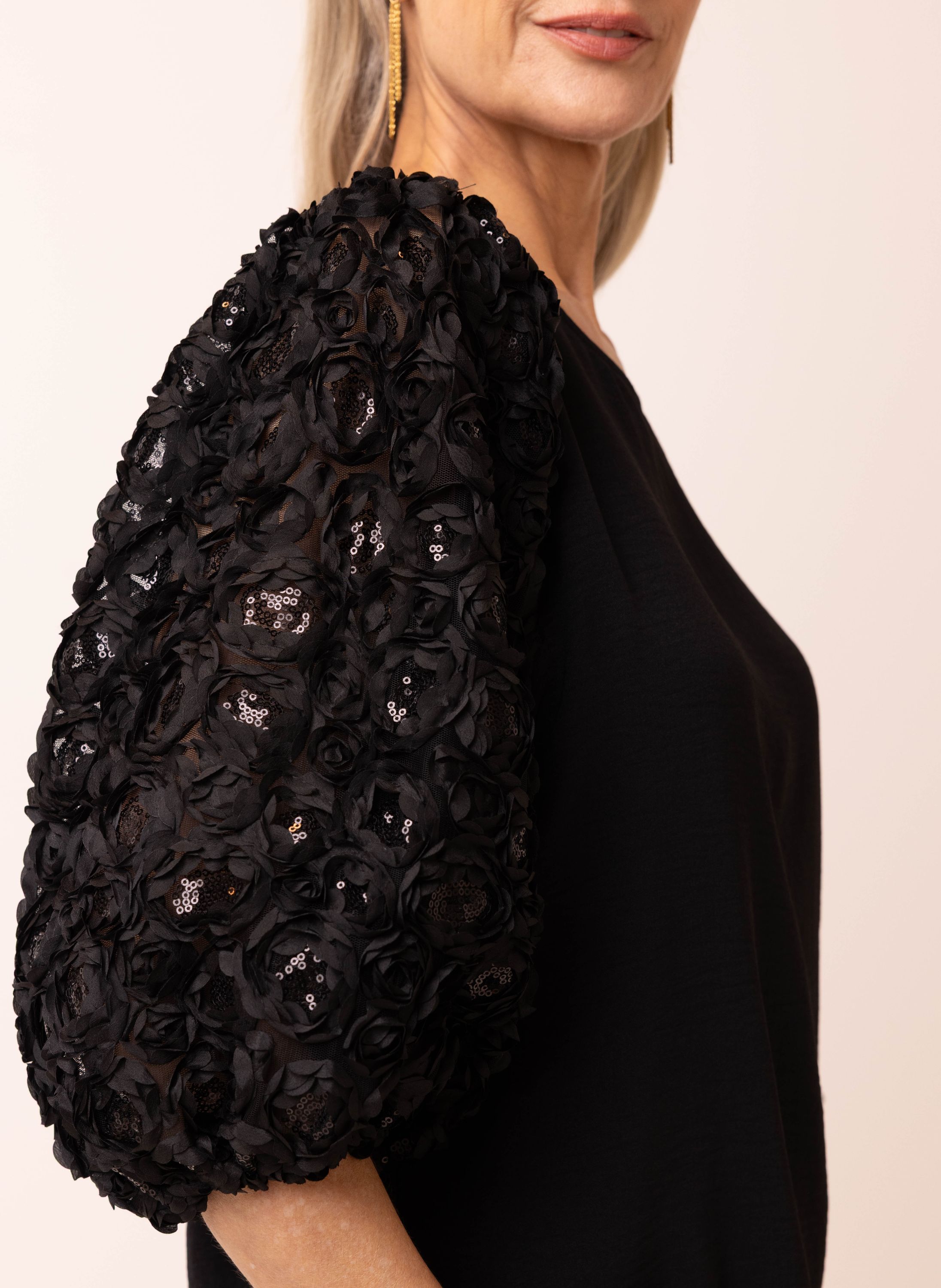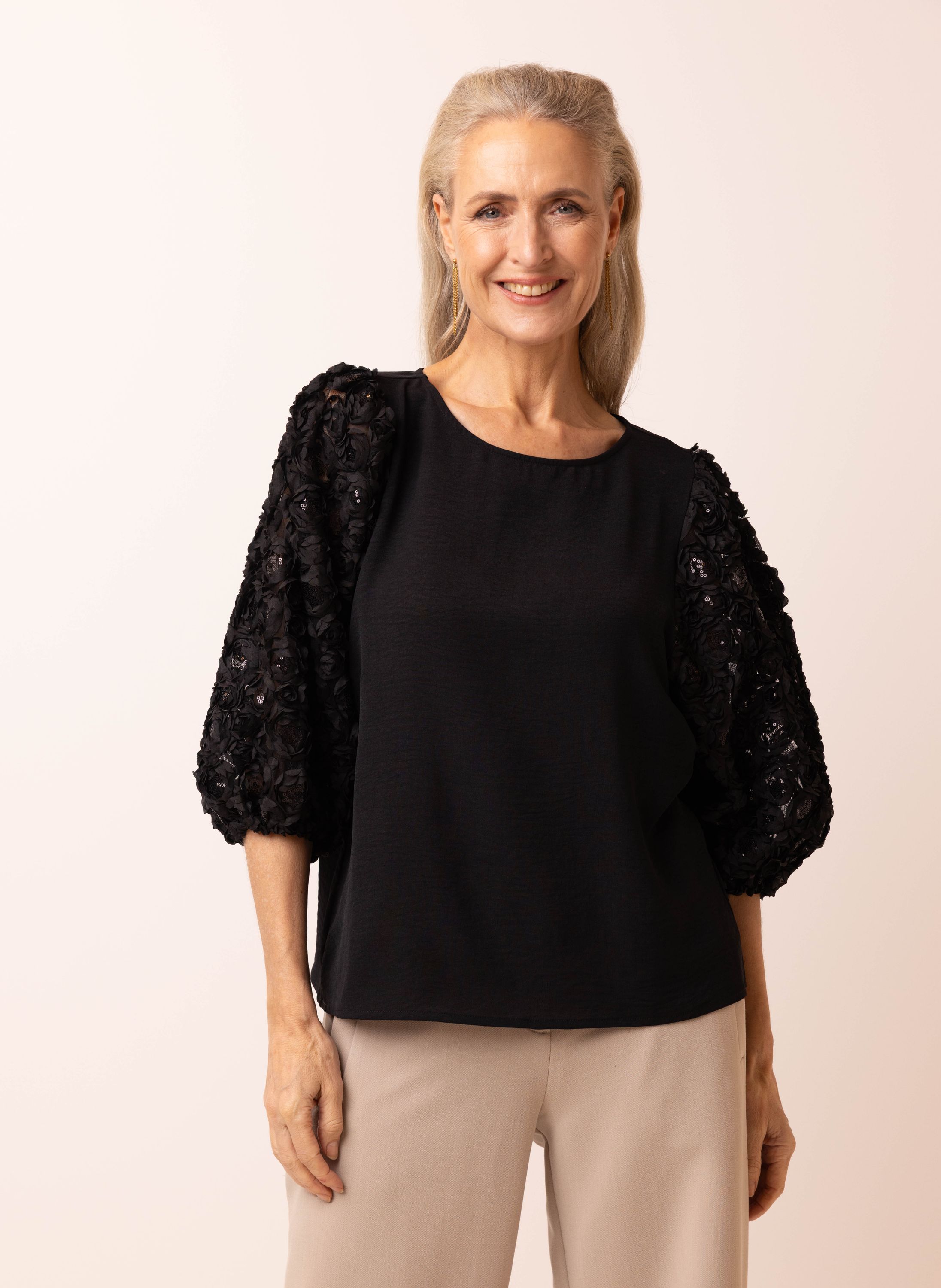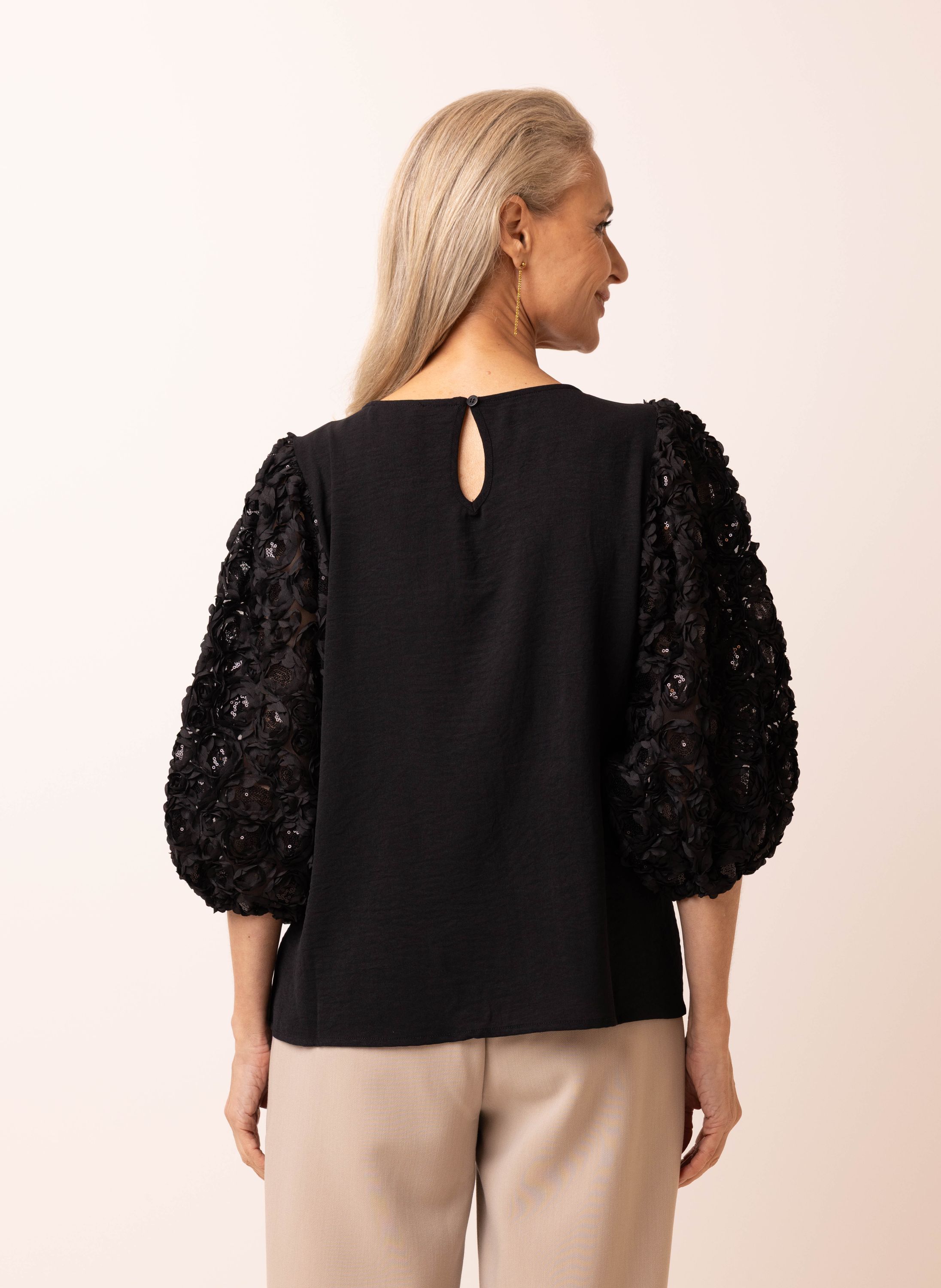 Deze blouse met ronde hals, knoopsluiting in de nek en driekwart ballonmouwen is versierd met pailletten en bloemen. Een feestelijke eyecatcher. Wegens de pailletten adviseren wij je het item in een waszakje te wassen.