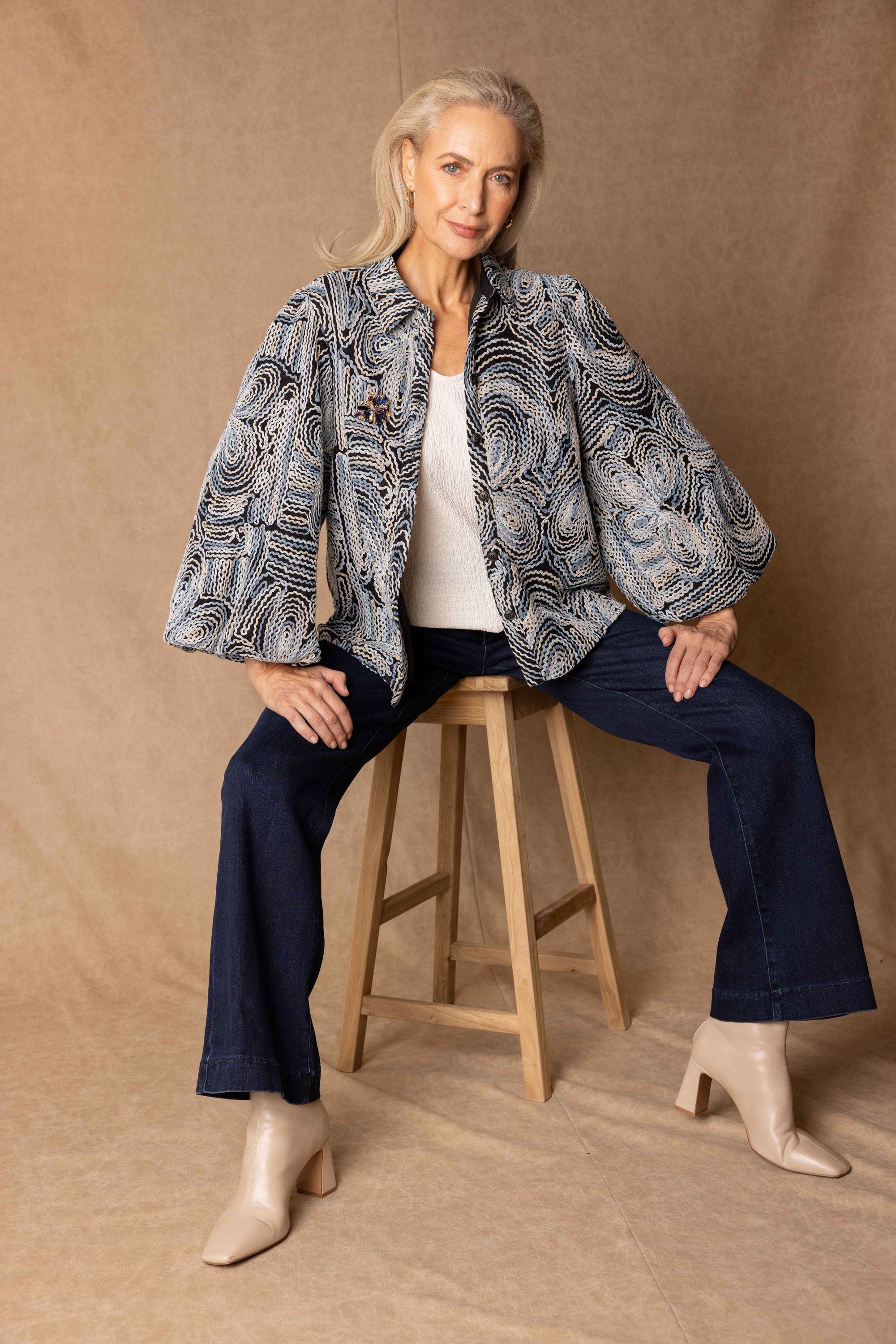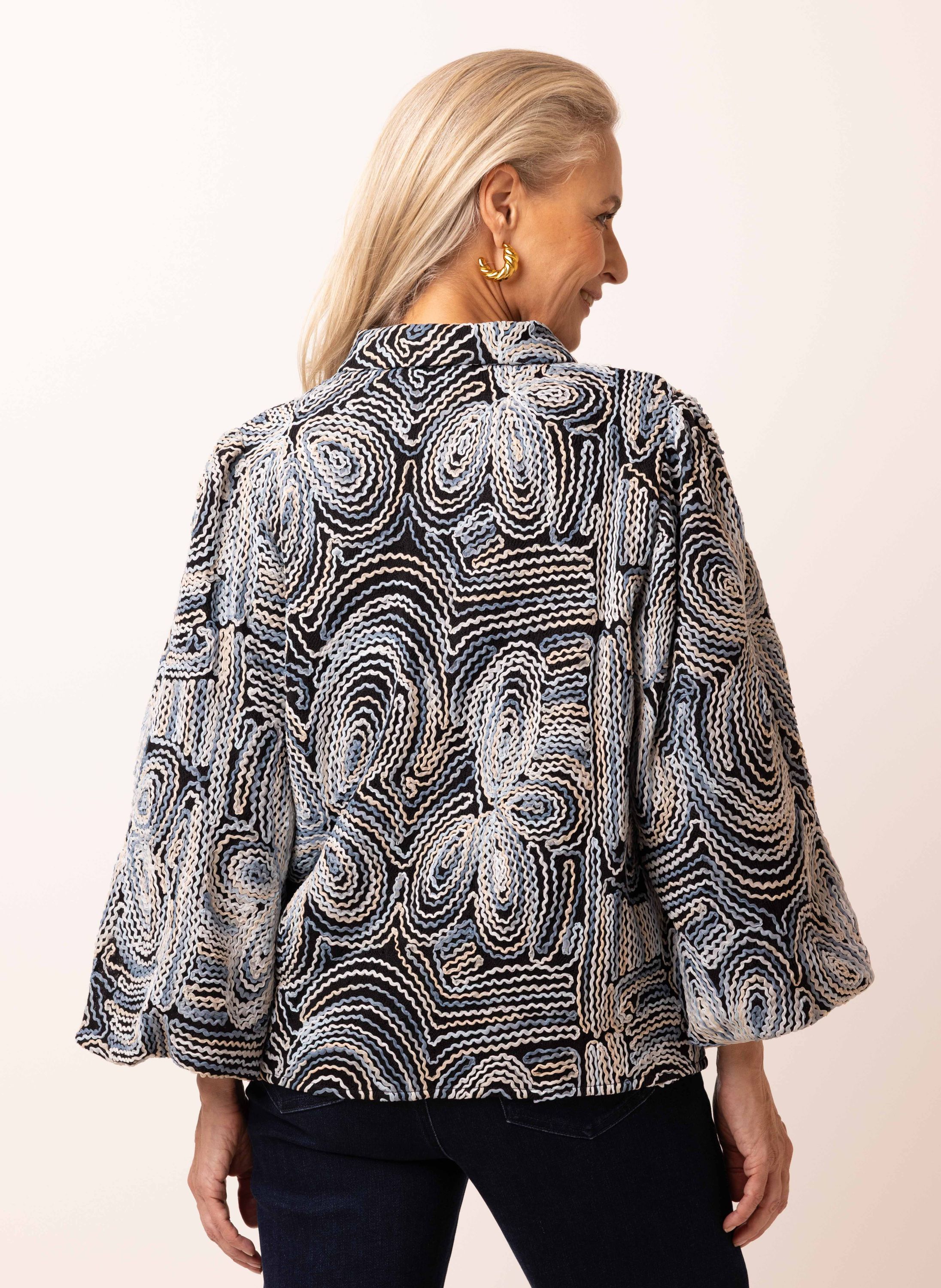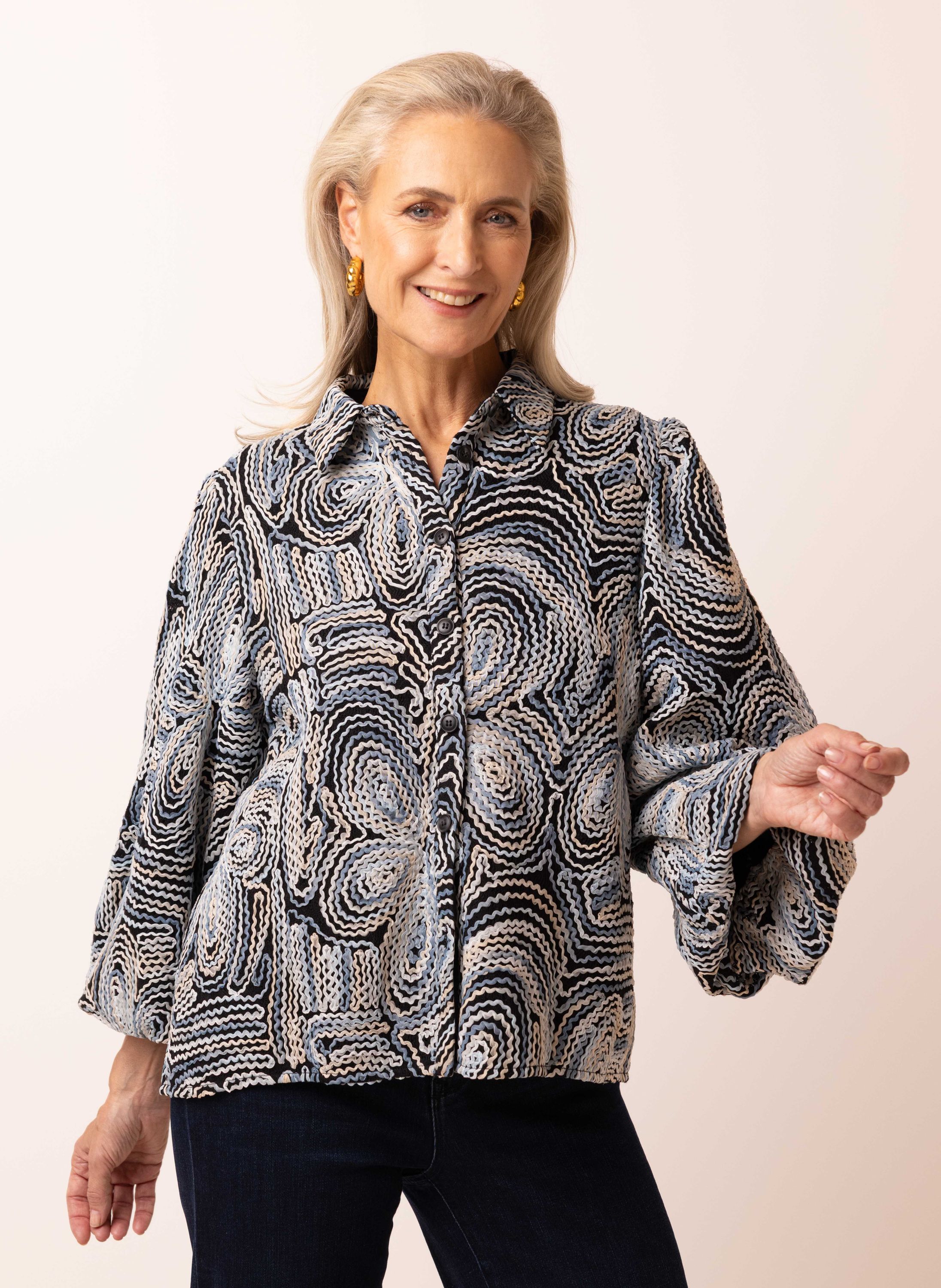 Deze blouse met klassieke kraag en knoopsluiting heeft driekwart pofmouwen met elastische uiteinden voor een speels effect.