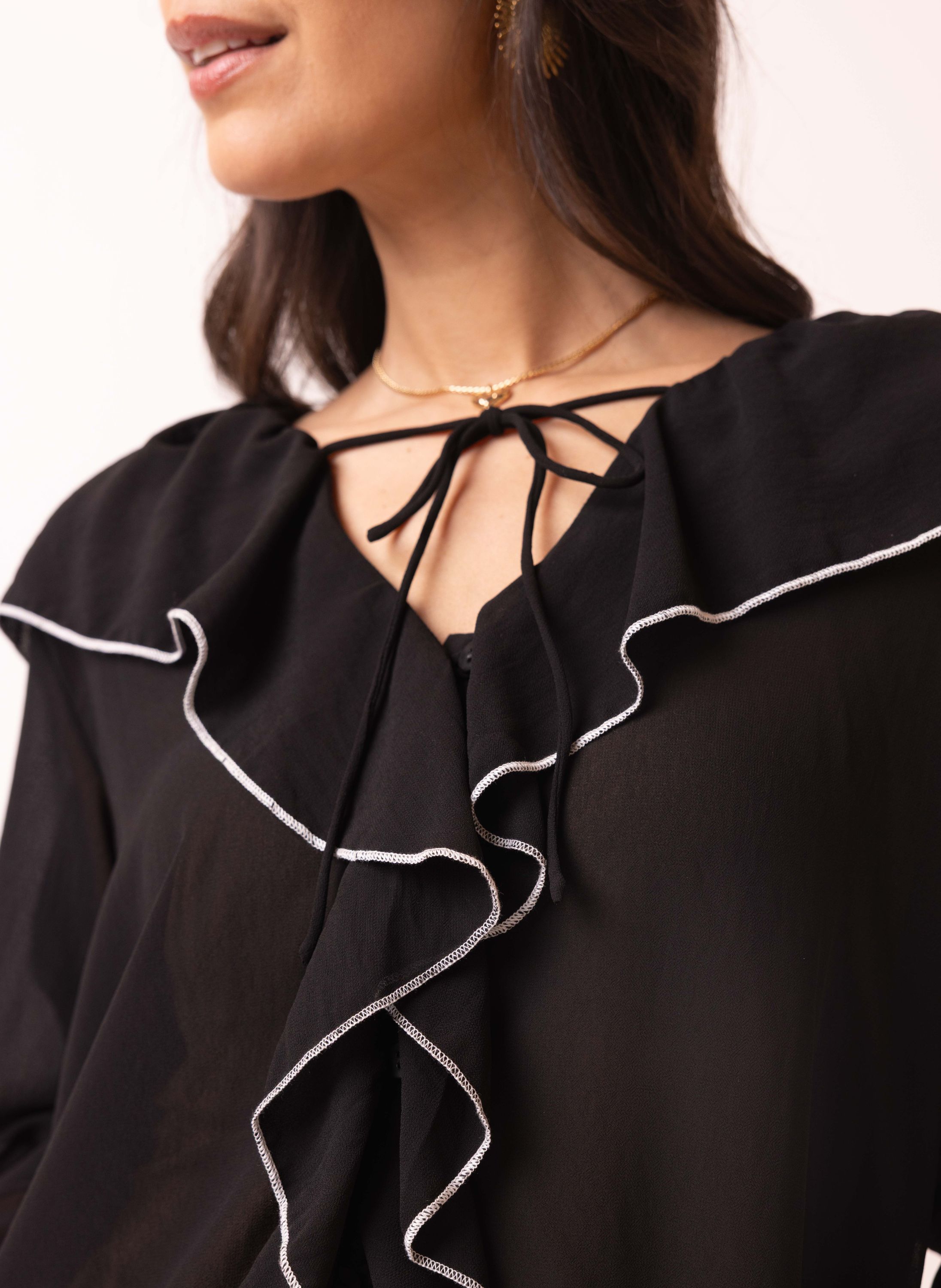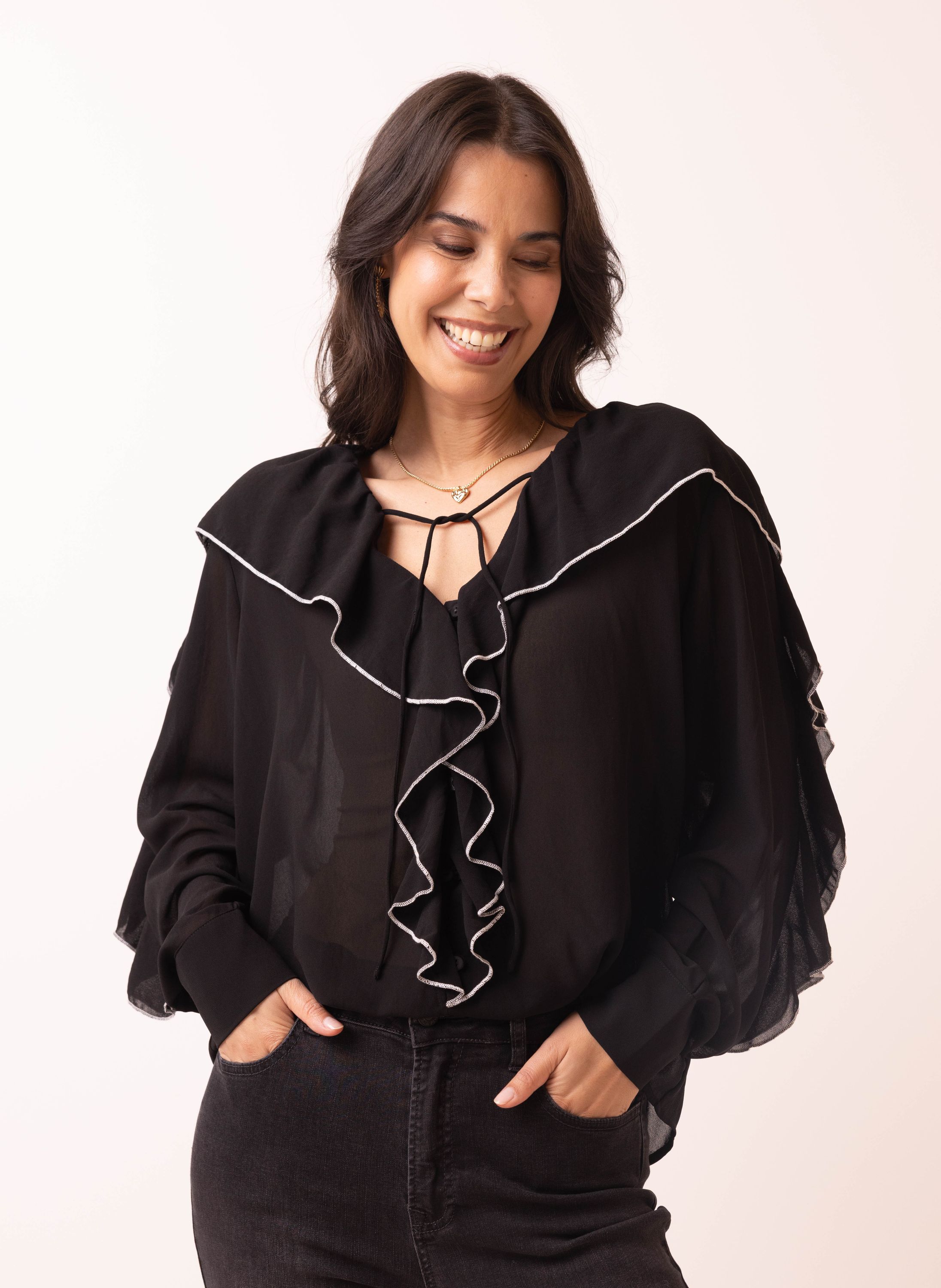 Deze blouse met V-hals, koordsluiting, lange mouwen en ruches schijnt licht door, we adviseren je er een Marianne top onder te dragen. Dit item is exclusief verkrijgbaar in geselecteerde winkels en online. Controleer de winkelvoorraad om de beschikbaarheid in een winkel bij jou in de buurt te bekijken.