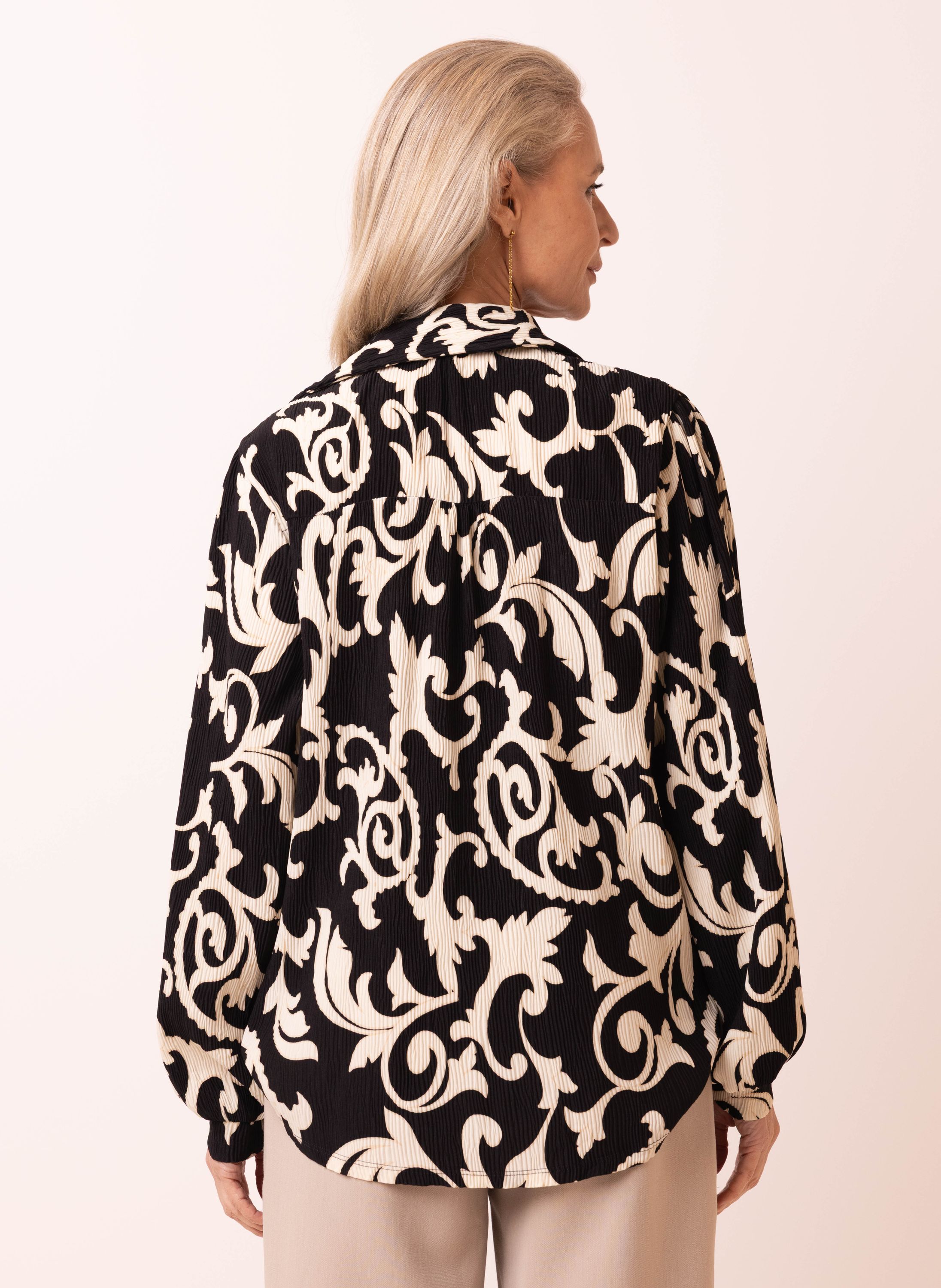 Deze blouse met sierlijk dessin heeft een klassieke kraag, knoopsluiting, lange pofmouwen, plooirand op de achterzijde en een structuur in de stof. De vloeiende stof en elegante print zorgen voor een vrouwelijke uitstraling.
