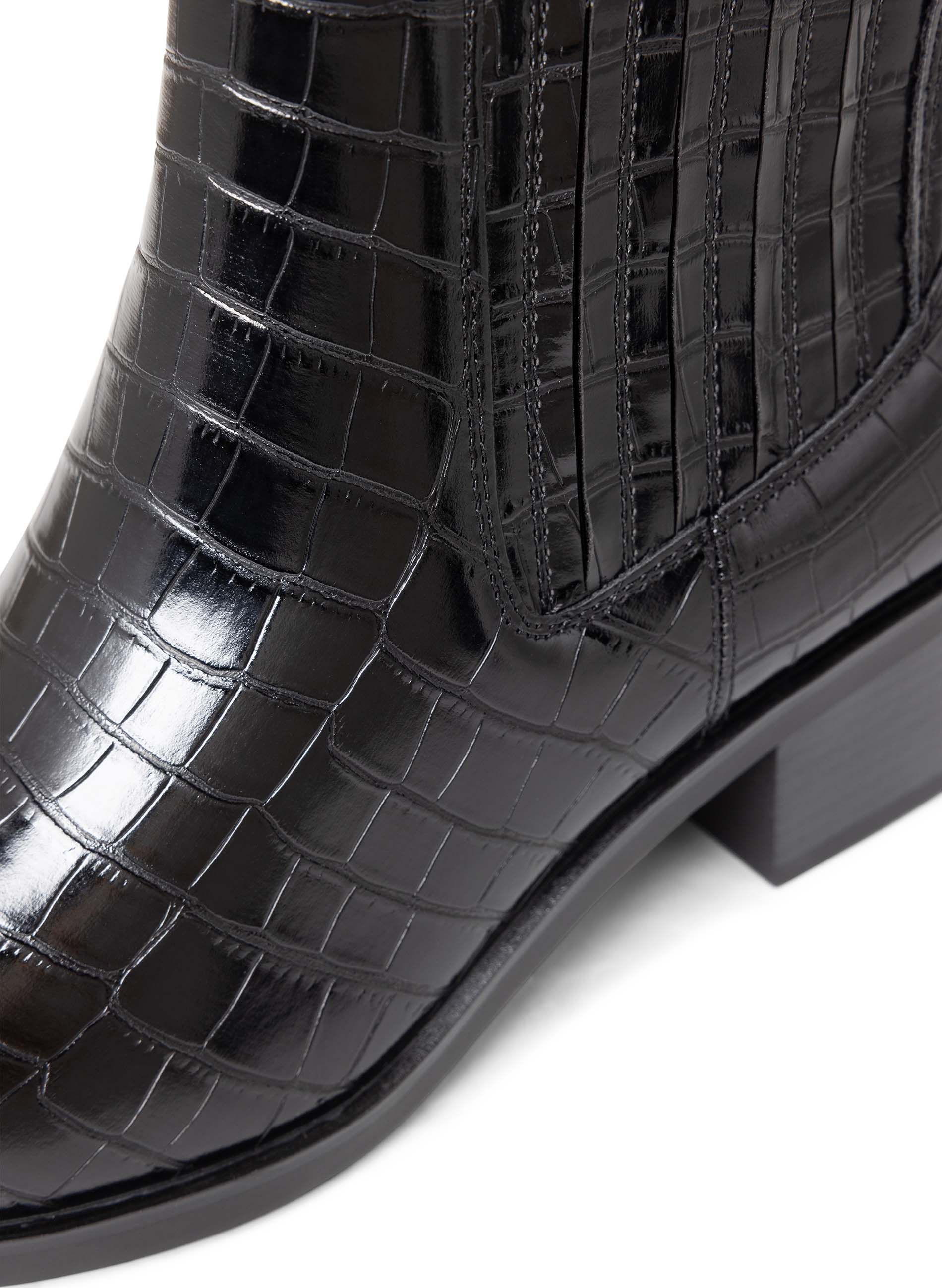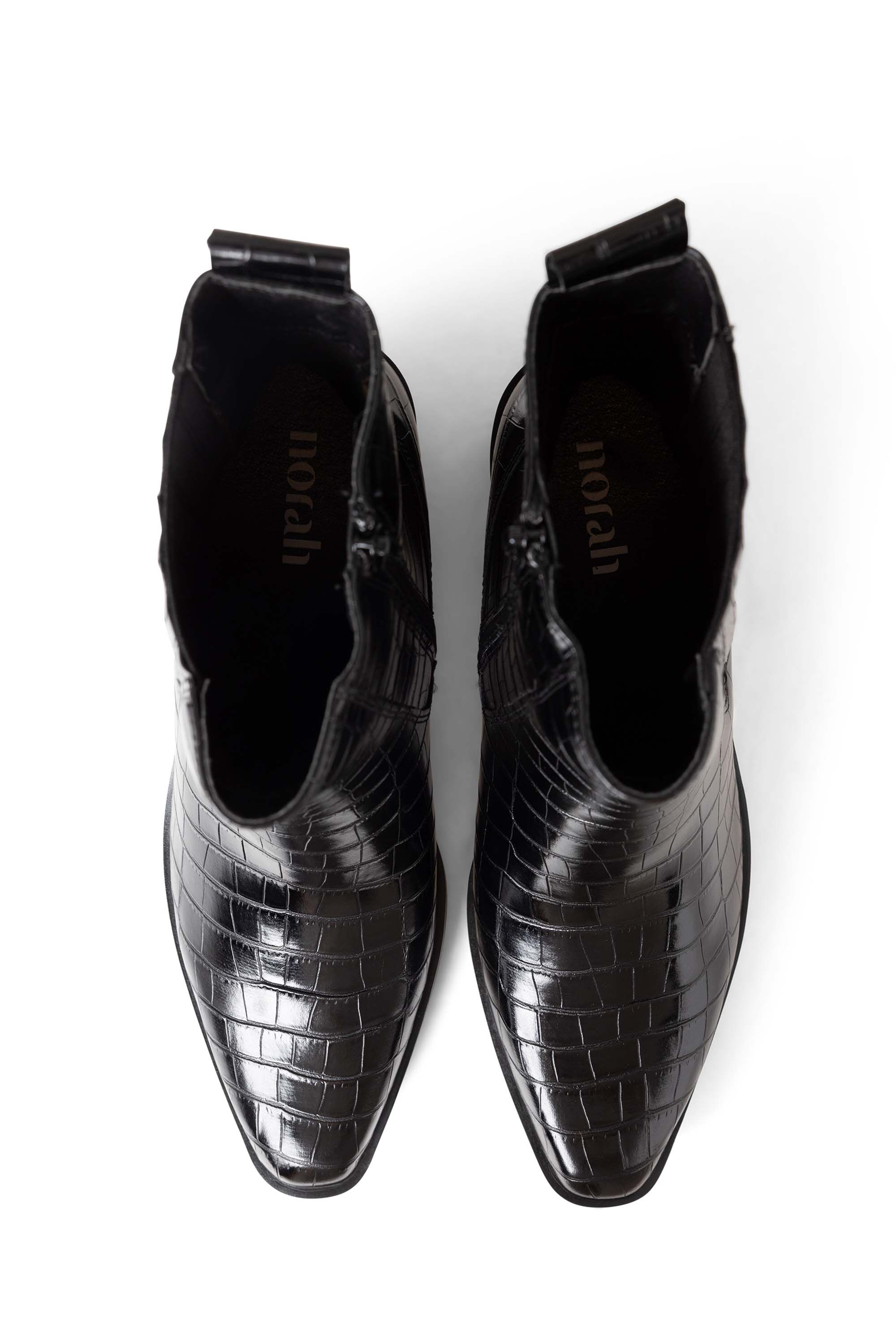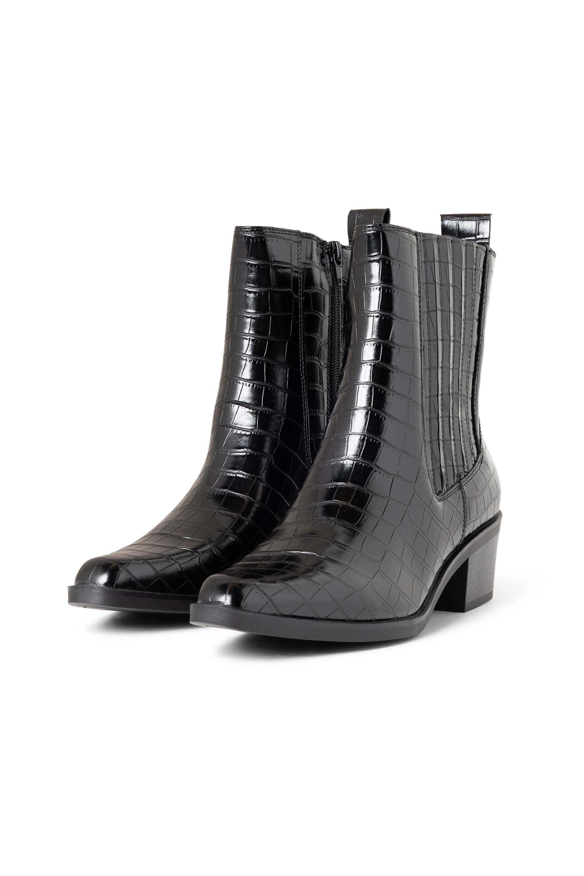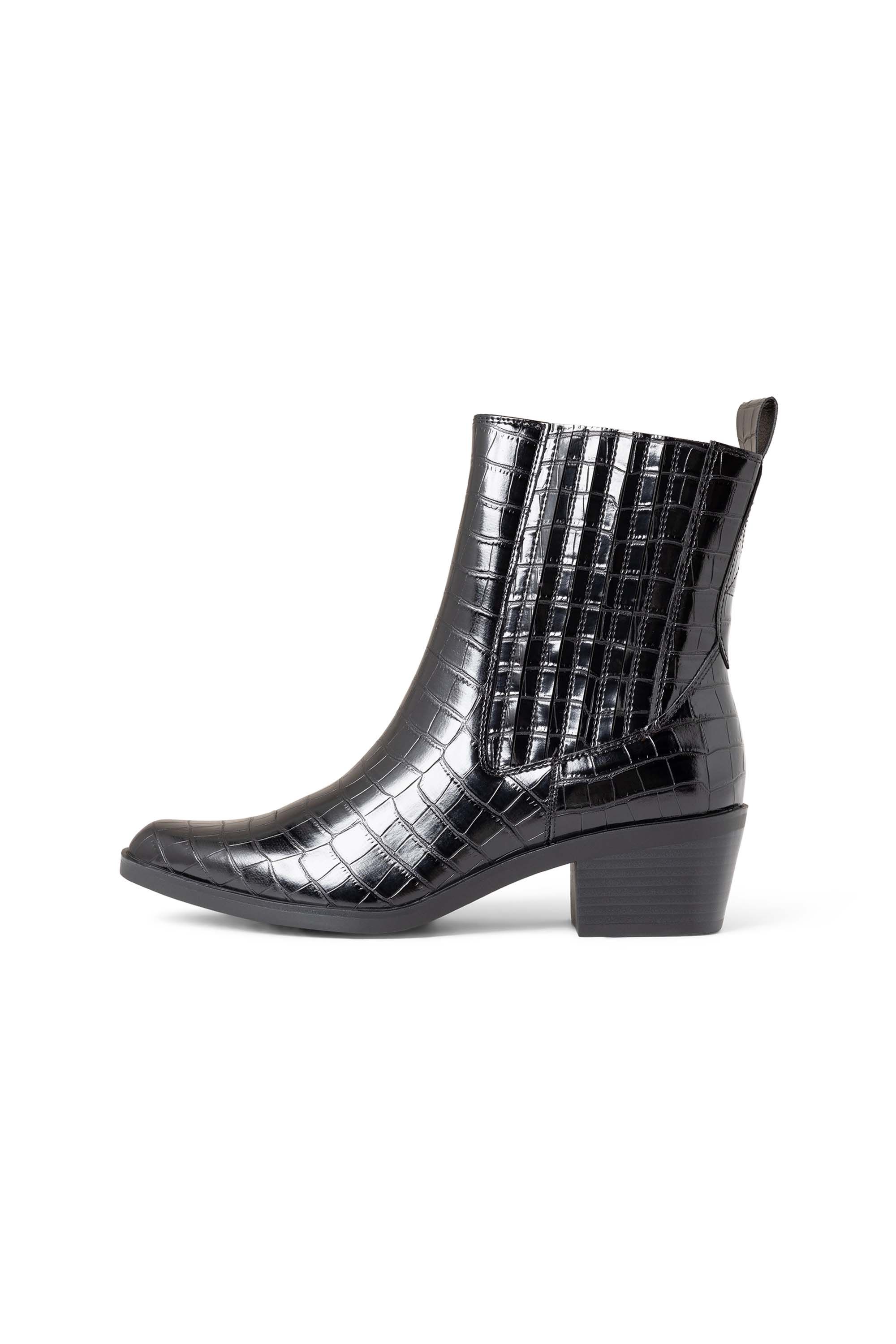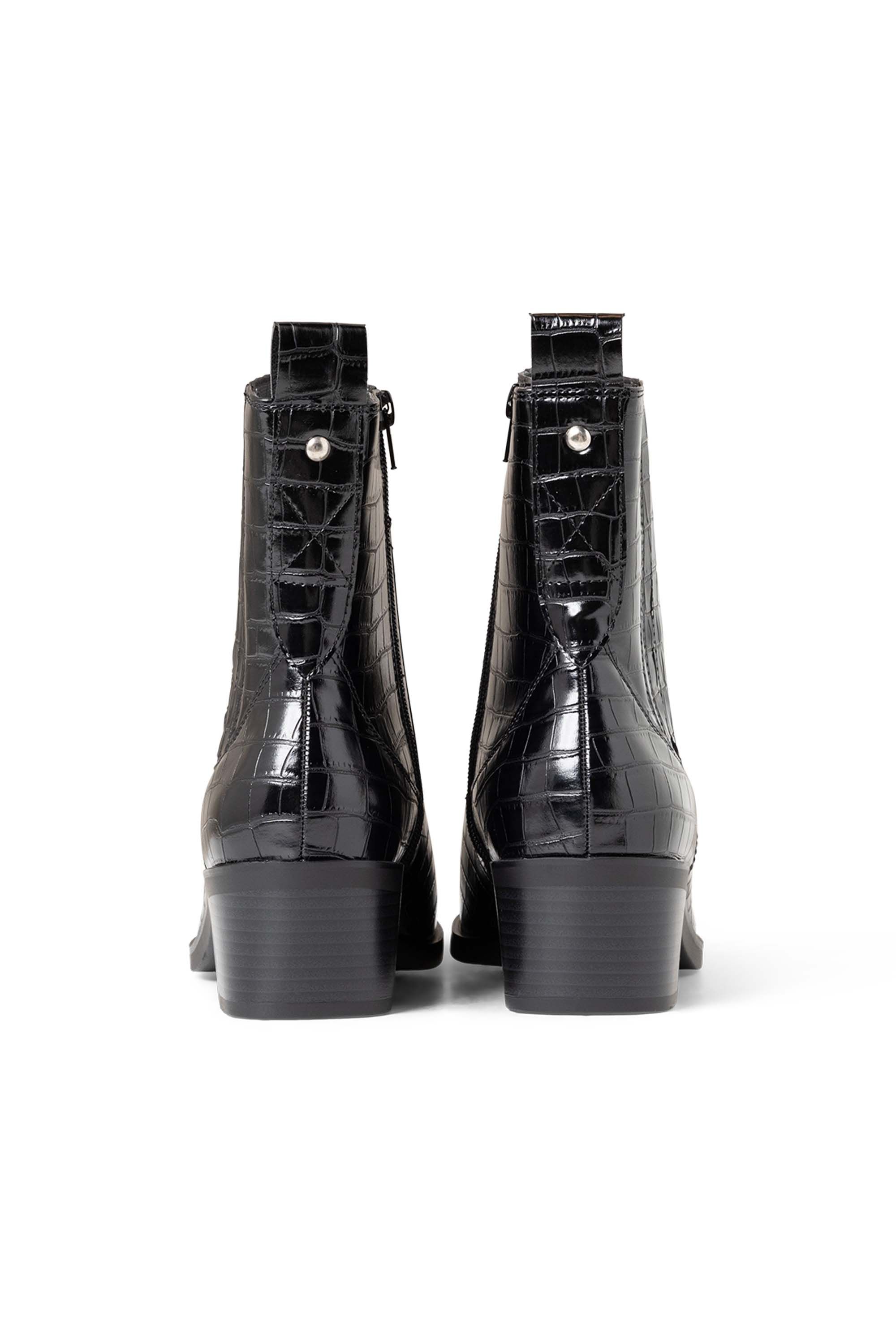 Deze zwarte elegante enkellaarsjes met een puntige neus en een blokhak, zijn perfect om je outfit af te stylen. Het laarsje is lichtglanzend en heeft een krokodillenprint. Door de rits aan de binnenkant is de laars makkelijk aan en uit te doen. De stoffen voering zorgt voor extra comfort tijdens het dragen.