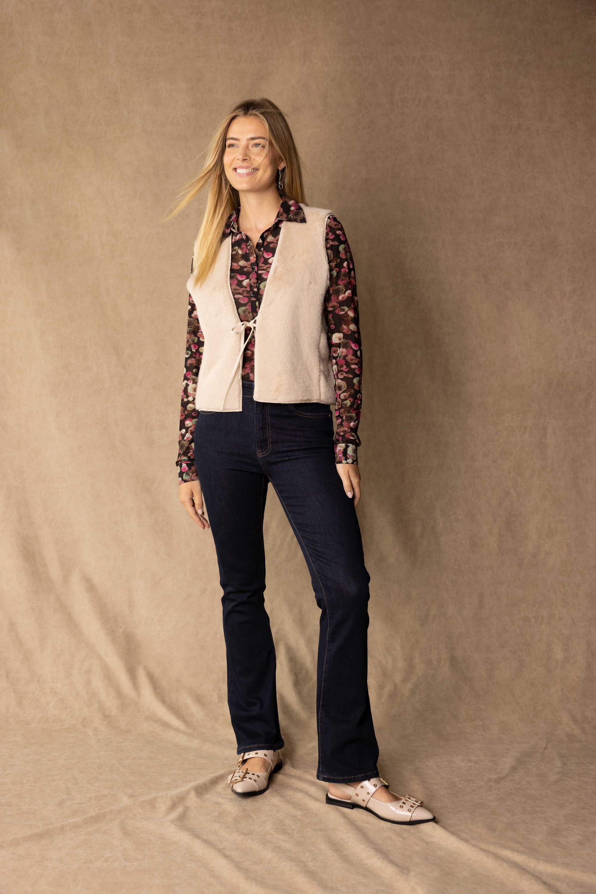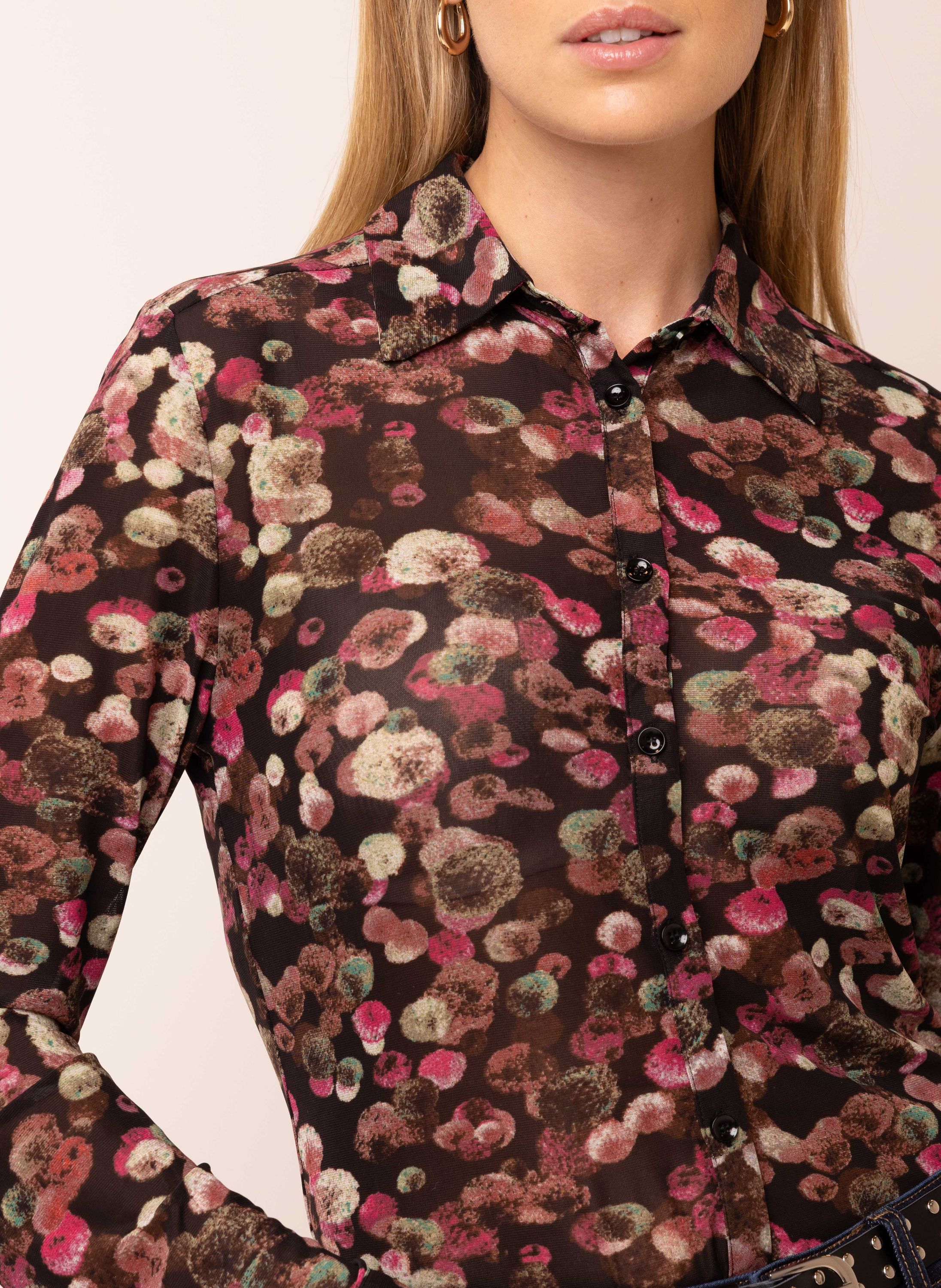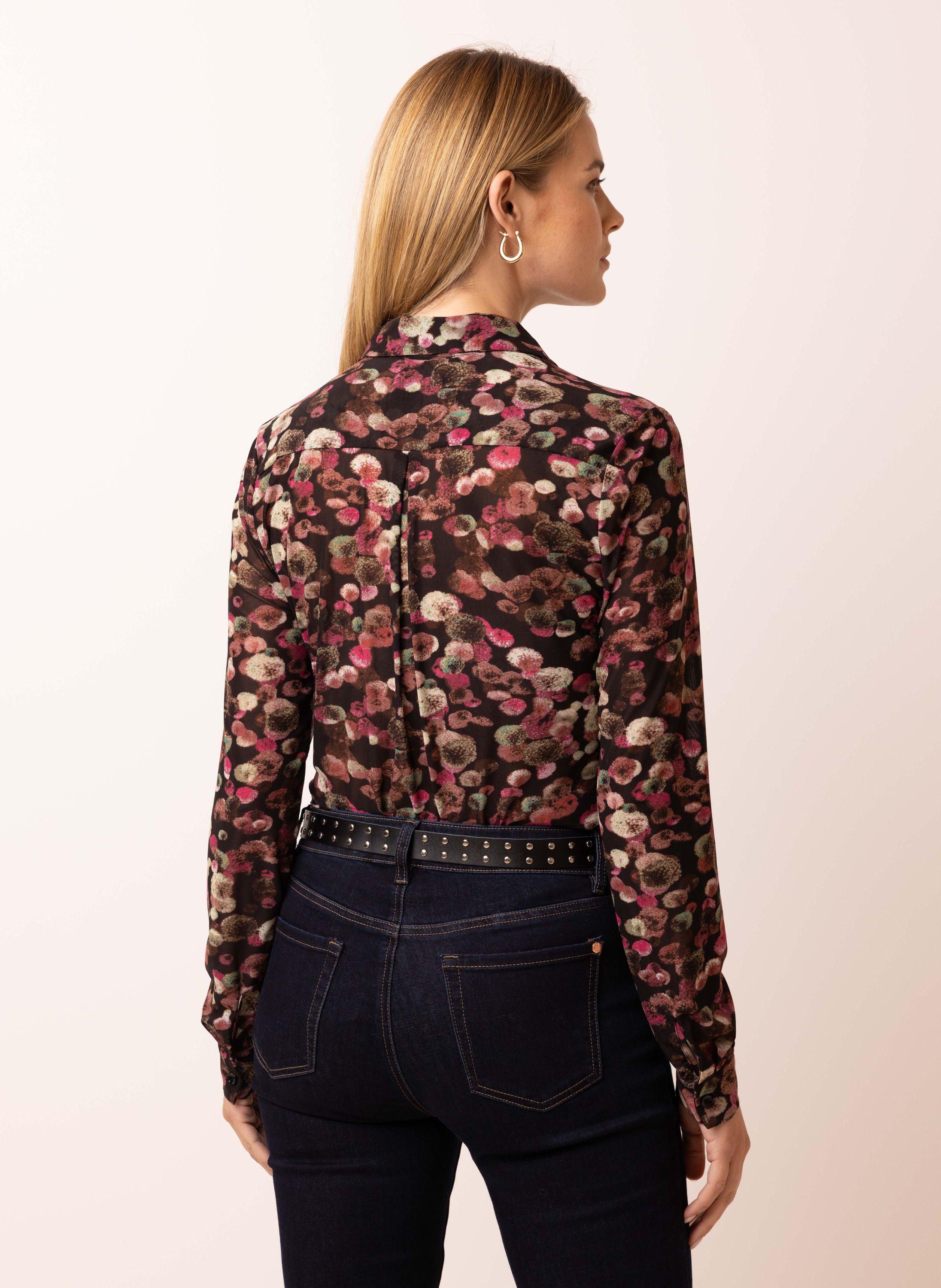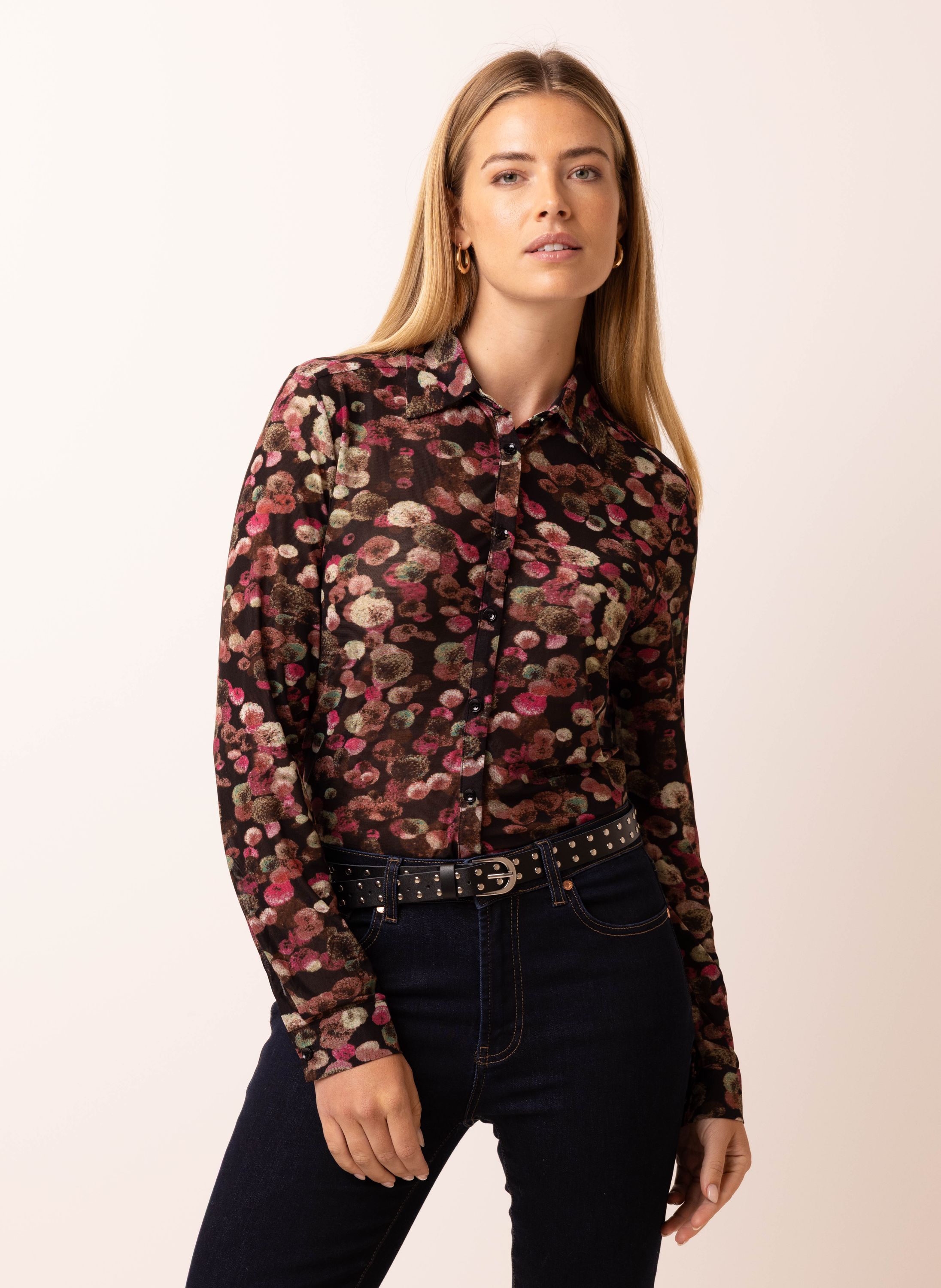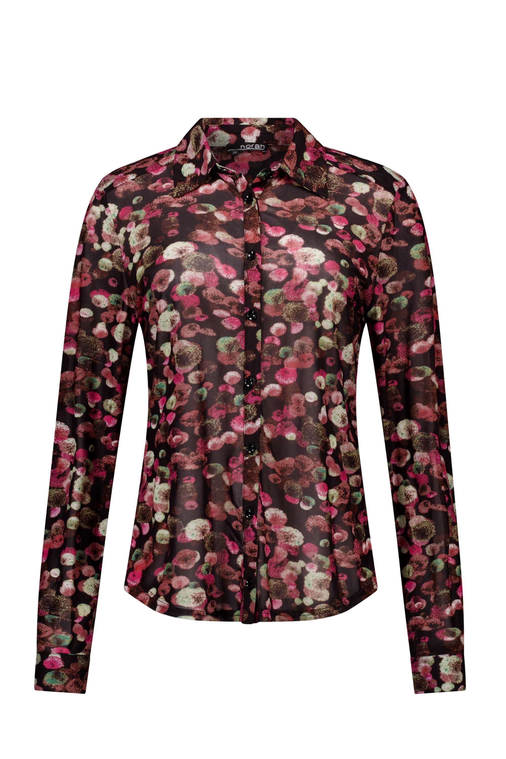 Deze blouse met klassieke kraag, knoopsluiting en lange mouwen is uitgevoerd in een transparante stof met een kleurrijke bloemenprint. De blouse schijnt licht door. We adviseren je er een Marianne top onder te dragen.