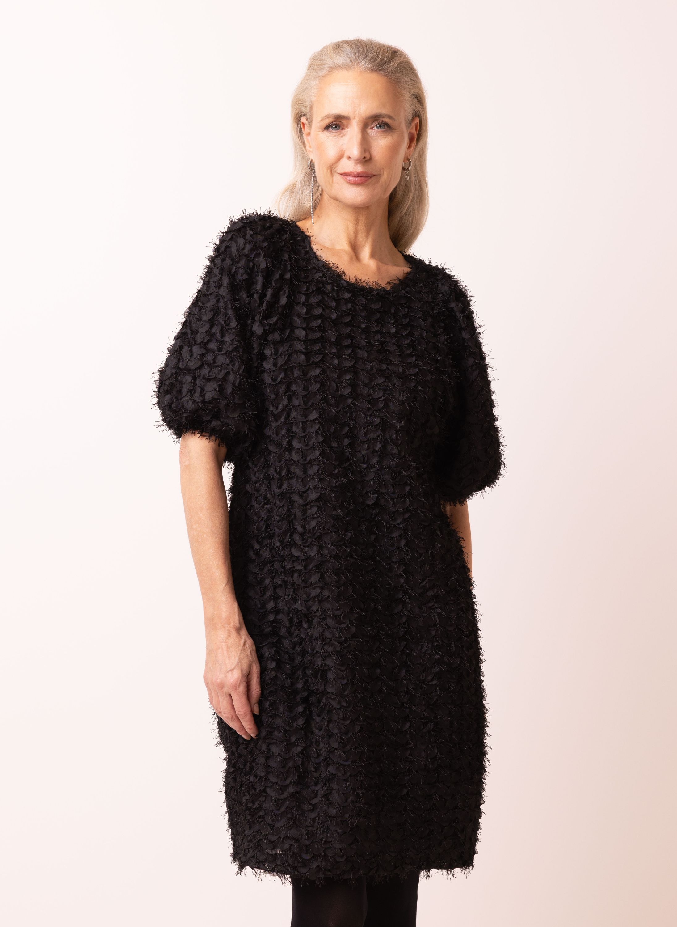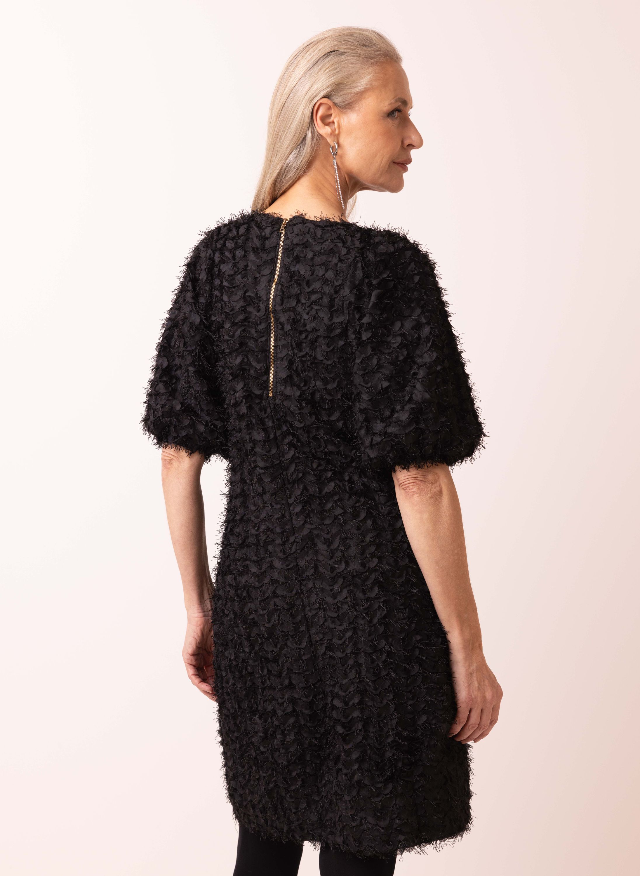 Deze midi-jurk met ronde hals, goudkleurige ritssluiting aan de achterzijde en halflange pofmouwen is elegant en tijdloos.
