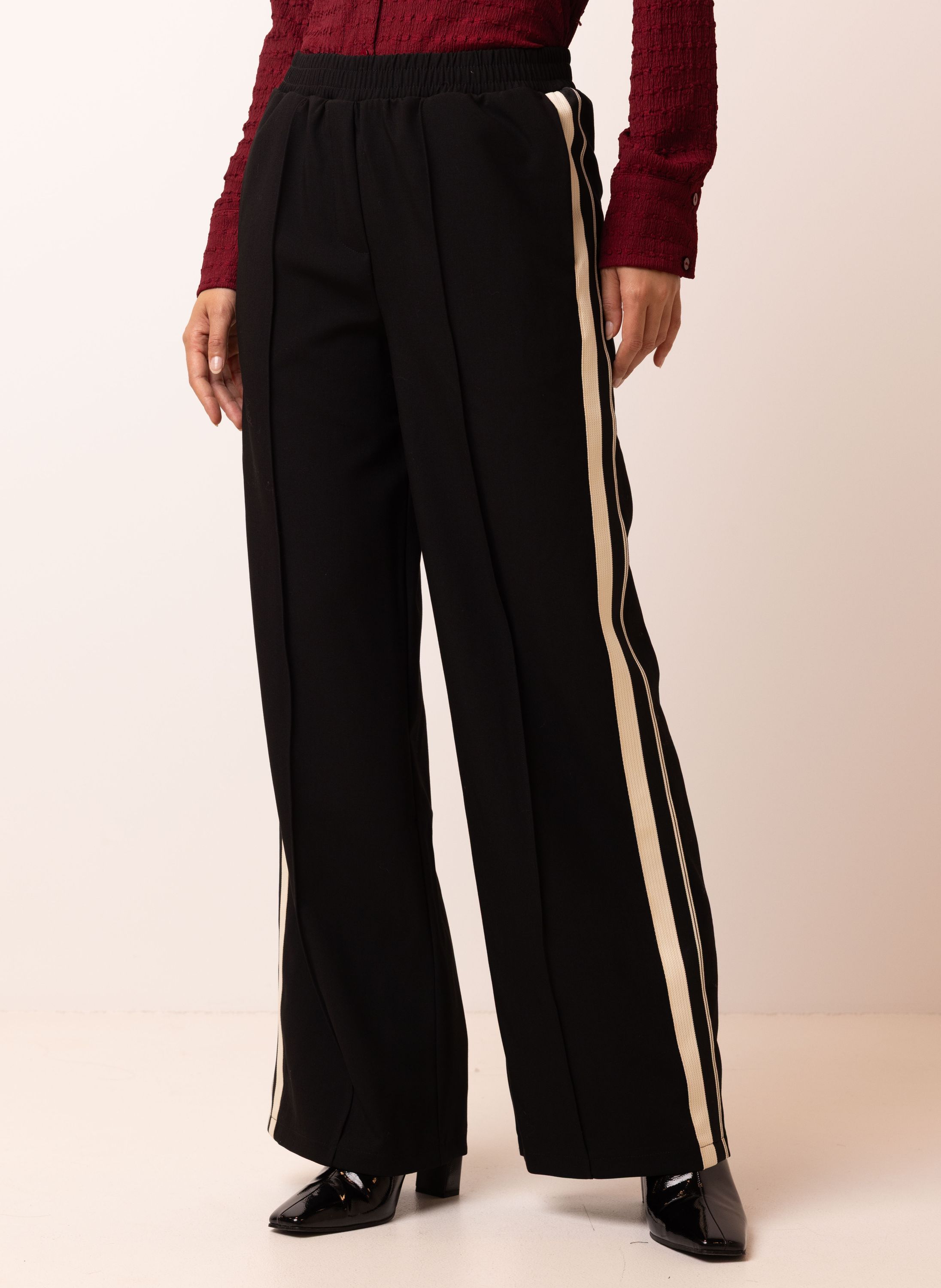 Deze high waist straight fit broek heeft een elastische tailleband en steekzakken, met een naad aan de voorzijde en een bies langs beide zijdes.
