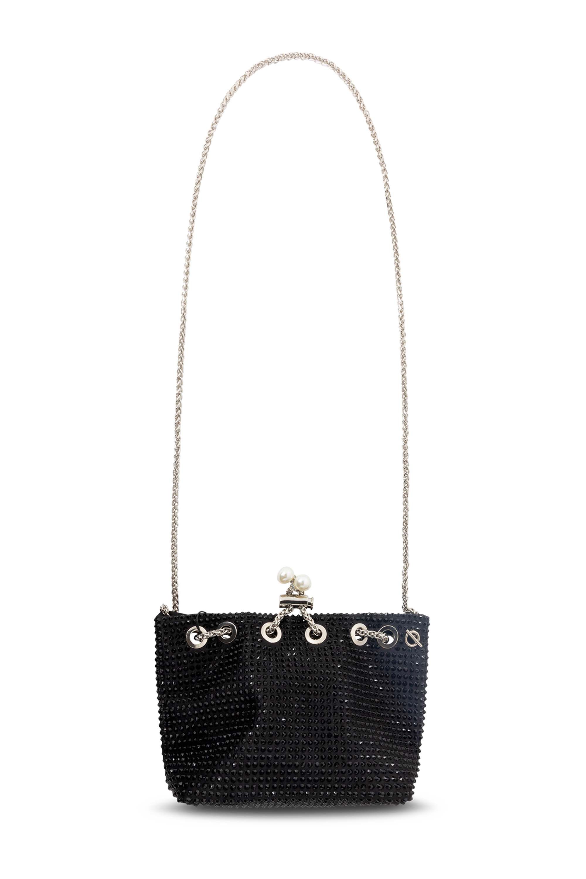 Dit feestelijke tasje met zilverkleurig hengsel is versierd met glinstersteentjes en een pareldetail aan de sluiting. Het binnenvakje met ritssluiting maakt het item extra praktisch.