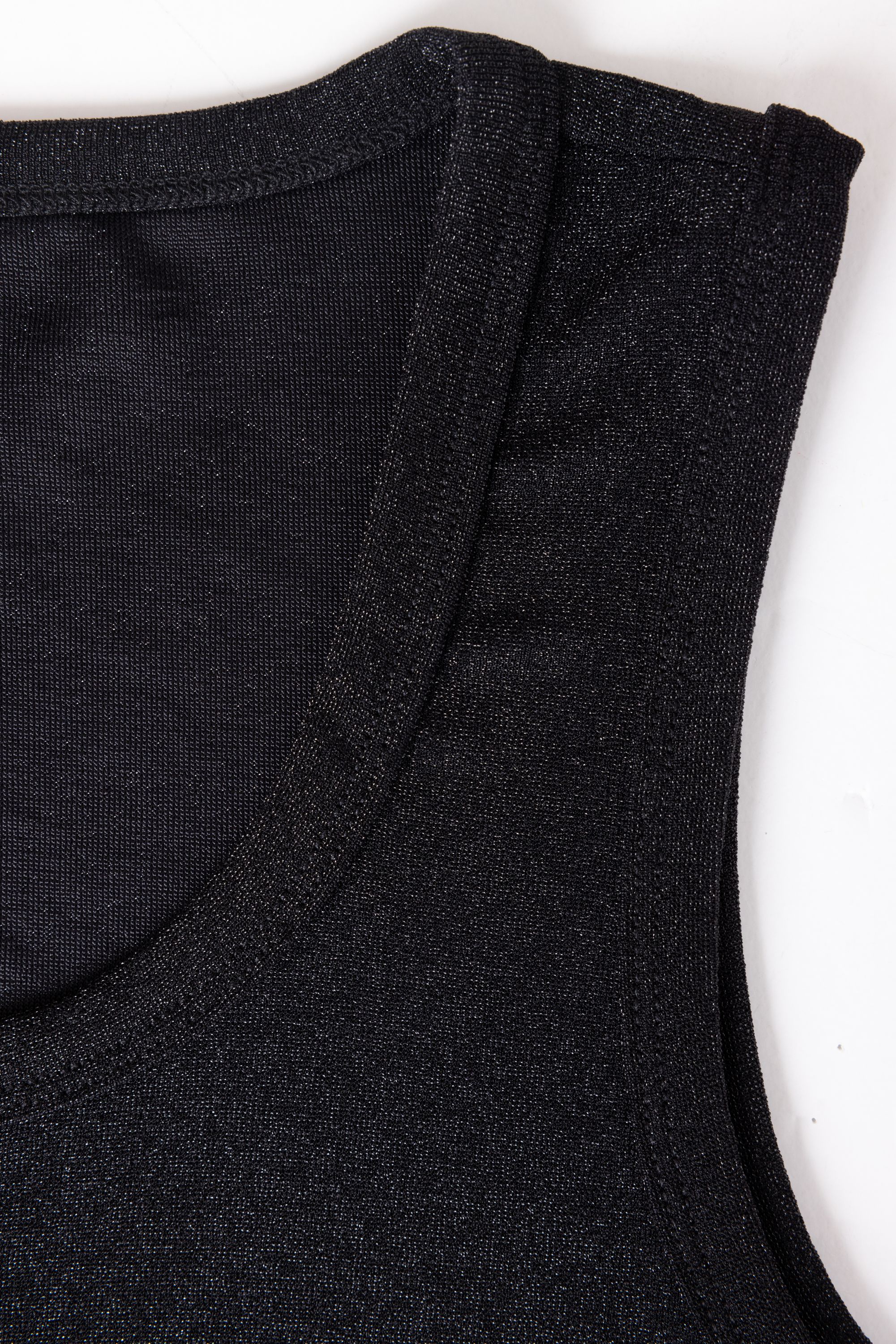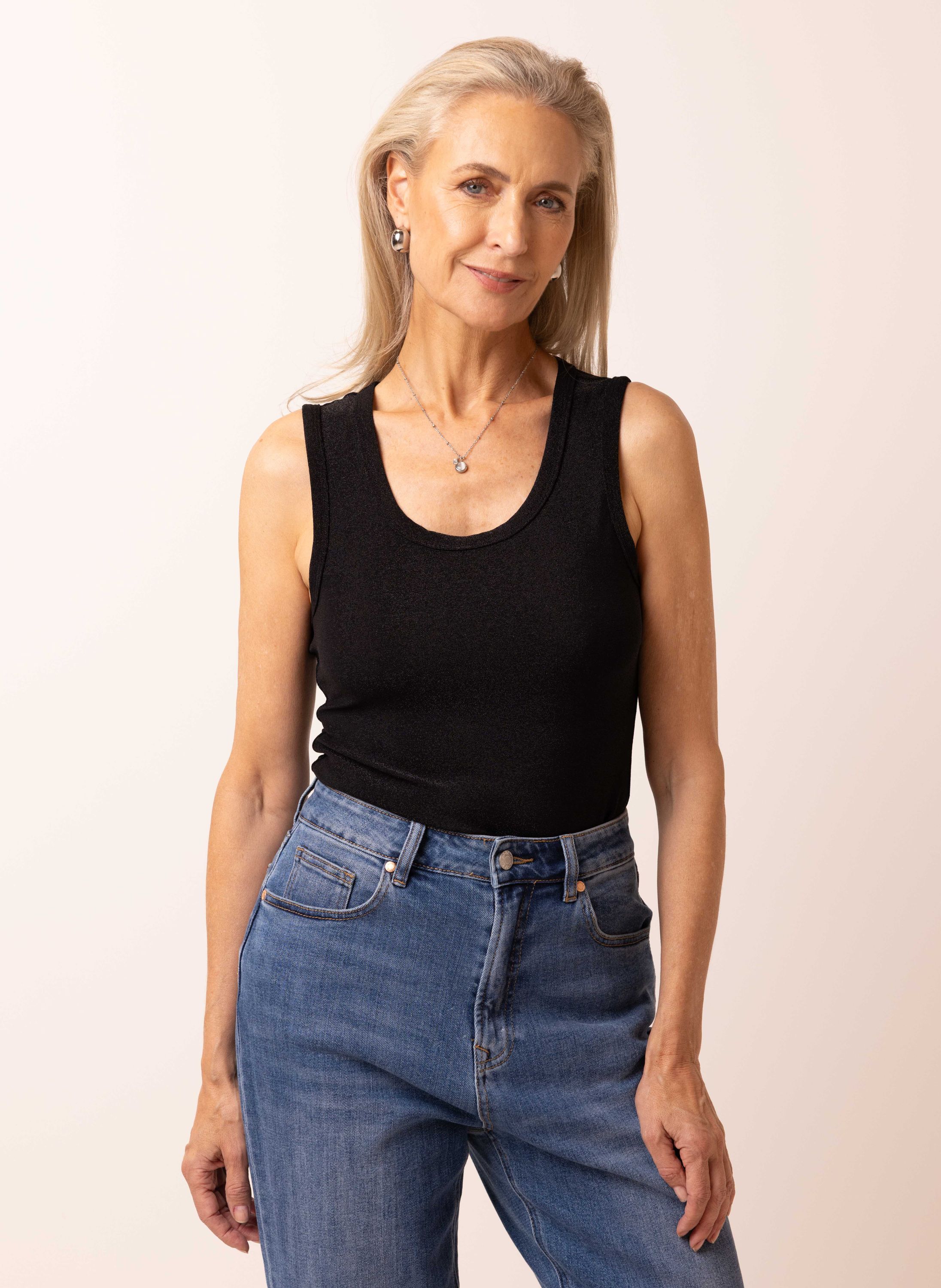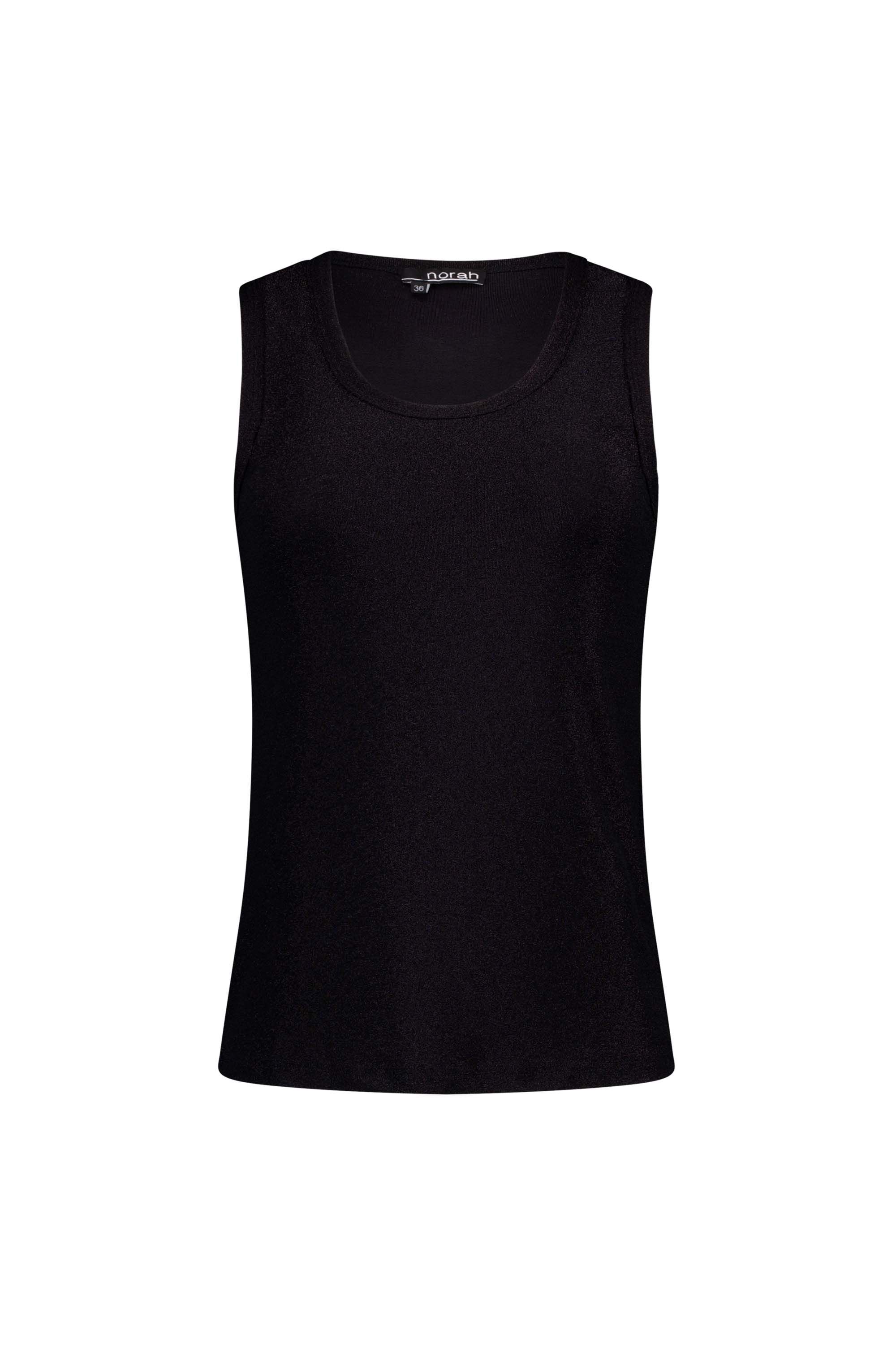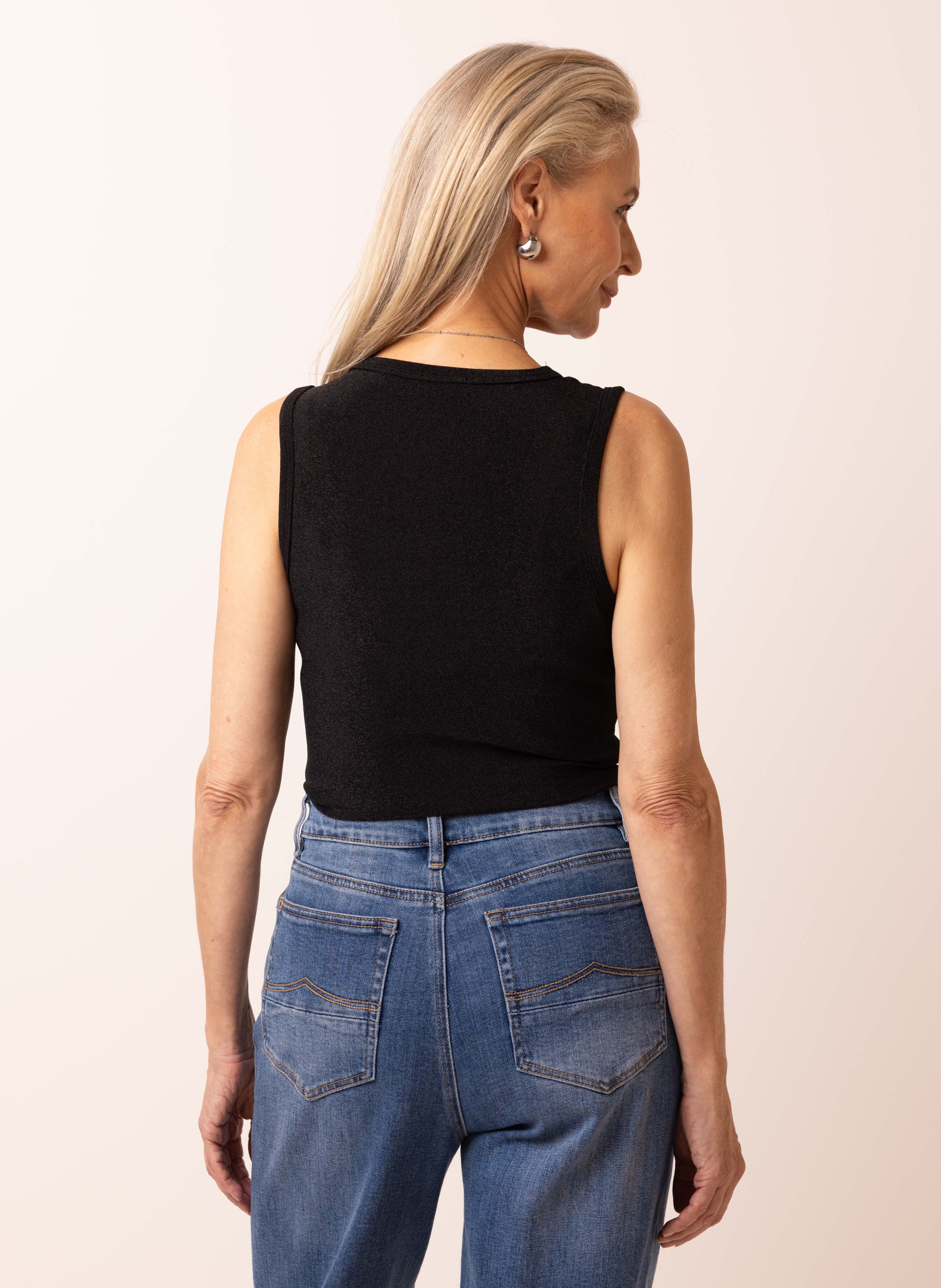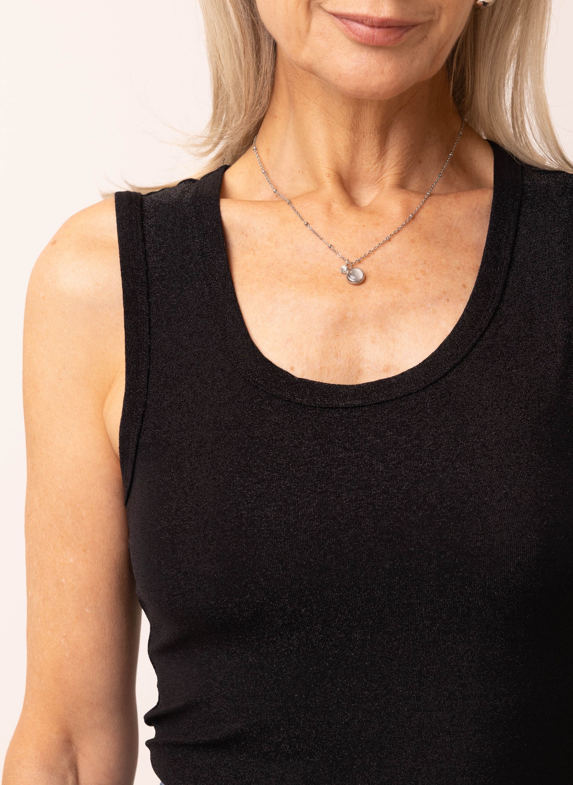 Deze mouwloze top met ronde hals is uitgevoerd in een stof met zilverkleurige glans.