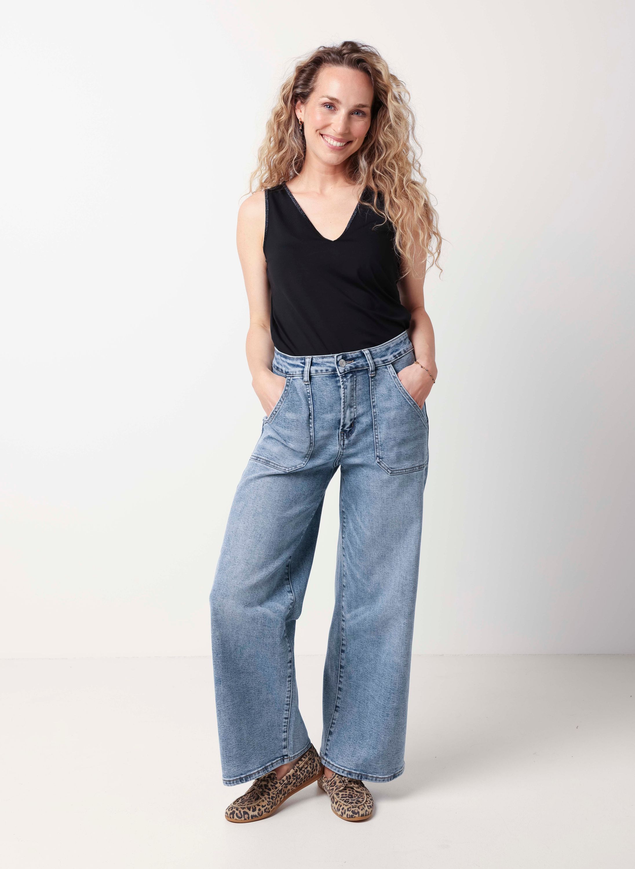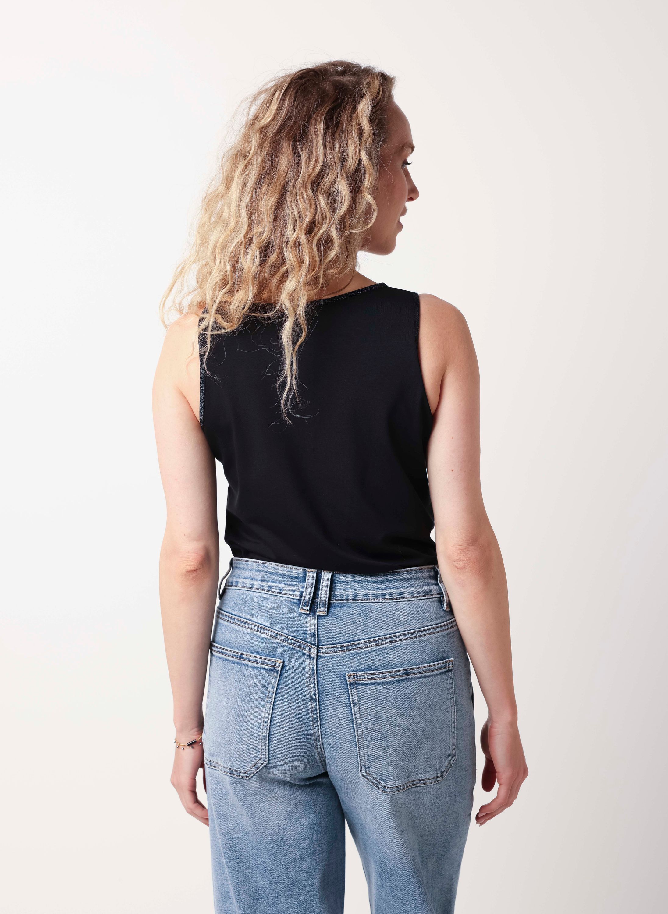 Deze mouwloze top met V-hals heeft een comfortabele pasvorm.