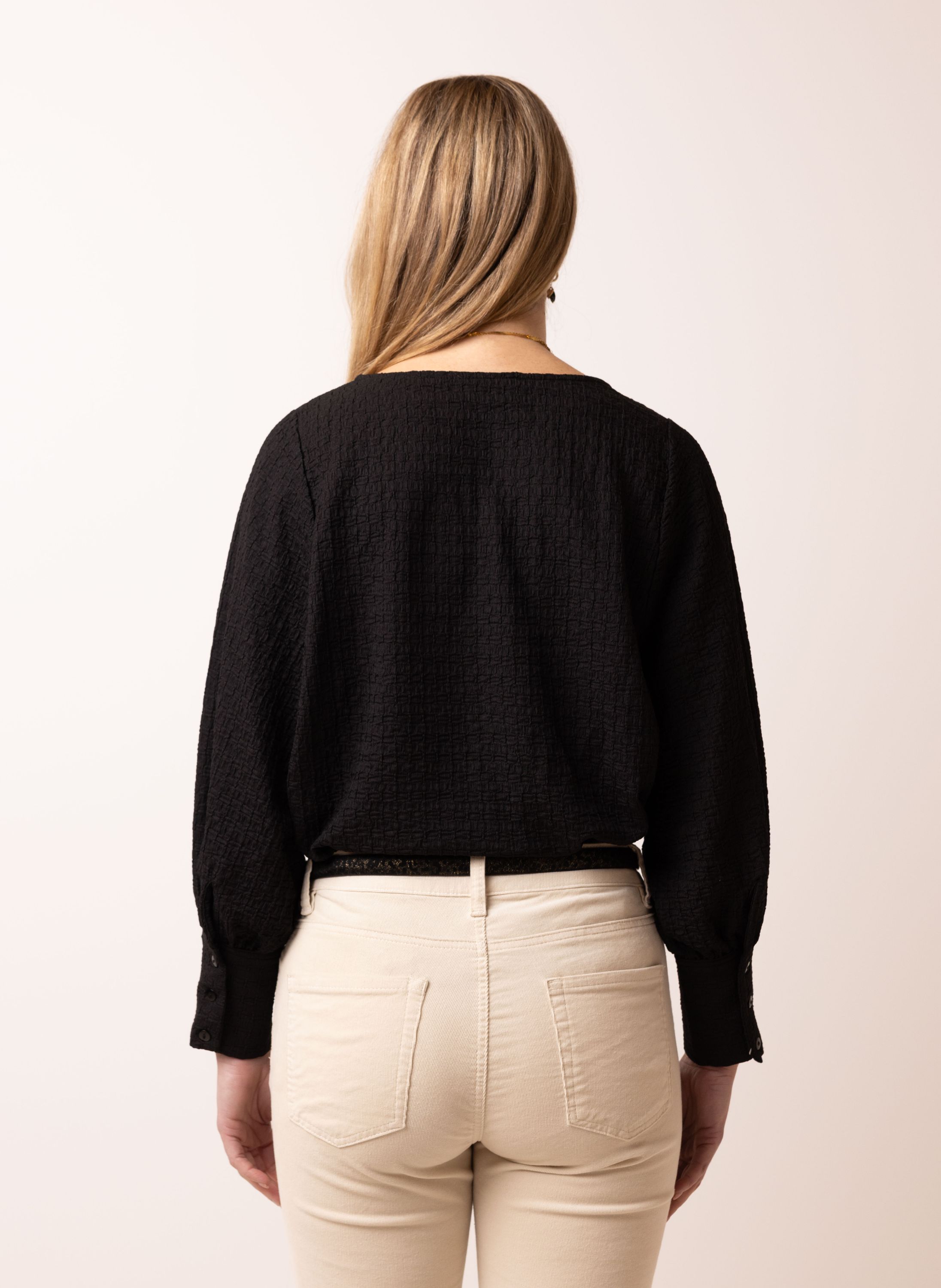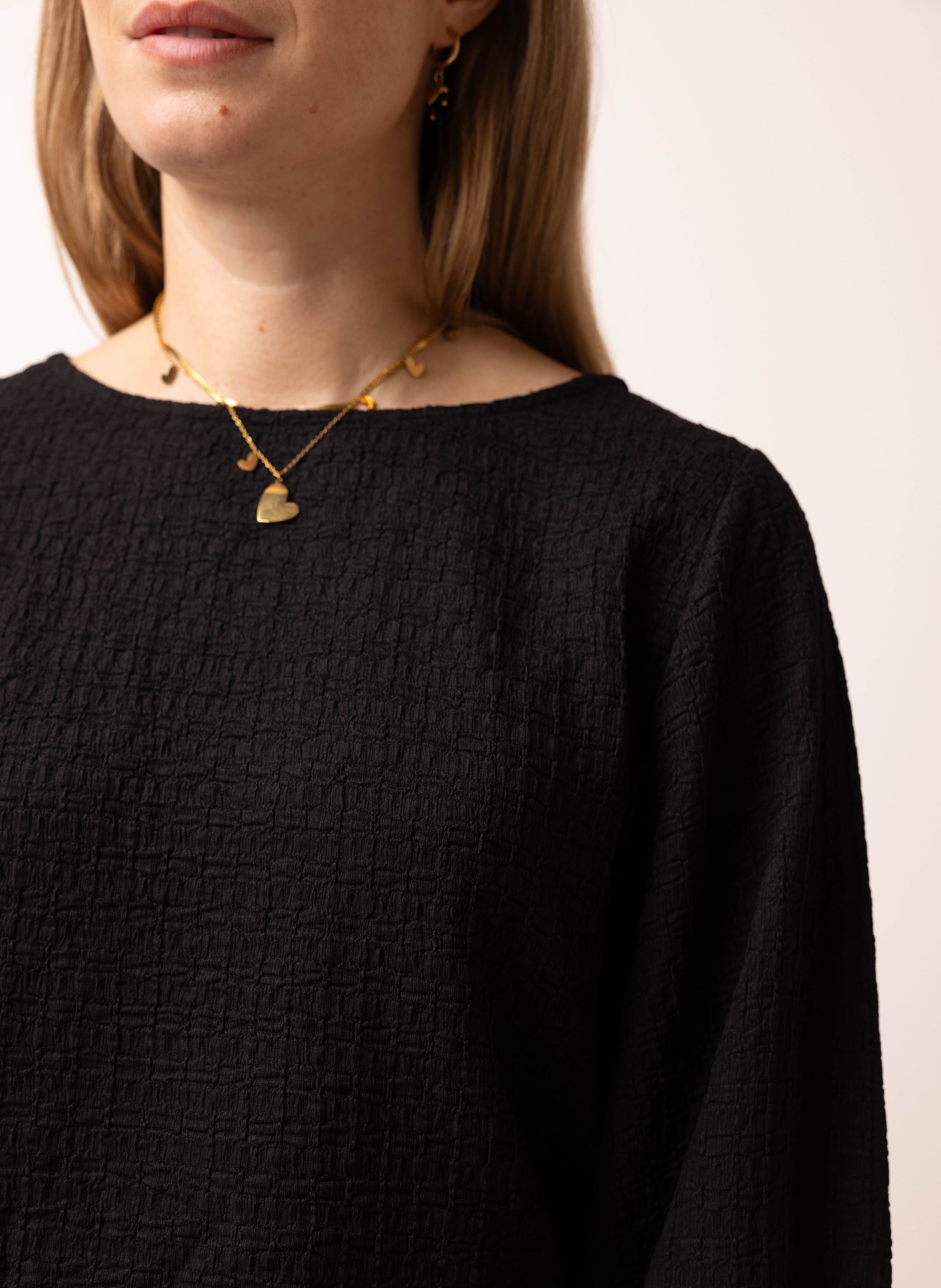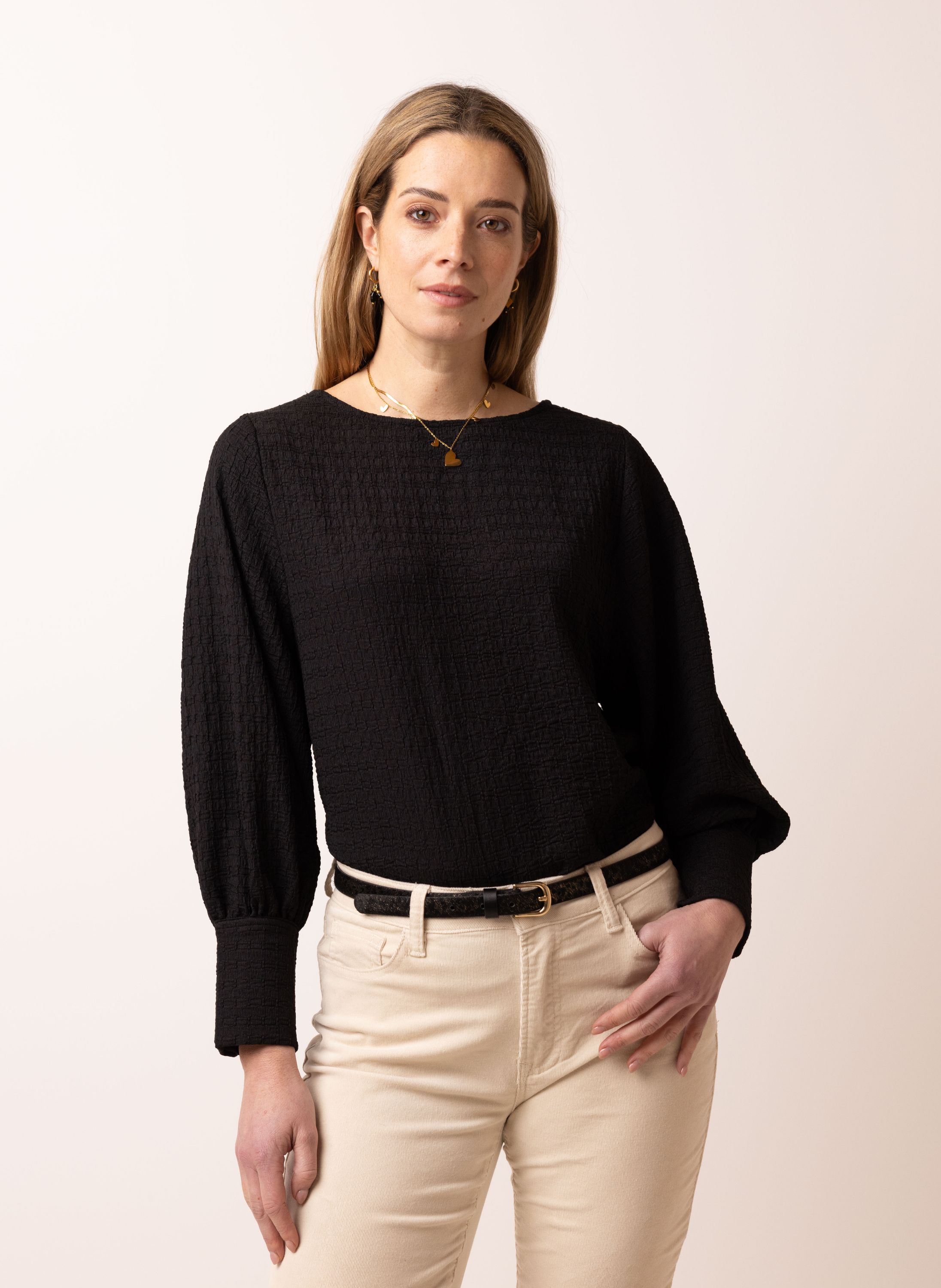 Deze soepelvallende top met ronde hals heeft lange mouwen met een manchet.